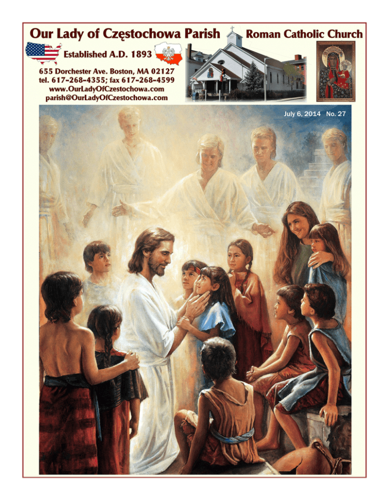 July 6, 2014 No. 27 BIURO PARAFIALNE / PARISH OFFICE Tel: 617-268-4355; Fax: 617-268-4599 Monday - Thursday Friday 10:00 am - 4:00 pm 8:00 am - 1:00 pm Saturday: 10:00 am - 12:00 pm Evenings and weekends - by appointment only. PORZĄDEK MSZY ŚWIĘTYCH MASS SCHEDULE Mon. - Thurs. 7:00 am (English) 8:00 am (Polish) Friday 7:00 am (English) 6:00 pm - 7:00 pm - Adoracja Najśw. Sakr. - Koronka Spowiedź - Adoration, Divine Mercy Chaplet, Confession 7:00 pm (Polish) Saturday 8:00 am (Polish) 4:00 pm (English) 7:00 pm (Polish) Sunday 8:00 am (Polish) 9:30 am (English) 11:00 am (Polish) Holydays - as announced SPOWIEDŹ / CONFESSIONS Friday 6:00 pm and every day 30 min. before Masses. CHRZEST / BAPTISM By arrangement with the priest. Instruction for parents and godparents is required. SAKRAMENT MAŁŻEŃSTWA / MARRIAGE Please, make arrangement with the Rectory at least six months in advance. Instruction is required. PASTORAL STAFF - FRANCISCAN FRIARS OJCOWIE FRANCISZKANIE (OFM Conv.) Fr. Jan Łempicki OFMConv. - Pastor Fr. Wiesław Ciemięga OFMConv. - Vicar Fr. Janusz Chmielecki OFMConv. - in residence Fr. Aloysius Minyong Hong OFMConv. - in residence PRACOWNICY PARAFII / OFFICE STAFF Secretary & Religious Education Coordinator - Mrs. Iwona Gajczak Bookkeeper & Office Assistant - Ms. Connie Bielawski RADA PARAFIALNA / PARISH COUNCIL Mr. Szymon Biegański, Mr. Grzegorz Boryczka, Mr. Eugeniusz Bramowski, Mr. Czesław Kilian, Mr. Jan Kozak, Ms. Maryann Sadowski, Mr. Zbigniew Saletnik, Ms. Danuta Urbaniak, Mrs. Lucy Willis, Mrs. Władzia Wygonowska RADA FINANSOWA / FINANCE COUNCIL Ms. Constance Bielawski, Mr. Grzegorz Boryczka, Mr. Maks Gradziuk, Mr. Rafał Jabłonka, Mr. Richard Rolak, Mr. Wiesław Wierzbowski SŁUŻBA MUZYCZNA / MUSIC MINISTRY Organist & Psalmist: Mrs. Marta Saletnik ZAKRYSTIA/SACRISTAN – KWIATY/FLOWERS Mrs. Beata Kozak & Mrs. Renata Marshall BOSTON CATHOLIC DIRECTORY 2014 W zakrystii i w biurze parafialnym można nabyć Boston Catholic Directory 2014 - Szczegółowy wykaz wszystkich instytucji katolickich, urzędów kurii arcybiskupiej, wszystkich parafii, kapłanów, sióstr zakonnych, pracowników kościelnych itd. Księga ta zawiera także wiele innych użytecznych informacji. Cena książki - $25. SAKRAMENT CHORYCH/SACRAMENT OF THE SICK Parishioners who are seriously ill should call the Rectory to arrange for a priest to visit and administer the Sacraments. ACTIVITIES & ORGANIZATIONS Sala św. Jana Pawła II — St. John Paul II Hall Kontakt w sprawie wynajmu sali: tel: 617-268-4355 Contact for renting the hall: tel: 617-268-4355 Ministranci / Altar Servers - Eugeniusz Bramowski Spotkania w niedziele, sala J.P II,10:00 am (781-871-2991) Fundacja Kultury Polskiej - Polish Cultural Foundation, Inc. - Mr. Andrzej Pronczuk - tel. 617-859-9910 Polska Szkoła Sobotnia - Polish Saturday School - Mr. Jan Kozak - tel. 617-464-2485 Chór Parafialny i Chórek Dziecięcy Promyki Jana Pawła II Parish Choir & Children Choir - Mrs. Marta Saletnik, tel. 617-265-8132 Stowarzyszenie Weteranów Armii Polskiej - SWAP #37 Mr. Wincenty Wiktorowski - tel. 617-288-1649 Grupa AA - Sala pod kościołem. Spotkania odbywają się w każdy czwartek o godz. 7:00 pm 2 Krakowiak - Wednesdays at 7:30 pm - John Paul II hall www.krakowiak.org,: Eric Pierce: Tel. 508-320-2344 Żywy Różaniec / Rosary Society - Mrs. Genowefa Lisek tel. 617-436-5779 Siostry Matki Bożej Miłosierdzia Sisters of Our Lady of Mercy: tel. 617-288-1202 Polski Amatorski Teatr w Bostonie / Polish Theater - Mrs. Małgorzata Tutko: tel. 617-325-2208 Harcerze / Polish Scouts - The meetings will be conducted in Polish for young boys and girls. Contact information: Mateusz Wozny, tel. 347-749-5867, email: [email protected] Klub Polski Polish American Citizens Club - Mr. Christopher Lisek Club: 617-436-2786; Cell: 617-436-2686 MASS INTENTIONS - INTENCJE MSZALNE 14th Sunday in Ordinary Time A community work project took place on a hot and humid morning. College students helped younger students, keeping a watchful eye on them as they were picking up trash, painting playground furniture and hanging new signs. Halfway through the morning, everyone headed for the shade of a weeping willow tree and a drink of ice -cold spring water. It really was refreshing. The shade and the water revived us and we were ready to finish our work. Everyone had a good time and contributed to our success. Jesus never said that life would be easier because we believe. He only promised that He would be with us always. In our work and struggle, He is always near, giving us purpose and hope as we join our work to His as a prayer and an offering to the Father. We never struggle in vain, for even our smallest efforts join us to heavenly powers. Our work may be difficult and tiresome, but the Lord is always watching over us. He makes sure we have the strength and the rest we need to complete our mission. His love never fails. We are certain of success because, in everything we do, we are building the Kingdom of God. Scripture for the week of July 6, 2014 6 7 8 9 10 11 12 13 SUN Zec 9:9-10/Rom 8:9, 11-13 Mt 11:25-30 Mon Hos 2:16, 17b-18, 21-22 Mt 9:18-26 Tue Hos 8:4-7, 11-13/Mt 9:32-38 Wed Hos 10:1-3, 7-8, 12/Mt 10:1-7 Thu Hos 11:1-4, 8c-9/Mt 10:7-15 Fri Hos 14:2-10/Mt 10:16-23 Sat Is 6:1-8/Mt 10:24-33 SUN Is 55:10-11/Rom 8:18-23 Mt 13:1-23 or 13:1-9 Saturday, July 5, 2014 8:00 am † Bronisław Bućko — Znajoma Krystyna Olszewska 4:00 pm † Józefa Ostrowska — Family 7:00 pm † Ireneusz Rogowski — Syn Sylwester 14th SUNDAY, July 6, 2014 - 14. NIEDZIELA ZWYKŁA 8:00 am † Zofia Chlastawa (roczn.) — Syn 9:30 am - FOR OUR PARISHIONERS — ZA PARAFIAN 11:00 am † Z rodzin: Cholewiński, Wolk i DiSarro — Jerzy Cholewiński Monday, July 7, 2014 7:00 am † Siegfried J. Frank — Rolak Family 8:00 am † Ruby i Joseph Jankowski — Evelyn Rolak z rodziną Tuesday, July 8, 2014 - św. Jana z Dukli 7:00 am 8:00 am † Czesława Krawczyk — Kazimiera Śmierzchals