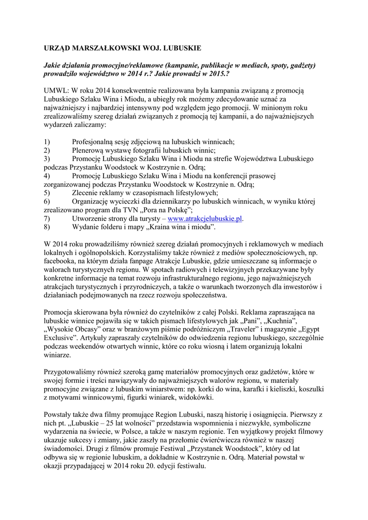 URZĄD MARSZAŁKOWSKI WOJ. LUBUSKIE Jakie działania promocyjne/reklamowe (kampanie, publikacje w mediach, spoty, gadżety) prowadziło województwo w 2014 r.? Jakie prowadzi w 2015.? UMWL: W roku 2014 konsekwentnie realizowana była kampania związaną z promocją Lubuskiego Szlaku Wina i Miodu, a ubiegły rok możemy zdecydowanie uznać za najważniejszy i najbardziej intensywny pod względem jego promocji. W minionym roku zrealizowaliśmy szereg działań związanych z promocją tej kampanii, a do najważniejszych wydarzeń zaliczamy: 1) Profesjonalną sesję zdjęciową na lubuskich winnicach; 2) Plenerową wystawę fotografii lubuskich winnic; 3) Promocję Lubuskiego Szlaku Wina i Miodu na strefie Województwa Lubuskiego podczas Przystanku Woodstock w Kostrzynie n. Odrą; 4) Promocję Lubuskiego Szlaku Wina i Miodu na konferencji prasowej zorganizowanej podczas Przystanku Woodstock w Kostrzynie n. Odrą; 5) Zlecenie reklamy w czasopismach lifestylowych; 6) Organizację wycieczki dla dziennikarzy po lubuskich winnicach, w wyniku której zrealizowano program dla TVN „Pora na Polskę”; 7) Utworzenie strony dla turysty – www.atrakcjelubuskie.pl. 8) Wydanie folderu i mapy „Kraina wina i miodu”. W 2014 roku prowadziliśmy również szereg działań promocyjnych i reklamowych w mediach lokalnych i ogólnopolskich. Korzystaliśmy także również z mediów społecznościowych, np. facebooka, na którym działa fanpage Atrakcje Lubuskie, gdzie umieszczane są informacje o walorach turystycznych regionu. W spotach radiowych i telewizyjnych przekazywane były konkretne informacje na temat rozwoju infrastrukturalnego regionu, jego najważniejszych atrakcjach turystycznych i przyrodniczych, a także o warunkach tworzonych dla inwestorów i działaniach podejmowanych na rzecz rozwoju społeczeństwa. Promocja skierowana była również do czytelników z całej Polski. Reklama zapraszająca na lubuskie winnice pojawiła się w takich pismach lifestylowych jak „Pani”, „Kuchnia”, „Wysokie Obcasy” oraz w branżowym piśmie podróżniczym „Traveler” i magazynie „Egypt Exclusive”. Artykuły zapraszały czytelników do odwiedzenia regionu lubuskiego, szczególnie podczas weekendów otwartych winnic, które co roku wiosną i latem organizują lokalni winiarze. Przygotowaliśmy również szeroką gamę materiałów promocyjnych oraz gadżetów, które w swojej formie i treści nawiązywały do najważniejszych walorów regionu, w materiały promocyjne związane z lubuskim winiarstwem: np. korki do wina, karafki i kieliszki, koszulki z motywami winnicowymi, figurki winiarek, widokówki. Powstały także dwa filmy promujące Region Lubuski, naszą historię i osiągnięcia. Pierwszy z nich pt. „Lubuskie – 25 lat wolności” przedstawia wspomnienia i niezwykłe, symboliczne wydarzenia na świecie, w Polsce, a także w naszym regionie. Ten wyjątkowy projekt filmowy ukazuje sukcesy i zmiany, jakie zaszły na przełomie ćwierćwiecza również w naszej świadomości. Drugi z filmów promuje Festiwal „Przystanek Woodstock”, który od lat odbywa się w regionie lubuskim, a dokładnie w Kostrzynie n. Odrą. Materiał powstał w okazji przypadającej w 2014 roku 20. edycji festiwalu. Urząd Marszałkowski Województwa Lubuskiego był jako co roku organizatorem Dni Województwa Lubuskiego. W 2014 roku odbyły się one w Zielonej Górze i trwały trzy dni. Podczas ostatniego weekendu czerwcowego, można było posłuchać koncertów, degustować potrawy regionalne, czy odwiedzić kawiarenkę filmową. Zgodnie z założeniami Planu Promocji, w roku 2015 realizujemy cztery kampanie promocyjne: • Kampanię związaną z promocją Lubuskiego Szlaku Wina i Miodu oraz lubuskiego pszczelarstwa; • Kampanię promocyjną Lubuskich Parków Krajobrazowych z okazji obchodów 200. rocznicy założenia Parku Mużakowskiego; • Kampanię promocyjną lubuskiego szlaku fortyfikacji; • Kampanię promocyjną festiwali muzycznych i filmowych. W ramach każdej z kampanii realizujemy zadania związane z promocją naszego województwa - najbardziej otwartego i tolerancyjnego regionu w Polsce. Zapraszamy turystów do „zielonej krainy nowoczesnych technologii”, który smakuje winem, miodem, tradycją i przeszłością. Mamy niezwykłą florę i faunę, niezwykłe parki krajobrazowe wraz z ich dorobkiem kulturowym i historycznym. Ostatnio zleciliśmy w ramach kampanii promocyjnej wykonanie profesjonalnej sesji zdjęciowej wybranych parków krajobrazowych wraz z albumem. Angażujemy się również w obchody 200-lecia Parku Mużakowskiego. W bieżącym roku popularyzujemy również województwo jako region bogaty w fortyfikacje, militaria, miejsca historyczne, będące atrakcyjnymi dla turystów, szczególnie dla miłośników historii. Na zlecenie urzędu powstaje film o lubuskim szlaku fortyfikacji. Przygotowujemy się również do wystawy outdoorowej wybranych motywów lubuskiego szlaku fortyfikacji. Stanie ona m.in. na lubuskiej strefie podczas „Przystanku Woodstock” w Kostrzynie n. Odrą. Tradycyjnie już województwo lubuskie promuje się poprzez wydarzenia muzyczne i filmowe, przyciągające do naszego regionu rzesze turystów, takie jak: Lubuskie Lato Filmowe, Muzyka w Raju, Quest Europe, a przede wszystkim „Przystanek Woodstock”, który co roku gromadzi setki tysięcy ludzi. Które działania skierowane były do turystów, które do inwestorów czy innych grup? - Do turystów skierowane były przede wszystkim działania popularyzujące sztandarowy produkt turystyczny regionu, czyli Lubuski Szlak Wina i Miodu. Stąd reklama w czasopismach, czy organizowane przez samych winiarzy „Weekendy otwartych winnic”, które co roku przyciągają na lubuskie winnice rzesze turystów. Ogromnie ważna jest nasza obecność na Przystanku Woodtock, który odbywa się w Kostrzynie n. Odrą. To wielkie medialne i organizacyjne przedsięwzięcie przyciąga turystów nie tylko z całej Polski, al