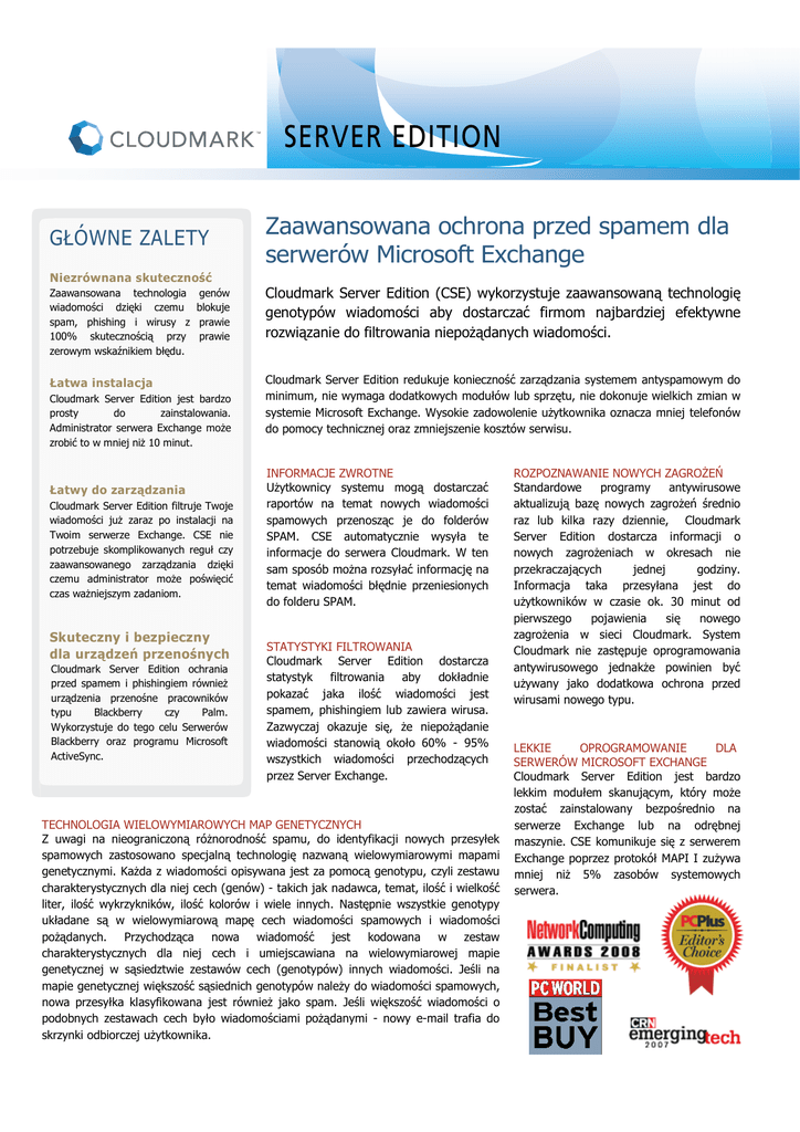 SERVER EDITION GŁÓWNE ZALETY Zaawansowana ochrona przed spamem dla serwerów Microsoft Exchange Niezrównana skuteczność Zaawansowana technologia wiadomości dzięki czemu spam, phishing i wirusy z 100% skutecznością przy zerowym wskaźnikiem błędu. genów blokuje prawie prawie Łatwa instalacja Cloudmark Server Edition jest bardzo prosty do zainstalowania. Administrator serwera Exchange moŜe zrobić to w mniej niŜ 10 minut. Łatwy do zarządzania Cloudmark Server Edition filtruje Twoje wiadomości juŜ zaraz po instalacji na Twoim serwerze Exchange. CSE nie potrzebuje skomplikowanych reguł czy zaawansowanego zarządzania dzięki czemu administrator moŜe poświęcić czas waŜniejszym zadaniom. Skuteczny i bezpieczny dla urządzeń przenośnych Cloudmark Server Edition ochrania przed spamem i phishingiem równieŜ urządzenia przenośne pracowników typu Blackberry czy Palm. Wykorzystuje do tego celu Serwerów Blackberry oraz programu Microsoft ActiveSync. Cloudmark Server Edition (CSE) wykorzystuje zaawansowaną technologię genotypów wiadomości aby dostarczać firmom najbardziej efektywne rozwiązanie do filtrowania niepoŜądanych wiadomości. Cloudmark Server Edition redukuje konieczność zarządzania systemem antyspamowym do minimum, nie wymaga dodatkowych modułów lub sprzętu, nie dokonuje wielkich zmian w systemie Microsoft Exchange. Wysokie zadowolenie uŜytkownika oznacza mniej telefonów do pomocy technicznej oraz zmniejszenie kosztów serwisu. INFORMACJE ZWROTNE UŜytkownicy systemu mogą dostarczać raportów na temat nowych wiadomości spamowych przenosząc je do folderów SPAM. CSE automatycznie wysyła te informacje do serwera Cloudmark. W ten sam sposób moŜna rozsyłać informację na temat wiadomości błędnie przeniesionych do folderu SPAM. STATYSTYKI FILTROWANIA Cloudmark Server Edition dostarcza statystyk filtrowania aby dokładnie pokazać jaka ilość wiadomości jest spamem, phishingiem lub zawiera wirusa. Zazwyczaj okazuje się, Ŝe niepoŜądanie wiadomości stanowią około 60% - 95% wszystkich wiadomości przechodzących przez Server Exchange. TECHNOLOGIA WIELOWYMIAROWYCH MAP GENETYCZNYCH Z uwagi na nieograniczoną róŜnorodność spamu, do identyfikacji nowych przesyłek spamowych zastosowano specjalną technologię nazwaną wielowymiarowymi mapami genetycznymi. KaŜda z wiadomości opisywana jest za pomocą genotypu, czyli zestawu charakterystycznych dla niej cech (genów) - takich jak nadawca, temat, ilość i wielkość liter, ilość wykrzykników, ilość kolorów i wiele innych. Następnie wszystkie genotypy układane są w wielowymiarową mapę cech wiadomości spamowych i wiadomości poŜądanych. Przychodząca nowa wiadomość jest kodowana w zestaw charakterystycznych dla niej cech i umiejscawiana na wielowymiarowej mapie genetycznej w sąsiedztwie zestawów cech (genotypów) innych wiadomości. Jeśli na mapie genetycznej większość sąsiednich genotypów naleŜy do wiadomości spamowych, nowa przesyłka klasyfikowana jest równieŜ jako spam. Jeśli większość wiadomości o podobnych zestawach cech było wiadomościami poŜądanymi - nowy e-mail trafia do skrzynki odbiorczej uŜytkownika. ROZPOZNAWANIE NOWYCH ZAGROśEŃ Standardowe programy antywirusowe aktualizują bazę nowych zagroŜeń średnio raz lub kilka razy dziennie, Cloudmark Server Edition dostarcza informacji o nowych zagroŜeniach w okresach nie przekraczających jednej godziny. Informacja taka przesyłana jest do uŜytkowników w czasie ok. 30 minut od pierwszego pojawienia się nowego zagroŜenia w sieci Cloudmark. System Cloudmark nie zastępuje oprogramowania antywirusowego jednakŜe powinien być uŜywany jako dodatkowa ochrona przed wirusami nowego typu. LEKKIE OPROGRAMOWANIE DLA SERWERÓW MICROSOFT EXCHANGE Cloudmark Server Edition jest bardzo lekkim modułem skanującym, który moŜe zostać zainstalowany bezpośrednio na serwerze Exchange lub na odrębnej maszynie. CSE komunikuje się z serwerem Exchange poprzez protokół MAPI I zuŜywa mniej niŜ 5% zasobów systemowych serwera. SERVER EDITION Wymagania minimalne Cloudmark Server Procesor Intel Pentium lub kompatybilny 733 Mhz lub szybszy Pamięć 256 MB pamięci RAM zalecane 512 MB System operacyjny Microsoft Windows 2000 Server Microsoft Windows Server 2003 Microsoft Windows SBS 2000/2003 Serwer pocztowy Microsoft Exchange Server 2000 Microsoft Exchange Server 2003 Microsoft Exchange Server 2007 Dysk twardy 20 MB wolnego miejsca na dysku gdzie zainstalujesz CSE 200 MB wolnego miejsca na dysku systemowym Konsola administracyjna procesor Intel Pentium lub kompatybilny 733 Mhz lub szybszy Pamięć 128 MB pamięci RAM System operacyjny Microsoft Windows Microsoft Windows professional Microsoft Windows Microsoft Windows 2003 2000 Server XP Server 2003 SBS 200 lub Dysk twardy 5 MB wolnego miejsca na dysku gdzie zainstalujesz konsolę administracyjną CSE JAK TO DZIAŁA ? 1. Wiadomość jest odbierana przez serwer Microsoft Exchange 2. Cloudmark Server Edition poprzez protokół MAPI otrzymuje informację o nowej wiadomości 3. Cloudmark Server Edition uŜywa algorytmu map genetycznych w celu wygenerowania genotypu kaŜdej wiadomości, następnie przesyła go do centralnej bazy Cloudmark. 4. Serwis Cloudmark określa, czy dana wiadomość jest spamem, czy moŜna ją przekazać uŜytkownikowi. 5. Jeśli wiadomość jest oznaczona jako niepoŜądana, Cloudmark Server Edition za pomocą serwera Exchange przenosi ją do zdefiniowanego folderu SPAM. CENTRALNA BAZA CLOUDMARK Wszystkie przychodzące wiadomości są analizowane w oparciu o dane zawarte w tej bazie. Centralna baza Cloudmark jest tworzona na podstawie informacji zwrotnych, gromadzonych w czasie rzeczywistym od wszystkich uŜytkowników programu Cloudmark (całej Społeczności Cloudmark), a zawiera genotypy wiadomości czyli zbiory ich charakterystycznych cech. Z TECHNOLOGII CLOUDMARK KORZYSTAJĄ Dystrybucja w Polsce: DAGMA sp. z o.o., ul. Pszczy