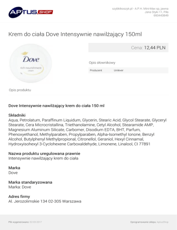 szybkikoszyk.pl - A.P.H. Mini-Max sp, jawna Jana Styki 11, Piła 693443849 Krem do ciała Dove Intensywnie nawilżający 150ml Cena: 12,44 PLN Opis słownikowy Producent Unilever Opis produktu Dove Intensywnie nawilżający krem do ciała 150 ml Składniki Aqua, Petrolatum, Paraffinum Liquidum, Glycerin, Stearic Acid, Glycol Stearate, Glyceryl Stearate, Cera Microcristallina, Triethanolamine, Cetyl Alcohol, Stearamide AMP, Magnesium Aluminum Silicate, Carbomer, Disodium EDTA, BHT, Parfum, Phenoxyethanol, Methylparaben, Propylparaben, Alpha-Isomethyl Ionone, Benzyl Alcohol, Butylphenyl Methylpropional, Citronellol, Geraniol, Hexyl Cinnamal, Hydroxyisohexyl 3-Cyclohexene Carboxaldehyde, Limonene, Linalool, CI 77891 Nazwa produktu uregulowana prawnie Intensywnie nawilżający krem do ciała Marka Dove Marka standaryzowana Marka: Dove Adres firmy Al. Jerozolimskie 134 02-305 Warszawa Plik wygenerowano: 02-03-2017 Oprogramowanie sklepu: AptusShop szybkikoszyk.pl - A.P.H. Mini-Max sp, jawna Jana Styki 11, Piła 693443849 Opis produktu Intensywnie nawilżający krem do ciała - miękka i nawilżona skóra. Company Name Unilever Polska Sp. z o.o. Rodzaj przechowywania Typ: Przechowywać w temperaturze otoczenia Durability after Opening Trwałość po otwarciu. miesiąc/miesiące/miesięcy 9 Rozmiar opakowania 150 Jednostka (tekst opisowy) ml Średnia miara Średnia miara (e) Jednostka (specyficzna) Jednostka (specyficzna): Mililitrów Rodzaj opakowania Typ: Opakowanie plastikowe Wymiar liczbowy Wymiar liczbowy: 150 Wymiar Wymagana wysokość na półce: 98 Wymagana szerokość na półce: 98 Wymagana głębokość na półce: 30 Waga Waga brutto: 169 Plik wygenerowano: 02-03-2017 Oprogramowanie sklepu: AptusShop szybkikoszyk.pl - A.P.H. Mini-Max sp, jawna Jana Styki 11, Piła 693443849 Sprzedaż jednostkowa Wysokość: 98 Szerokość: 98 Głębokość: 30 Adres zwrotny Unilever Polska Sp. z o.o. Al. Jerozolimskie 134 02-305 Warszawa 801 610 610 www.dove.com www.unilever.com Adres dystrybutora Unilever Polska Sp. z o.o. Al. Jerozolimskie 134 02-305 Warszawa Telefon/Fax kontaktowy 801610610 Adres internetowy www.dove.com, www.unilever.com Języki na opakowaniu bułgarski, czeski, estoński, łotewski, litewski, macedoński, mołdawski, polski, rumuński, słowacki, inne Język produktu Główny język opisu: polski Język danych: polski Podzielony opis produktu Nazwa funkcjonalna: Intensywnie nawilżający krem do ciała Plik wygenerowano: 02-03-2017 Powered by TCPDF (www.tcpdf.org) Oprogramowanie sklepu: AptusShop