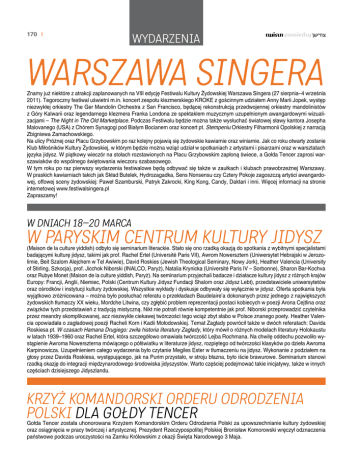 170 wydarzenia Warszawa Singera Znamy już niektóre z atrakcji zaplanowanych na VIII edycję Festiwalu Kultury Żydowskiej Warszawa Singera (27 sierpnia–4 września 2011). Tegoroczny festiwal uświetni m.in. koncert zespołu klezmerskiego KROKE z gościnnym udziałem Anny Marii Jopek, występ niezwykłej orkiestry The Ger Mandolin Orchestra z San Francisco, będącej rekonstrukcją przedwojennej orkiestry mandolinistów z Góry Kalwarii oraz legendarnego klezmera Franka Londona ze spektaklem muzycznym uzupełnionym awangardowymi wizualizacjami – The Night in The Old Marketplace. Podczas Festiwalu będzie można także wysłuchać światowej sławy kantora Josepha Malovanego (USA) z Chórem Synagogi pod Białym Bocianem oraz koncert pt. Stempeniu Orkiestry Filharmonii Opolskiej z narracją Zbigniewa Zamachowskiego. Na ulicy Próżnej oraz Placu Grzybowskim po raz kolejny pojawią się żydowskie kawiarnie oraz winiarnie. Jak co roku otwarty zostanie Klub Miłośników Kultury Żydowskiej, w którym będzie można wziąć udział w spotkaniach z artystami i pisarzami oraz w warsztatach języka jidysz. W piątkowy wieczór na stołach rozstawionych na Placu Grzybowskim zapłoną świece, a Gołda Tencer zaprosi warszawiaków do wspólnego świętowania wieczoru szabasowego. W tym roku po raz pierwszy wydarzenia festiwalowe będą odbywać się także w zaułkach i klubach prawobrzeżnej Warszawy. W praskich kawiarniach takich jak Skład Butelek, Hydrozagadka, Sens Nonsensu czy Cztery Pokoje zagoszczą artyści awangardowej, offowej sceny żydowskiej: Paweł Szamburski, Patryk Zakrocki, King Kong, Candy, Daktari i inni. Więcej informacji na stronie internetowej www.festiwalsingera.pl Zapraszamy! W dniach 18–20 marca w paryskim Centrum Kultury Jidysz (Maison de la culture yiddish) odbyło się seminarium literackie. Stało się ono rzadką okazją do spotkania z wybitnymi specjalistami badającymi kulturę jidysz, takimi jak prof. Rachel Ertel (Université Paris VII), Awrom Nowersztern (Uniwersytet Hebrajski w Jerozolimie, Beit Szalom Alejchem w Tel Awiwie), David Roskies (Jewish Theological Seminary, Nowy Jork), Heather Valencia (University of Stirling, Szkocja), prof. Jicchok Niborski (INALCO, Paryż), Natalia Krynicka (Université Paris IV – Sorbonne), Sharon Bar-Kochva oraz Rubye Monet (Maison de la culture yiddish, Paryż). Na seminarium przyjechali badacze i działacze kultury jidysz z różnych krajów Europy: Francji, Anglii, Niemiec, Polski (Centrum Kultury Jidysz Fundacji Shalom oraz Jidysz Lebt), przedstawiciele uniwersytetów oraz ośrodków i instytucji kultury żydowskiej. Wszystkie wykłady i dyskusje odbywały się wyłącznie w jidysz. Oferta spotkania była wyjątkowo zróżnicowana – można było posłuchać referatu o przekładach Baudelaire’a dokonanych przez jednego z największych żydowskich tłumaczy XX wieku, Mordche Litwina, czy zgłębić problem reprezentacji postaci kobiecych w poezji Arona Cejtlina oraz związków tych przedstawień z tradycją mistyczną. Nikt nie potrafi równie kompetentnie jak prof. Niborski przeprowadzić czytelnika przez meandry skomplikowanej, acz niezwykle ciekawej twórczości tego wciąż zbyt słabo w Polsce znanego poety. Heather Valencia opowiadała o zagładowej poezji Racheli Korn i Kadii Mołodowskiej. Temat Zagłady powrócił także w dwóch referatach: Davida Roskiesa pt. W czasach Hamana Drugiego: zwiła historia literatury Zagłady, który mówił o różnych modelach literatury Holokaustu w latach 1939–1960 oraz Rachel Ertel, która szczegółowo omawiała twórczość Lejba Rochmana. Na chwilę oddechu pozwoliło wystąpienie Awroma Nowerszterna mówiącego o półświatku w literaturze jidysz, rozpiętego od twórczości klasyków po dzieła Awroma Karpinowicza. Uzupełnieniem całego wydarzenia było czytanie Megiles Ester w tłumaczeniu na jidysz. Wykonanie z podziałem na głosy przez Davida Roskiesa, występującego, jak na Purim przystało, w stroju błazna, było iście brawurowe. Seminarium stanowi rzadką okazję do integracji międzynarodowego środowiska jidyszystów. Warto częściej podejmować takie inicjatywy, także w innych częściach dzisiejszego Jidyszlandu. Krzyż Komandorski Orderu Odrodzenia Polski dla Gołdy Tencer Gołda Tencer została uhonorowana Krzyżem Komandorskim Orderu Odrodzenia Polski za upowszechnianie kultury żydowskiej oraz osiągnięcia w pracy twórczej i artystycznej. Prezydent Rzeczypospolitej Polskiej Bronisław Komorowski wręczył odznaczenia państwowe podczas uroczystości na Zamku Królewskim z okazji Święta Narodowego 3 Maja. 171 wydarzenia 30 stycznia 2011 roku Chawa Rozenfarb. w wieku 87 lat zmarła w Lethbridge (Kanada) Ta pisząca w jidysz poetka i pisarka urodziła się 9 lutego 1923 roku w Łodzi, w rodzinie bundowskiej. Przed wojną ukończyła należącą do CISzO szkołę im. Włodzimierza Medema. Już w łódzkim getcie powstały jej pierwsze utwory, zauważone przez poetę Simchę Bunema Szajewicza. On właśnie wprowadził ją do grupy pisarzy żydowskich, której była najmłodszą członkinią. Z Łodzi wraz z matką i siostrą trafiła do Oświęcimia, a stamtąd kolejno do obozu pracy w Sasel i do Bergen-Belsen. Po wojnie wszystkie trzy zamieszkały w Belgii. W 1950 roku wraz z mężem Henrykiem Morgentalerem wyjechali do Kanady. Krytycy literatury wymieniają Chawę Rozenfarb wśród najlepszych współczesnych autorów jidysz. Żeby dotrzeć do szerszego kręgu odbiorców, sama lub z pomocą córki Gołdy przekładała swoje utwory na angielski. Stale powracające w jej twórczości obrazy Łodzi nie są niestety dostępne polskiemu czytelnikowi. Choć poetka odwiedziła w 2009 roku swoje rodzinne miasto i zachwyciła wiele osób opowieścią o swojej mamie, żadnej książki jej autorstwa nie przetłumaczono na nasz język. Więcej informacji o pisarce oraz niektóre jej utwory w jidysz można znaleźć na stronie: http://chavarosenfarb.