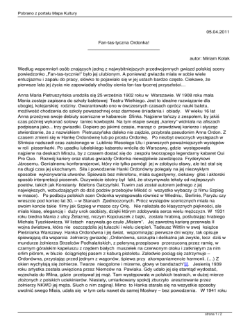 Pobrano z portalu Mapa Kultury 05.04.2011 Fan-tas-tyczna Ordonka! ____________________________ autor: Miriam Kołak Według wspomnień osób znających jedną z najwybitniejszych przedwojennych gwiazd polskiej sceny powiedzonko „Fan-tas-tycznie!” było jej ulubionym. A ponieważ gwiazda miała w sobie wiele entuzjazmu i zapału do pracy, słówko to pojawiało się w jej ustach bardzo często. Ciekawe, że pierwsze lata jej życia nie zapowiadały choćby cienia fan-tas-tycznej przyszłości… Anna Maria Pietruszyńska urodziła się 25 września 1902 roku w Warszawie. W 1908 roku mała Mania zostaje zapisana do szkoły baletowej Teatru Wielkiego. Jest to idealne rozwiązanie dla ubogiej, kolejarskiej rodziny. Gwarantowało ono w ówczesnych czasach oprócz nauki baletu, możliwość chodzenia do szkoły powszechnej oraz darmowe śniadania i obiady. W wieku 16 lat Anna przeżywa swoje debiuty sceniczne w kabarecie Sfinks. Najpierw tańczy z zespołem, by jakiś czas później wykonać solowy taniec kowbojski. Na tym etapie swojej „kariery” widniała na afiszach podpisana jako... trzy gwiazdki. Dopiero po jakimś czasie, marząc o prawdziwej karierze i słysząc stwierdzenie, że z nazwiskiem Pietruszyńska daleko nie zajdzie, przybrała pseudonim Anna Ordon. Z czasem zmieni się w Hankę Ordonównę lub po prostu Ordonkę. Po niezbyt owocnych występach w Sfinksie nadszedł czas założonego w Lublinie Wesołego Ulu i pierwszych poważniejszych występów w roli piosenkarki. Po upadku lubelskiego kabaretu wróciła do Warszawy, gdzie występowała najpierw na deskach Mirażu, by z czasem dostać się do zespołu tworzącego legendarny kabaret Qui Pro Quo. Rozwój kariery oraz status gwiazdy Ordonka niewątpliwie zawdzięcza Fryderykowi Jàrosemu. Genialnemu konferansjerowi, który nie tylko pomógł jej w zdobyciu sławy, ale też stał się na długi czas jej ukochanym. Siła i powodzenie Hanki Ordonówny polegały na jej niezwykłym sposobie wykonywania utworów. Śpiewała bez mikrofonu, miała sugestywny, ciekawy głos i aktorski sposób interpretacji piosenek. Oczywiście istotny był fakt, że otrzymywała teksty od najlepszych poetów, takich jak Konstanty Ildefons Gałczyński. Tuwim zaś został autorem jednego z jej największych, wzbudzających do dziś podziw przebojów Miłość ci wszystko wybaczy (z filmu Szpieg w masce). Po podboju polskich scen Ordonka występowała również w Wiedniu, Berlinie, Paryżu czy wreszcie pod koniec lat 30. – w Stanach Zjednoczonych. Prócz występów scenicznych miała na swoim koncie takie filmy jak Szpieg w masce czy Orlę. Nie należała do klasycznych piękności, ale miała klasę, elegancję i duży urok osobisty, dzięki którym zdobywała serca wielu mężczyzn. W 1931 roku biedna Mania z ulicy Żelaznej, niczym Kopciuszek z bajki, została hrabiną, poślubiając hrabiego Michała Tyszkiewicza. W listach nazywała go czule „Misiem”. Jej zawrotną karierę przerwała II wojna światowa, która nie oszczędziła jej tułaczki i wielu cierpień. Tadeusz Wittlin w swej książce Pieśniarka Warszawy. Hanka Ordonówna i jej świat, wspominając pierwsze dni wojny, tak opisuje śpiewającą dla wsparcia żołnierzy gwiazdę: „Ordonówna, szczupła i delikatna jak zwykle, lecz dziś w mundurze żołnierza Strzelców Podhalańskich, z peleryną przepisowo przerzuconą przez ramię, w czarnym góralskim kapeluszu z rzędem białych muszelek na czerwonym otoku i zatkniętym za nim orlim piórem, w bluzie ściągniętej pasem z kaburą pistoletu. Zaledwie pociąg się zatrzymuje – Ordonówna, przystając przed jednym z wagonów, śpiewa przy akompaniamencie harmonii. (…) Z okien wychylają się żołnierze. Twarze nieogolone i mizerne, głowy w bandażach”[i]. Jesienią 1939 roku artystka została uwięziona przez Niemców na Pawiaku. Gdy udało jej się stamtąd wydostać, wyjechała do Wilna, gdzie przebywał jej mąż. Tam występowała w polskich teatrach, w dużej mierze złożonych z polskich uciekinierów. Niestety, umiarkowany spokój zburzyło aresztowanie przez żołnierzy NKWD jej męża. Słuch o nim zaginął. Mimo to Hanka starała się na wszystkie sposoby uwolnić swego Misia, udała się w tym celu nawet do samej Moskwy – bez powodzenia. W 1941 roku strona 1 / 2 Pobrano z portalu Mapa Kultury przybyło po nią NKWD, a następnie została zesłana do łagru w Uzbekistanie. Ordonka, wycieńczona tragicznymi warunkami i pracą, traci siły. Wraca niegdyś zaleczona gruźlica. Cudem udaje jej się przeżyć do zawarcia układu Sikorski–Majski, wskutek którego następuje amnestia dla polskich więźniów politycznych i zesłańców na terenie ZSRR. Teraz zaczyna się zupełnie nowa historia Hanny Ordonówny, która z całym poświęceniem zdecydowała się pełnić funkcję delegata do spraw opieki nad ludnością polską w Azji Środkowej w mieście Taszkient. Choć stan jej zdrowia wciąż się pogarszał, postanowiła zająć się opieką nad zagubionymi w ZSRR polskimi dziećmi. Pozbawiona środków oraz pomocy ze strony sowietów utworzyła w Taszkiencie i jego okolicach azyle dla sierot. Następnie wraz z dwustoma maluchami powędrowała ku innemu świata – do Bombaju w Indiach, gdzie dziećmi miały się zająć misje Czerwonego Krzyża. Już po wojnie pod pseudonimem Weronika Hort (bojąc się zemsty komunistów) opisała historię tych opuszczonych sierot w niezwykłej książce Tułacze dzieci. W czasie podróży w turkmeńskiej stolicy odnalazła niespodziewanie swego ukochanego męża. Ostatnie lata życia Hanka Ordonówna, cierpiąc coraz bardziej na gruźlicę, spędziła wraz z mężem w Teheranie, Palestynie (gdzie dała wiele koncertów dla polskich żołnierzy), by w końcu dotrzeć do Libanu. Umarła w Bejrucie 8 września 1950 roku. Tuż przed śmiercią, gdy nie mogła już występować, zaprezentowała jeszcze jeden nieodkryty wcześniej talent: malarski… [i] Tadeusz Wittlin Pie