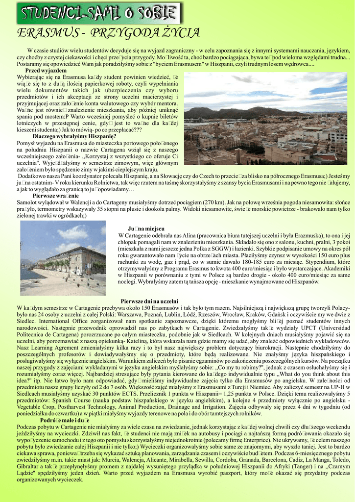 ERASMUS - PRZYGODA ŻYCIA W czasie studiów wielu studentów decyduje się na wyjazd zagraniczny - w celu zapoznania się z innymi systemami nauczania, językiem, czy choćby z czystej ciekawości i chęci przeżycia przygody. Możliwość ta, choć bardzo pociągająca, bywa też pod wieloma względami trudna... Postaramy się opowiedzieć Wam jak poradziłyśmy sobie z "byciem Erasmusem" w Hiszpanii, czyli trudnym losem wędrowca.... Przed wyjazdem Wybierając się na Erasmusa każdy student powinien wiedzieć, że wiąże się to z dużą ilością papierkowej roboty, czyli wypełniania wielu dokumentów takich jak ubezpieczenia czy wyboru przedmiotów i ich akceptacji ze strony uczelni macierzystej i przyjmującej oraz założenie konta walutowego czy wybór mentora. Ważne jest również znalezienie mieszkania, aby później uniknąć spania pod mostem:P Warto wcześniej pomyśleć o kupnie biletów lotniczych w przestępnej cenie, gdyż jest to ważne dla każdej kieszeni studenta;) Jak to mówią- po co przepłacać??? Dlaczego wybrałyśmy Hiszpanię? Pomysł wyjazdu na Erasmusa do miasteczka portowego położonego na południu Hiszpanii o nazwie Cartagena wziął się z naszego wcześniejszego założenia- ,,Korzystaj z wszystkiego co oferuje Ci uczelnia''. Wyjeżdżałyśmy w semestrze zimowym, więc głównym założeniem było spędzenie zimy w jakimś cieplejszym kraju. Dodatkowo nasza Pani koordynator polecała Hiszpanię, a na Słowację czy do Czech to przecież za blisko na półrocznego Erasmusa;) Jesteśmy już na ostatnim- V roku kierunku Rolnictwa, tak więc rzutem na taśmę skorzystałyśmy z szansy bycia Erasmusami i na pewno tego nie żałujemy, a jak to wyglądało za granicą to już opowiadamy… Pierwsze wrażenie Samolot wylądował w Walencji a do Cartageny musiałyśmy dotrzeć pociągiem (270 km). Jak na połowę września pogoda niesamowita: słońce prażyło, termometry wskazywały 35 stopni na plusie i dookoła palmy. Widoki niesamowite, świeże morskie powietrze - brakowało nam tylko zielonej trawki w ogródkach;) Już na miejscu W Cartagenie odebrała nas Alina (pracownica biura tutejszej uczelni i była Erazmuska), to ona i jej chłopak pomagali nam w znalezieniu mieszkania. Składało się ono z salonu, kuchni, pralni, 3 pokoi (mieszkała z nami jeszcze jedna Polka z SGGW) i łazienki. Szybkie podpisanie umowy na okres pół roku gwarantowało nam życie na obrzeżach miasta. Płaciłyśmy czynsz w wysokości 150 euro plus rachunki za wodę, gaz i prąd, co w sumie dawało 180-185 euro za miesiąc. Stypendium, które otrzymywałyśmy z Programu Erasmus to kwota 400 euro/miesiąc i było wystarczające. Akademiki w Hiszpanii w porównaniu z tymi w Polsce są bardzo drogie - około 400 euro/miesiąc za same noclegi. Wybrałyśmy zatem tą tańsza opcję - mieszkanie wynajmowane od Hiszpanów. Pierwsze dni na uczelni W każdym semestrze w Cartagenie przebywa około 150 Erasmusów i tak było tym razem. Najsilniejszą i największą grupę tworzyli Polacybyło nas 24 osoby z uczelni z całej Polski: Warszawa, Poznań, Lublin, Łódź, Rzeszów, Wrocław, Kraków, Gdańsk i oczywiście my we dwie z Siedlec. International Office zorganizował nam spotkanie zapoznawcze, dzięki któremu mogłyśmy bliżej poznać studentów innych narodowości. Następnie przewodnik oprowadził nas po zabytkach w Cartagenie. Zwiedzałyśmy także wydziały UPCT (Universidad Politecnica de Cartagena) porozrzucane po całym miasteczku, podobnie jak w Siedlcach. W kolejnych dniach musiałyśmy pojawić się na uczelni, aby porozmawiać z naszą opiekunką- Kateliną, która wskazała nam gdzie mamy się udać, aby znaleźć odpowiednich wykładowców. Nasz Learning Agrement zmieniałyśmy kilka razy i to był nasz największy problem dotyczący biurokracji. Następnie chodziłyśmy do poszczególnych profesorów i dowiadywałyśmy się o przedmioty, które będą realizowane. Nie znałyśmy języka hiszpańskiego i posługiwałyśmy się wyłącznie angielskim. Warunkiem zaliczeń było pisanie egzaminów po zakończeniu poszczególnych kursów. Na początku naszej przygody z zajęciami wykładanymi w języku angielskim myślałyśmy sobie: ,,Co my tu robimy?'', jednak z czasem osłuchałyśmy się i rozumiałyśmy coraz więcej. Najbardziej stresujące były pytania kierowane do każdego indywidualnie typu ,,What do you think about this idea?'' itp. Nie łatwo było nam odpowiadać, gdyż mieliśmy indywidualne zajęcia tylko dla Erasmusów po angielsku. W zależności od przedmiotu nasze grupy liczyły od 2 do 7 osób. Większość zajęć miałyśmy z Erasmusami z Turcji i Niemiec. Aby zaliczyć semestr na UP-H w Siedlcach musiałyśmy uzyskać 30 punktów ECTS. Przelicznik 1 punkta w Hiszpanii= 1,25 punkta w Polsce. Dzięki temu realizowałyśmy 5 przedmiotów: Spanish Course (nauka podstaw hiszpańskiego w języku angielskim), a kolejne 4 przedmioty wyłącznie po angielsku Vegetable Crop, Postharvest Technology, Animal Production, Drainage and Irrigation. Zajęcia odbywały się przez 4 dni w tygodniu (od poniedziałku do czwartku) a w piątki miałyśmy wyjazdy terenowe na pola i do obór tamtejszych rolników. Podróże małe i duże Podczas pobytu w Cartagenie nie miałyśmy za wiele czasu na zwiedzanie, jednak korzystając z każdej wolnej chwili czy dłuższego weekendu jeździłyśmy na wycieczki. Zdziwił nas fakt, że studenci nie mają zniżek na autobusy i pociągi a najtańszą formą podróżowania okazało się wypożyczenie samochodu i z tego oto pomysłu skorzystałyśmy niejednokrotnie (polecamy firmę Enterprice). Nie ukrywamy, że celem naszego pobytu było zwiedzanie całej Hiszpanii i nie tylko;) Wycieczki organizowałyśmy sobie same ze znajomymi, aby wyszło taniej. Jest to bardzo ciekawa sprawa, ponieważ trzeba się wykazać sztuką planowania, zarządzania czasem i oczywiście budżetem. Podczas 6-miesięcznego pobytu zwiedziłyśmy m.in. ta