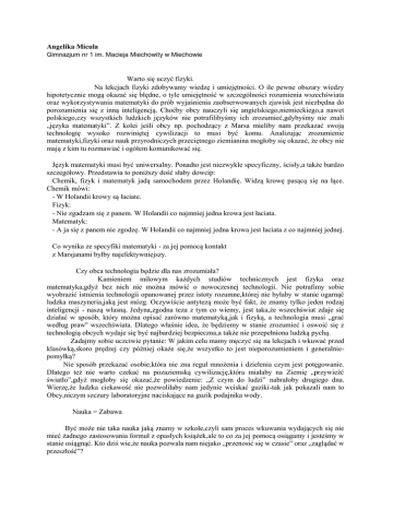 Angelika Micuła Gimnazjum nr 1 im. Macieja Miechowity w Miechowie Warto się uczyć fizyki. Na lekcjach fizyki zdobywamy wiedzę i umiejętności. O ile pewne obszary wiedzy hipotetycznie mogą okazać się błędne, o tyle umiejętność w szczególności rozumienia wszechświata oraz wykorzystywania matematyki do prób wyjaśnienia zaobserwowanych zjawisk jest niezbędna do porozumienia się z inną inteligencją. Choćby obcy nauczyli się angielskiego,niemieckiego,a nawet polskiego,czy wszystkich ludzkich języków nie potrafilibyśmy ich zrozumieć,gdybyśmy nie znali „języka matematyki”. Z kolei jeśli obcy np. pochodzący z Marsa mieliby nam przekazać swoją technologię wysoko rozwiniętej cywilizacji to musi być komu. Analizując zrozumienie matematyki,fizyki oraz nauk przyrodniczych przeciętnego ziemianina mogłoby się okazać, że obcy nie mają z kim tu rozmawiać i ogółem komunikować się. Język matematyki musi być uniwersalny. Ponadto jest niezwykle specyficzny, ścisły,a także bardzo szczegółowy. Przedstawia to poniższy dość słaby dowcip: Chemik, fizyk i matematyk jadą samochodem przez Holandię. Widzą krowę pasącą się na łące. Chemik mówi: - W Holandii krowy są łaciate. Fizyk: - Nie zgadzam się z panem. W Holandii co najmniej jedna krowa jest łaciata. Matematyk: - A ja się z panem nie zgodzę. W Holandii co najmniej jedna krowa jest łaciata z co najmniej jednej. Co wynika ze specyfiki matematyki - za jej pomocą kontakt z Marsjanami byłby najefektywniejszy. Czy obca technologia będzie dla nas zrozumiała? Kamieniem milowym każdych studiów technicznych jest fizyka oraz matematyka,gdyż bez nich nie można mówić o nowoczesnej technologii. Nie potrafimy sobie wyobrazić istnienia technologii opanowanej przez istoty rozumne,której nie byłaby w stanie ogarnąć ludzka maszyneria,jaką jest mózg. Oczywiście antytezą może być fakt, że znamy tylko jeden rodzaj inteligencji - naszą własną. Jedyna,zgodna teza z tym co wiemy, jest taka,że wszechświat zdaje się działać w sposób, który można opisać zarówno matematyką,jak i fizyką, a technologia musi „grać według praw'' wszechświata. Dlatego właśnie idea, że będziemy w stanie zrozumieć i oswoić się z technologią obcych wydaje się być najbardziej bezpieczna,a także nie przepełniona ludzką pychą. Zadajmy sobie uczciwie pytanie: W jakim celu mamy męczyć się na lekcjach i wkuwać przed klasówką,skoro prędzej czy później okaże się,że wszystko to jest nieporozumieniem i generalniepomyłką? Nie sposób przekazać osobie,która nie zna reguł mnożenia i dzielenia czym jest potęgowanie. Dlatego też nie warto czekać na pozaziemską cywilizację,która miałaby na Ziemię „przywieźć światło”,gdyż mogłoby się okazać,że powiedzenie: „Z czym do ludzi” nabrałoby drugiego dna. Wierzę,że ludzka ciekawość nie pozwoliłaby nam jedynie wciskać guziki-tak jak pokazali nam to Obcy,niczym szczury laboratoryjne naciskające na guzik podajnika wody. Nauka = Zabawa Być może nie taka nauka jaką znamy w szkole,czyli sam proces wkuwania wydających się nie mieć żadnego zastosowania formuł z opasłych książek,ale to co za jej pomocą osiągamy i jesteśmy w stanie osiągnąć. Kto dziś wie,że nauka pozwala nam niejako „przenosić się w czasie” oraz „zaglądać w przeszłość”? Uwaga dygresja: Co znaczy powyższe sformułowanie : „zaglądać w przeszłość”? Ponieważ wiemy,że światło porusza się ze skończoną prędkością patrząc bardzo,bardzo daleko obserwujemy światło, które do nas dociera po pewnym czasie. Gdyby zgasło Słońce, na Ziemi stracilibyśmy jego światło po 8 min. Gdyby wybuchła najbliższa nam gwiazda (inna niż Słońce- Proxima Centauri na Ziemi zaobserwowalibyśmy to po 4,22 latach -ponieważ gwiazda ta położona jest tak daleko 4,22 lata światło aby przebyć drogę od niej do Ziemi potrzebuje ponad 4 lat. Najdalsza galaktyka jaką możemy zaobserwować przy użyciu obecnej technologii to MACS0647-JD link: http://orion.pta.edu.pl/najdalsza-galaktyka-w-znanym-wszechswiecie ). „Cała nasza nauka, w porównaniu z rzeczywistością, jest prymitywna i dziecinna - ale nadal jest to najcenniejsza rzecz, jaką posiadamy.” - Albert Einstein Nauka potrafi również „poruszać ludzkie serca” w sposób niewyobrażalny. Możemy się dziś wzruszać czytając o Sondach, które zginęły w atmosferze Wenus próbując uchylić dla nas rąbka tajemnicy tej nieprzyjaznej ludziom planety, o małych krokach i dużych skokach pierwszych ludzi na innym globie niż Ziemia – Księżycu. Temat wypraw na Księżyc i misji Apollo ma więcej twarzy. Czas „wyścigu na Księżyc” to jeden z najszczęśliwszych okresów, w dziejach Stanów Zjednoczonych (popełniano wtedy najmniej samobójstw w historii USA). Oznacza to,że nauka może być bodźcem do życia! Tłumaczy się to tym, że ludzie dostali cel (dostać się na Księżyc przed Związkiem Radzieckim), populacja zaczęła chętniej i więcej pracować, i nie mówi się tu tylko o astronautach - wzrost ekonomiczny USA rozwijał się wtedy niezwykle szybko po ogłoszeniu planu dotarcia na Księżyc. Temat ten był na ustach wszystkich ludzi. Na uczelnie techniczne i matematyczne nigdy nie było tylu chętnych, co wtedy. Do dziś jeden z filarów elity naukowej świata stanowią ludzie, którzy usłyszeli o tym najambitniejszym zrywie Ludzkości w telewizji lub radiu i postanowili udać się na uniwersytety,a potem zakuwali fizykę dniami i nocami. Uważam ,że świat jaki znamy jest niesamowity dzięki nauce, przykłady można mnożyć: istnienie miast, budownictwa, bieżącej wody,ogrzewania domu, elektryczności, komputerów itd. Satelity pozwalające obejrzeć każdy zakątek Ziemi, mapujące Marsa. Zarówno astronomia,jak i fizyka jest dziedziną, która mocna pcha technologię.