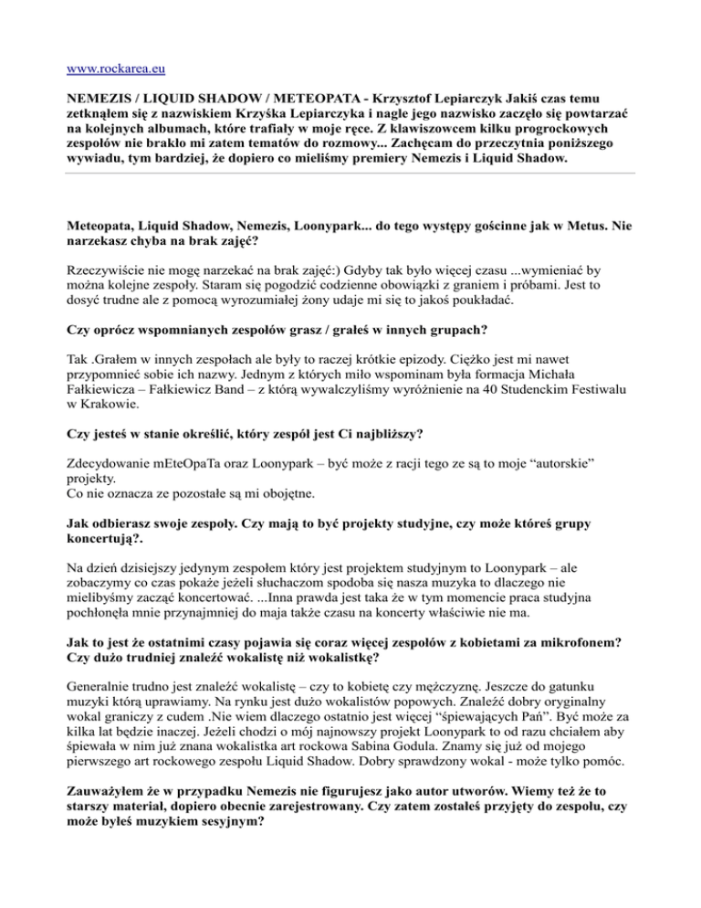 www.rockarea.eu NEMEZIS / LIQUID SHADOW / METEOPATA - Krzysztof Lepiarczyk Jakiś czas temu zetknąłem się z nazwiskiem Krzyśka Lepiarczyka i nagle jego nazwisko zaczęło się powtarzać na kolejnych albumach, które trafiały w moje ręce. Z klawiszowcem kilku progrockowych zespołów nie brakło mi zatem tematów do rozmowy... Zachęcam do przeczytnia poniŜszego wywiadu, tym bardziej, Ŝe dopiero co mieliśmy premiery Nemezis i Liquid Shadow. Meteopata, Liquid Shadow, Nemezis, Loonypark... do tego występy gościnne jak w Metus. Nie narzekasz chyba na brak zajęć? Rzeczywiście nie mogę narzekać na brak zajęć:) Gdyby tak było więcej czasu ...wymieniać by moŜna kolejne zespoły. Staram się pogodzić codzienne obowiązki z graniem i próbami. Jest to dosyć trudne ale z pomocą wyrozumiałej Ŝony udaje mi się to jakoś poukładać. Czy oprócz wspomnianych zespołów grasz / grałeś w innych grupach? Tak .Grałem w innych zespołach ale były to raczej krótkie epizody. CięŜko jest mi nawet przypomnieć sobie ich nazwy. Jednym z których miło wspominam była formacja Michała Fałkiewicza – Fałkiewicz Band – z którą wywalczyliśmy wyróŜnienie na 40 Studenckim Festiwalu w Krakowie. Czy jesteś w stanie określić, który zespół jest Ci najbliŜszy? Zdecydowanie mEteOpaTa oraz Loonypark – być moŜe z racji tego ze są to moje “autorskie” projekty. Co nie oznacza ze pozostałe są mi obojętne. Jak odbierasz swoje zespoły. Czy mają to być projekty studyjne, czy moŜe któreś grupy koncertują?. Na dzień dzisiejszy jedynym zespołem który jest projektem studyjnym to Loonypark – ale zobaczymy co czas pokaŜe jeŜeli słuchaczom spodoba się nasza muzyka to dlaczego nie mielibyśmy zacząć koncertować. ...Inna prawda jest taka Ŝe w tym momencie praca studyjna pochłonęła mnie przynajmniej do maja takŜe czasu na koncerty właściwie nie ma. Jak to jest Ŝe ostatnimi czasy pojawia się coraz więcej zespołów z kobietami za mikrofonem? Czy duŜo trudniej znaleźć wokalistę niŜ wokalistkę? Generalnie trudno jest znaleźć wokalistę – czy to kobietę czy męŜczyznę. Jeszcze do gatunku muzyki którą uprawiamy. Na rynku jest duŜo wokalistów popowych. Znaleźć dobry oryginalny wokal graniczy z cudem .Nie wiem dlaczego ostatnio jest więcej “śpiewających Pań”. Być moŜe za kilka lat będzie inaczej. JeŜeli chodzi o mój najnowszy projekt Loonypark to od razu chciałem aby śpiewała w nim juŜ znana wokalistka art rockowa Sabina Godula. Znamy się juŜ od mojego pierwszego art rockowego zespołu Liquid Shadow. Dobry sprawdzony wokal - moŜe tylko pomóc. ZauwaŜyłem Ŝe w przypadku Nemezis nie figurujesz jako autor utworów. Wiemy teŜ Ŝe to starszy materiał, dopiero obecnie zarejestrowany. Czy zatem zostałeś przyjęty do zespołu, czy moŜe byłeś muzykiem sesyjnym? Oficjalnie jestem klawiszowcem Nemezis. Materiał na płycie ma ponad 10 lat. Nie ja byłem jego twórcą. Dostałem płytę i miałem nie odwzorowywać ale w podobnych klimatach zrobić coś po swojemu. Nie było łatwo ale myślę Ŝe efekt końcowy jest zadowalający. Mam nadzieje Ŝe uda się zrobić kolejną płytę Nemezis na której znajdą się i moje kompozycje. Chciałem poruszyć kwestię Twojego pojawienia się na płycie Metus. To dość nieoczekiwane, Ŝe na albumie którego twórca opiera lwią część muzyki na brzmieniach klawiszowych, pojawia się gościnnie – klawiszowiec. Ale z drugiej strony pewnie takie zaproszenie było dla Ciebie wyróŜnieniem... Jak doszło do tej współpracy. Często pracuje z Ryśkiem Kramarskim w jego studiu Lynx Music. Tam poznałem Metusa i postanowiliśmy współpracować. Robimy wspólnie drugą “cd” a z tego co wiem maja być kolejne. Muzyka bardzo klimatyczna rzeczywiście duŜo w niej czarno-białych dźwięków tym bardziej miło Ŝe z pod moich palców. Chciałbym porozmawiać trochę o Liquid Shadow. Spectrum, jak sama nawa wskazuje jest materiałem przeglądowym – nagrania pochodzą z róŜnego czasu. Dlaczego zdecydowaliście się wydać materiał w takiej formie? Decyzja nie była łatwa bo nagrania nie są doskonałe. Pochodzą z róŜnych demówek to teŜ pewne techniczne niedociągnięcia słychać. Jednym z prowodyrów tego wydawnictwa jest Ryszard Kramarski. Od początku istnienia zespołu nam pomagał. Jakby na to nie patrzeć LS to kawałek mojego Ŝycia i ciesze się Ŝe ładnie wydaną płytę mogę postawić na półce. Tym bardziej mnie cieszy fakt Ŝe inni tez mogą to zrobić. Czy zespół planuje nagrywanie nowego materiału? Nie podjęliśmy jeszcze ostatecznej decyzji ale wszystko zmierza do tego ze spróbujemy zrobić coś nowego. Liquid Shadow zapowiadany był jako zespół wzorujący się na Dream Theater - jednak podobieństw naleŜy się doszukiwać raczej w smaczkach... Czy zatem planujesz udział w zespole/ projekcie stricte metalowym? MoŜe w stricte metalowym to za duŜo powiedziane. Są roŜne pomysły i propozycje. Na razie skupiam się na dokończeniu moich tegorocznych planów wydawniczych. Potem przemyśle wszystkie za i przeciw. Sam się zdziwiłem ze LS był zapowiadany i porównywany z DT – moŜe dlatego Ŝe na naszych koncertach graliśmy kilka ich coverów.. Być moŜe nasze kolejne kompozycje pójdą w tym kierunku – kto to wie:) Na Myspace Loonypark zamieszczone są dwa utwory. Na obu z nich śpiewa Sabina Godula. Jednak w składzie figuruje jako gość. Czy to oznacza, Ŝe na albumie usłyszymy takŜe innych wokalistów? Czy moŜe mamy spodziewać się utworów instrumentalnych? Na płycie znajdą się kompozycje wokalno-instrumentalne jak i jeden utwór instrumentalny. Loonypark jest to projekt załoŜony przez dwie osoby. Razem z Jakubem Grzesło – perkusistą jesteśmy w podstawowym składzie. Sabina jest naszym głównym wokalistą i to ją będziecie mogli usłyszeć na płycie. Będzie teŜ jeden gość specjalny. Z kolei na Twoim profilu mo