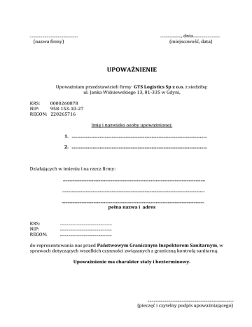 .............................................. (nazwa firmy) ...................., dnia.......................... (miejscowość, data) UPOWAŻNIENIE Upoważniam przedstawicieli firmy GTS Logistics Sp z o.o. z siedzibą: ul. Janka Wiśniewskiego 13, 81-335 w Gdyni, KRS: 0000260878 NIP: 958-153-10-27 REGON: 220265716 Imię i nazwisko osoby upoważnionej: 1. ................................................................................................................... 2. ................................................................................................................... Działających w imieniu i na rzecz firmy: ......................................................................................................................... ......................................................................................................................... ......................................................................................................................... pełna nazwa i adres KRS: NIP: REGON: .................................................. .................................................. .................................................. do reprezentowania nas przed Państwowym Granicznym Inspektorem Sanitarnym, w sprawach dotyczących wszelkich czynności związanych z graniczną kontrolą sanitarną. Upoważnienie ma charakter stały i bezterminowy. ................................................................................... (pieczęć i czytelny podpis upoważniającego)