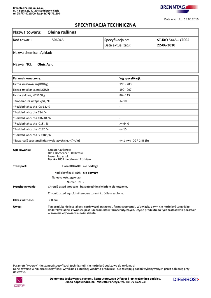 Brenntag Polska Sp. z.o.o. ul. J. Bema 21, 47-224 Kędzierzyn-Koźle tel (48/77)4721500, fax (48/77)4721600 Data wydruku: 15.06.2016 SPECYFIKACJA TECHNICZNA Nazwa towaru: Oleina roślinna Kod towaru: 506045 Specyfikacja nr: Data aktualizacji: ST-IXO 5445-1/2005 22-06-2010 Nazwa chemiczna\skład: Nazwa INCI: Oleic Acid Parametr oznaczony: Wg specyfikacji: Liczba kwasowa, mgKOH/g 190 - 203 Liczba zmydlania, mgKOH/g 190 - 207 Liczba jodowa, gI2/100 g 86 - 115 Temperatura krzepnięcia, °C <= 10 *Rozkład łańcucha C8-12, % - *Rozkład łańcucha C14, % *Rozkład łańcucha C16-18, % - *Rozkład łańcucha C18`, % >= 64,0 *Rozkład łańcucha C18", % <= 15 *Rozkład łańcucha > C18", % *Zawartość substancji niezmydlających się, %(m/m) Opakowania: Kanister 30 litrów DPPL Kontener 1000 litrów Luzem lub sztuki Beczka 200 l metalowa z korkiem Transport: Przechowywanie: <= 1 (wg DGF C-III 1b) Klasa RID/ADR: nie podlega Kod klasyfikacji ADR: nie dotyczy Nalepka ostrzegawcza: Numer UN: Chronić przed gorącem i bezpośrednim światłem słonecznym. Chronić przed wysokimi temperaturami i źródłem zapłonu. Okres ważności: 360 dni Uwagi: Ten produkt nie jest jakości spożywczej, paszowej, farmaceutycznej. W związku z tym nie może być użyty jako dodatek/składnik żywności, pasz lub produktów farmaceutycznych. Użycie produktu do tych zastosowań pozostaje w zakresie odpowiedzialności klienta. Parametr "typowy" nie stanowi specyfikacji technicznej i nie może być podstawą do reklamacji Dane zawarte w niniejszej specyfikacji wynikają z aktualnej wiedzy o produkcie i nie zastępują badań wykonywanych przez odbiorcę przy dostawie. Dokument drukowany z systemu komputerowego Diferros i jest ważny bez podpisu. Osoba odpowiedzialna - Violetta Pańczyk, tel. +48 77 4721538