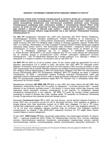 SUKCESY I WYZWANIA TOWARZYSTW FUNDUSZY INWESTYCYJNYCH1 Dynamiczny rozwój rynku funduszy inwestycyjnych to zarówno skutek jak i przyczyna między innymi działań podmiotów prowadzących na nim działalność. Aby zachować i stale podnosić jakość prowadzonej działalności oraz oferowanych produktów podmioty rynku funduszy inwestycyjnych podejmują stałe, intensywne wysiłki, w konsekwencji których Klient może poczuć, że rynek nie tylko proponuje mu dobry produkt, ale produkt ten jest dopasowany do jego potrzeb a obsługa w zakresie jego wyboru i nabycia jest przyjazna i komfortowa. Najistotniejsze sukcesy, którymi mogą pochwalić się w tym zakresie Towarzystwa Funduszy Inwestycyjnych to: Dla AIG TFI największym sukcesem roku 2007 było stworzenie AIG SFIO Parasol Podatkowy, umożliwiającego obniżenie obciążeń podatkowych. Parasol Podatkowy to 12 subfunduszy: 6 krajowych i 6 zagranicznych o różnej polityce inwestycyjnej. Dodatkowo rok 2007 to bardzo dobre wyniki funduszy AIG (AIG FIO Obligacji zajął I miejsce w rankingu tygodnika „Wprost” Portfel Roku 2007, a w rankingu „Newsweeka” za 3 lata w kategorii Fundusze Dłużne Polskie Obligacyjne osiągnął najwyższą stopę zwrotu: 22,67%, AIG Subfundusz Akcji Chińskich i Azjatyckich wśród funduszy inwestujących na rynkach zagranicznych osiągnął najlepszą stopę zwrotu za sierpień ub. roku, a po 8 miesiącach znajdował się na 2 miejscu w klasyfikacji opublikowanej w „Pulsie Biznesu” (06.09.2007r.). Do swoich osiągnięć AIG TFI S.A. może zaliczyć tez uplasowanie się na wysokiej pozycji w prowadzonych przez „Parkiet” rankingach najlepszych funduszy inwestycyjnych – AIG TFI kilkukrotnie plasował się w ścisłej czołówce, m.in. zajmując 1 miejsce w listopadzie, a 2 miejsce w kwietniu i we wrześniu oraz za cały 2007 rok. Dla BPH TFI rok 2007 to 10 lat na polskim rynku. W tym czasie udało się zgromadzić 6,5 mld zł aktywów, stanowiących 4,8 % udziału w rynku. Na koniec roku 2007 BPH TFI oferowało swoim Klientom 19 funduszy, które przyniosły zysk 93,4 mln PLN (wyższy o 55% od zysku za 2006r). W roku 2007 dopasowując się do potrzeb Klientów zmieniono też politykę inwestycyjna dwóch funduszy: BPH FIO Obligacji Europy Wschodzącej (z BPH FIO Dolarowych Obligacji) oraz BPH FIO Nieruchomości Europy Wschodzącej (BPH FIO Europejskich Obligacji). BPH TFI angażuje się także w działania charytatywne: od 2006 r. towarzystwo wspiera Fundację Dziecięca Fantazja,której celem jest spełnianie marzeń nieuleczalnie chorych dzieci a także sponsoruje wydarzenia sportowe: w lipcu 2007 BPH TFI sponsorowało międzynarodowe regaty BPH TFI Olympic Cup w olimpijskiej klasie 49er, zaliczanych do Pucharu Świata. Największym sukcesem BZ WBK AIB TFI S.A. w roku 2007 jest udany debiut Arki BZ WBK Akcji Środkowej i Wschodniej Europy FIO. Po ponad 12 miesiącach – na koniec grudnia 2007 – wartość aktywów w tym funduszu wynosiła ponad 1 mld złotych, a roczna stopa zwrotu tego funduszu była najwyższa wśród wszystkich funduszy inwestujących w tym regionie. To niewątpliwe zasługa kompetencji inwestycyjnych w tym regionie. BZ WBK TFI udało się również ominąć ryzykowne inwestycje w modne w zeszłym roku małe i średnie spółki, TFI postawiło na Środkową i Wschodnią Europę. Druga połowa roku pokazała słuszność takiego wyboru. Sukcesem Commercial Union TFI w 2007 roku jest 46-proc. wzrost wartości aktywów funduszy na koniec 2007 roku, do poziomu ponad 2,6 mld zł. Sprzedaż funduszy, mimo spadków na giełdzie w drugiej połowie roku, była dwukrotnie wyższa niż w 2006 roku, osiągając 1,5 mld zł. TFI cieszy również fakt zwiększenia udziału w rynku TFI z 1,82 proc. do 1,94 proc. pod względem aktywów i z 1,4 do 2,4 proc. pod względem napływu środków netto do funduszy. Pod względem wyników inwestycyjnych za ostatnie 3 lata (2005-2007) większość funduszy CU TFI zajęła dobre trzecieczwarte miejsca w swoich kategoriach. W roku 2007, DWS Polska TFI S.A. rozszerzyło swoją ofertę o trzy interesujące produkty. W sierpniu 2007 r. rozpoczął działalność DWS Polska FIO Bezpiecznego Wzrostu Plus, fundusz stabilnego wzrostu, rekomendowany zasobnym Inwestorom, poszukującym bezpiecznego wzrostu wartości zainwestowanego kapitału, przewyższającego średnie oprocentowanie depozytów bankowych. W 1 Zamieszczone poniżej informacje pochodzą od Towarzystw Funduszy Inwestycyjnych Członków Izby Zarządzających Funduszami i Aktywami. 1 grudniu 2007 r. do oferty Towarzystwa dołączył DWS Polska FIO Akcji Spółek Eksportowych, pierwszy na polskim rynku fundusz akcyjny, bezpośrednio ukierunkowany na wykorzystanie rosnącej dynamiki polskiego eksportu. Prace prowadzone w roku 2007 zaowocowały w styczniu 2008 r. wejściem na rynek DWS Parasol SFIO, nowej platformy produktowej, oferującej szeroki wybór innowacyjnych strategii inwestycyjnych, proponowanych przez poszczególne subfundusze, w zakresie ryzyka, rynków geograficznych oraz sektorów branżowych. Dla ING TFI największym sukcesem roku 2007 jest zarządzanie największym funduszem parasolowym na rynku - ING Parasol SFIO Towarzystwo wprowadziło ponadto dwa innowacyjne produkty: ING Subfundusz Środkowoeuropejski Sektora Finansowego Plus ING Subfundusz Środkowoeuropejski Średnich i Małych Spółek Plus. Za największy rynkowy sukces w 2007 roku KBC TFI może uznać ogromne zainteresowanie jakie wzbudził wśród inwestorów fundusz KBC Index Nieruchomości II FIZ, w którym zysk zależy od zmiany indeksu EPRA, odzwierciedlającego sytuację na europejskim rynku nieruchomości. Fundusz oferuje swoim uczestnikom na koniec inwestycji, w przypadku niekorzystnej sytuacji rynkowej, ochronę zainwestowanego kapitału. Ogromne zainteresowanie produktem na rynku znalazło swoje potwierdzenie w aktywach pozyskanych do funduszu w trakcie subskrypcji – ponad 650 milionów złotych zainwestow