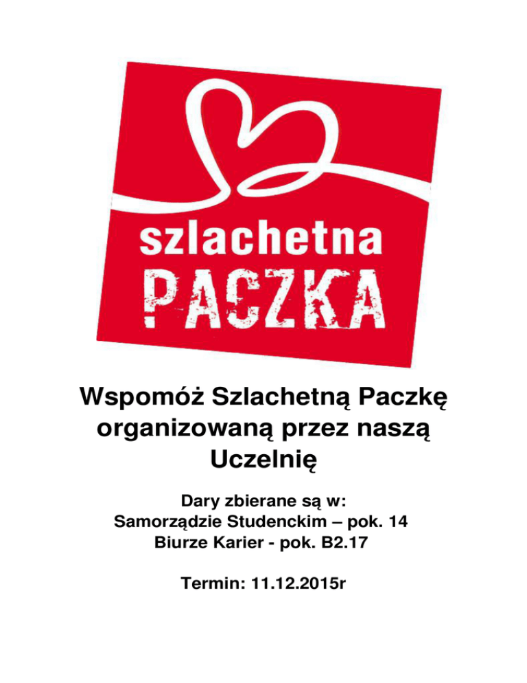 Wspomóż Szlachetną Paczkę organizowaną przez naszą Uczelnię Dary zbierane są w: Samorządzie Studenckim – pok. 14 Biurze Karier pok. B2.17 Termin: 11.12.2015r I rodzina: W tym roku pomagamy: Magda, studentka naszej Uczelni samotnie wychowuje bliźniaków: Piotra (1,5 r.) i Jacka (1,5 r.). Magda, przed znalezieniem się w trudnej sytuacji, pracowała w warsztacie samochodowym oraz zaczęła studia zaoczne. Sytuacja radykalnie się zmieniła, kiedy urodziły się bliźniaki, a ojciec dzieci niespodziewanie zostawił rodzinę. Rodzina żyje w skromnej kawalerce utrzymując się jedynie z zasiłku dla bezrobotnych oraz dopłaty do mieszkania. Dochód na jednego członka rodziny wynosi zaledwie 110 zł. Matka stara się o alimenty. Pani Magda studiuje zaocznie oraz dba aby dzieciom było jak najlepiej. Chciałaby również zrobić kurs sekretarki, aby, gdy dzieci podrosną, móc podjąć pracę w tym kierunku. Kobieta, pomimo trudnej sytuacji w jakiej się znalazła, ma silną osobowość i patrzy pozytywnie na świat. Rodzice Pani Magdy są jedynym wsparciem, na które może liczyć w każdej sytuacji. Wśród najważniejszych potrzeb Pani Magda wskazała żywność, która znacząco obciąża budżet. Przy dwójce dzieci dla kobiety równie ważne są pampersy oraz odzież, z której chłopcy szybko wyrastają. POTRZEBY: Najważniejsze potrzeby to: 1. Żywność dla dzieci 2. Pampersy 3. Odzież dla maluchów Produkty żywnościowe: Herbata, Ryż, Kasza, Makaron, Mąka, Cukier, Olej, Dżem, Konserwy mięsne i rybne, Warzywa w puszkach, Kawa, Kisiel, Słodycze, Produkty dla niemowląt: Mleko nan pro 3, kaszki, deserki Środki czystości: Proszek do prania, Płyny czyszczące, Płyn do mycia naczyń, Szampon, Szczoteczka do zębów, Mydło/żel myjący Artykuły dziecięce: pampersy (rozm. 4+ i 5), kremy, balsamy Wyposażenie mieszkania: Kołdra, Koc, Poduszka, Pościel, Ręczniki, kołdra na łóżko dla dzieci, dywanik do pokoju dzieci Brakujące sprzęty: Prodiż (niestety piekarnik nie działa), sokowirówka Specjalne upominki: zabawki, perfumy ODZIEŻ I OBUWIE: Potrzebujący Magda Piotr i Jacek Wiek 21 1,5 Rozmiar M 94/98 Co potrzebuje Kurtka zimowa Body, spodnie, piżamka