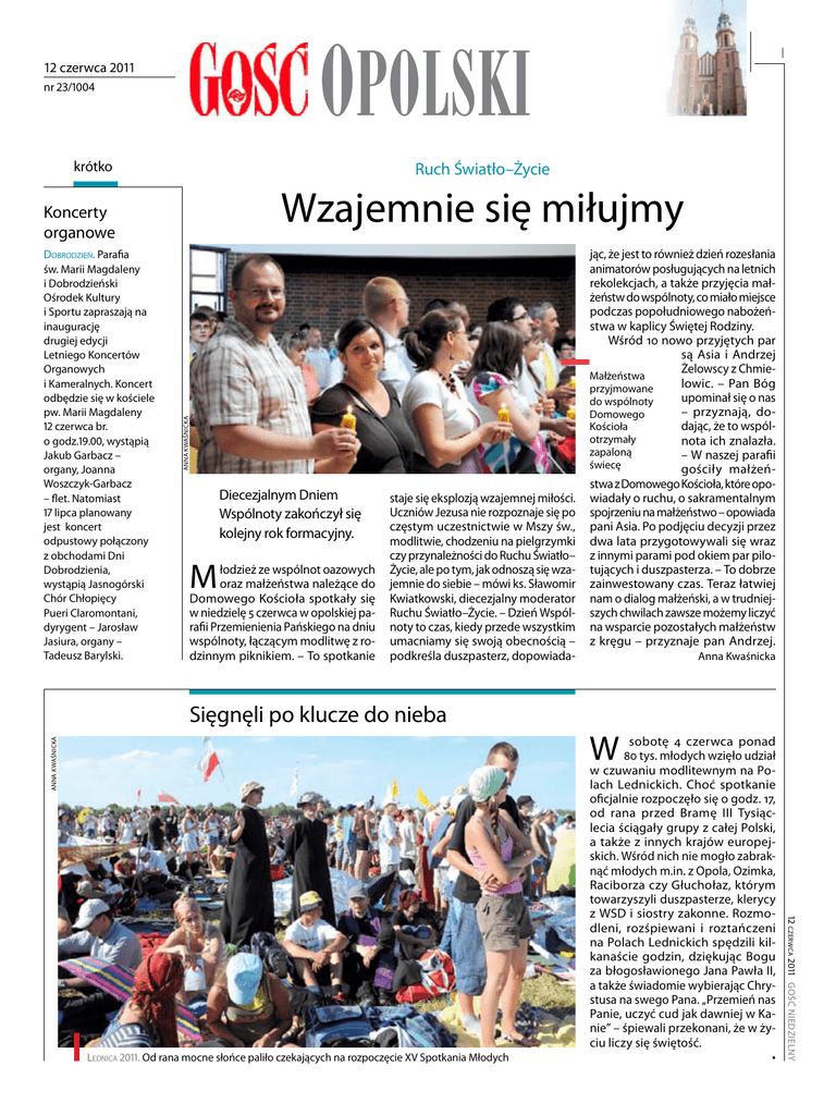 I 12 czerwca 2011 nr 23/1004 krótko Ruch Światło–Życie Wzajemnie się miłujmy Dobrodzień. Parafia św. Marii Magdaleny i Dobrodzieński Ośrodek Kultury i Sportu zapraszają na inaugurację drugiej edycji Letniego Koncertów Organowych i Kameralnych. Koncert odbędzie się w kościele pw. Marii Magdaleny 12 czerwca br. o godz.19.00, wystąpią Jakub Garbacz – organy, Joanna Woszczyk-Garbacz – flet. Natomiast 17 lipca planowany jest koncert odpustowy połączony z obchodami Dni Dobrodzienia, wystąpią Jasnogórski Chór Chłopięcy Pueri Claromontani, dyrygent – Jarosław Jasiura, organy – Tadeusz Barylski. Anna Kwaśnicka Koncerty organowe Diecezjalnym Dniem Wspólnoty zakończył się kolejny rok formacyjny. M łodzież ze wspólnot oazowych oraz małżeństwa należące do Domowego Kościoła spotkały się w niedzielę 5 czerwca w opolskiej parafii Przemienienia Pańskiego na dniu wspólnoty, łączącym modlitwę z rodzinnym piknikiem. – To spotkanie staje się eksplozją wzajemnej miłości. Uczniów Jezusa nie rozpoznaje się po częstym uczestnictwie w Mszy św., modlitwie, chodzeniu na pielgrzymki czy przynależności do Ruchu Światło– Życie, ale po tym, jak odnoszą się wzajemnie do siebie – mówi ks. Sławomir Kwiatkowski, diecezjalny moderator Ruchu Światło–Życie. – Dzień Wspólnoty to czas, kiedy przede wszystkim umacniamy się swoją obecnością – podkreśla duszpasterz, dopowiada- Anna Kwaśnicka Sięgnęli po klucze do nieba W sobotę 4 czerwca ponad 80 tys. młodych wzięło udział w czuwaniu modlitewnym na Polach Lednickich. Choć spotkanie oficjalnie rozpoczęło się o godz. 17, od rana przed Bramę III Tysiąclecia ściągały grupy z całej Polski, a także z innych krajów europejskich. Wśród nich nie mogło zabraknąć młodych m.in. z Opola, Ozimka, Raciborza czy Głuchołaz, którym towarzyszyli duszpasterze, klerycy z WSD i siostry zakonne. Rozmodleni, rozśpiewani i roztańczeni na Polach Lednickich spędzili kilkanaście godzin, dziękując Bogu za błogosławionego Jana Pawła II, a także świadomie wybierając Chrystusa na swego Pana. „Przemień nas Panie, uczyć cud jak dawniej w Kanie” – śpiewali przekonani, że w życiu liczy się świętość. • 12 czerwca 2011 Gość Niedzielny Lednica 2011. Od rana mocne słońce paliło czekających na rozpoczęcie XV Spotkania Młodych jąc, że jest to również dzień rozesłania animatorów posługujących na letnich rekolekcjach, a także przyjęcia małżeństw do wspólnoty, co miało miejsce podczas popołudniowego nabożeństwa w kaplicy Świętej Rodziny. Wśród 10 nowo przyjętych par są Asia i Andrzej Żelowscy z ChmieMałżeństwa lowic. – Pan Bóg przyjmowane upominał się o nas do wspólnoty – przyznają, doDomowego Kościoła dając, że to wspólotrzymały nota ich znalazła. zapaloną – W naszej parafii świecę gościły małżeństwa z Domowego Kościoła, które opowiadały o ruchu, o sakramentalnym spojrzeniu na małżeństwo – opowiada pani Asia. Po podjęciu decyzji przez dwa lata przygotowywali się wraz z innymi parami pod okiem par pilotujących i duszpasterza. – To dobrze zainwestowany czas. Teraz łatwiej nam o dialog małżeński, a w trudniejszych chwilach zawsze możemy liczyć na wsparcie pozostałych małżeństw z kręgu – przyznaje pan Andrzej. Anna Kwaśnicka gość opolski gość opolski ks. Bogdan Zientara Akcja społeczna. Na przełomie czerwca i lipca Sejm będzie debatował nad obywatelskim projektem ustawy zakazującej aborcji bez żadnych wyjątków, przygotowanym przez obrońców życia, skupionych wokół Fundacji Pro. Zadzwoń do swojego posła i spróbuj przekonać go do poparcia tego projektu. Argumenty, których możesz użyć w rozmowie, oraz szczegóły akcji na str. 20–23. Oto kontakty do posłów z naszego regionu: Andrzej Buła (PO) – 77/4474555, Lena Dąbkowska-Cichocka (PJN) – 77/4410709, Ryszard Galla (MN) – 77/4544466, Tomasz Garbowski (SLD) – 77/4418479, Tadeusz Jarmuziewicz (PO) – 77/4565100, Sławomir Kłosowski (PiS) – 77/4413222, Adam Krupa (PO) – 77/4850011, Leszek Korzeniowski (PO) – 77/4565790, Janina Okrągły (PO) – 77/4360789, Stanisław Rakoczy (PSL) – 77/4471240, Jan Religa (PiS) – 77/4834539, Łukasz Tusk (PO) – 77/4102347, Robert Węgrzyn (niezrzeszony) – 77/4834528. Uczestnicy zawodów na koniec zrobili sobie pamiątkowe zdjęcie Dekanat otmuchowski. W sobotę na boisku sportowym w parafii Nawiedzenia NMP w Goworowicach odbyły się zawody Liturgicznej Służby Ołtarza (chłopców i dziewcząt) dekanatu otmuchowskiego w strzelaniu z broni pneumatycznej. Na zaproszenie ks. proboszcza Bogdana Zientary i parafian z Goworowic z dekanatu otmuchowskiego na zawody przyjechały drużyny Między Słowami Zadzwoń do posła z Kamiennika, Szklar, Goświnowic i Ratnowic. Każdy z zawodników strzelał z czterech różnych rodzajów broni pneumatycznej. Na zakończenie zawodów laureaci turnieju otrzymali medale i pamiątkowe dyplomy. Wszyscy uczestnicy po zawodach zostali poczęstowani kiełbaską z grilla i smacznym domowym ciastem upieczonym przez panie z Goworowic. Wszystko dla dzieci wały się procesje do krzyży, a we wtorkowy wieczór kilkudziesięciu mieszkańców Bierkowic zebrało się w ogrodzie państwa Knosalów na Mszy św., którą odprawił ks. Erwin Mateja, proboszcz parafii św. Michała Archanioła w Opolu-Półwsi. Po Eucharystii odmówiono Litanię do Wszystkich Świętych, prosząc o urodzaje. W święto Nawiedzenia NMP w Eucharystii odprawionej pod gołym niebem uczestniczyło kilkadziesiąt osób Zabawa była świetna C a r i ta s D i e c e z j i O p o l s k i e j . W ogrodach Centrum Rehabilitacji dla Dzieci z okazji Dnia Dziecka odbył się festyn, na który zaproszeni zostali wszyscy pacjenci, obecni i byli. Przez kilka godzin prawie 300-osobowa grupa dzieci, ich rodziców i dziadków miała okazję spotkać się ze znajomymi, uczestnic