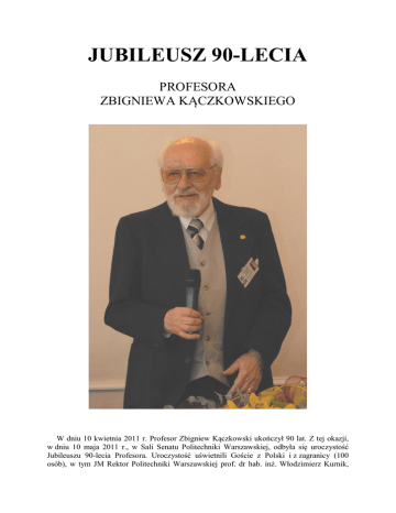 JUBILEUSZ 90-LECIA PROFESORA ZBIGNIEWA KĄCZKOWSKIEGO W dniu 10 kwietnia 2011 r. Profesor Zbigniew Kączkowski ukończył 90 lat. Z tej okazji, w dniu 10 maja 2011 r., w Sali Senatu Politechniki Warszawskiej, odbyła się uroczystość Jubileuszu 90-lecia Profesora. Uroczystość uświetnili Goście z Polski i z zagranicy (100 osób), w tym JM Rektor Politechniki Warszawskiej prof. dr hab. inż. Włodzimierz Kurnik, Prorektor prof. dr hab. inż. Roman Gawroński oraz Prezes Polskiej Akademii Nauk prof. dr hab. inż. Michał Kleiber . Laudację na cześć Jubilata, pt. Dziecko Szczęścia, wygłosił prof. Grzegorz Jemielita. Jubilat – w sposób niezwykle interesujący – przedstawił bogato ilustrowaną slajdami, historię swojej rodziny. Tytuł przemówienia Profesora był bardzo wymowny, po prostu XC. Na Jubileusz została wydana Księga Pamiątkowa z pracą doktorską Profesora z 1953 r. w języku polskim i angielskim. W preambule do tej pracy napisaliśmy poniższe zdania. DRODZY CZYTELNICY W dniu 10 kwietnia 2011 r. Profesor Zbigniew Kączkowski ukończył 90 lat. Z okazji tego pięknego Jubileuszu oddajemy do Waszych rąk niezwykłą pracę doktorską z 1953 roku Obliczanie płyt anizotropowych metodą nakładania ugięć fałdowych humanisty, konstruktora, uczonego, wspaniałego Człowieka, naszego Mistrza i Nauczyciela PROFESORA ZBIGNIEWA SZCZEPANA KĄCZKOWSKIEGO. Mija 58 lat od momentu powstania tej, jakże pomysłowej i pięknej pracy. Naszym zdaniem, ta pionierska praca nie straciła nic na wartości, co więcej twierdzimy, że nie została w pełni wykorzystana przez następnych badaczy. Z uwagi na piękno i ważność pracy doktorskiej Profesora, chcieliśmy zorganizować uroczyste odnowienie doktoratu, ale niestety stało się to niemożliwe, gdyż Profesor bronił pracę na Politechnice Gdańskiej, a Statut tej zasłużonej dla nauki uczelni, nie przewiduje tego typu uroczystości. Żywimy nadzieję, że Senat Politechniki Gdańskiej zmieni Statut i na Jubileuszu 95-lecia lub 100-lecia odnowimy ten doktorat. Profesorowi życzymy 120 lat życia, a Państwu miłej lektury. Poniżej przedstawiamy notkę biograficzną Profesora. Profesor Zbigniew Szczepan Kączkowski urodził się 10 kwietnia 1921 r. w Krakowie. Wymieńmy kilka znaczących dat Jego kariery naukowej: 1945-1949 – studia na Wydziale Inżynierii Lądowej i Wodnej Politechniki Gdańskiej, 1950 – niespełna rok po ukończeniu studiów zostaje Kierownikiem Katedry Wytrzymałości Materiałów i Mechaniki Budowli w Szkole Inżynierskiej w Szczecinie, 1954 – rozpoczyna pracę w kierowanej przez Profesora Witolda Nowackiego Katedrze Mechaniki Budowli na Wydziale Budownictwa Przemysłowego Politechniki Warszawskiej, W tym samym roku broni na Politechnice Gdańskiej pracę doktorską „Obliczenie płyt anizotropowych metodą nakładania ugięć fałdowych”, 1955 – zostaje Kierownikiem Katedry Mechaniki Budowli na Politechnice Warszawskiej, 1957 – otrzymuje tytuł profesora nadzwyczajnego, 1957 – wchodzi w skład Komitetu Organizacyjnego Członków Założycieli Polskiego Towarzystwa Mechaniki Teoretycznej i Stosowanej, powstaje Polskie Towarzystwo Mechaniki Teoretycznej i Stosowanej (rejestracja 1958 r.), którego jest aktywnym członkiem do dzisiaj, 1972 – otrzymuje tytuł profesora zwyczajnego, 1978 – otrzymuje godność Członka Honorowego Polskiego Towarzystwa Mechaniki Teoretycznej i Stosowanej, 1983 – odchodzi na emeryturę. Krótki przegląd osiągnięć naukowych Profesora Kączkowskiego dowodzi, że jego znaczący wkład w rozwój polskiej mechaniki jest nie do przecenienia. Prof. Z. Kączkowski napisał 17 monografii i podręczników, oraz ponad 120 prac, rozpraw i raportów naukowych. W pracy naukowej w wielu dziedzinach mechaniki Z. Kączkowski uzyskał wiele wartościowych i uznanych wyników. Szczególnie znane są Jego osiągnięcia w zakresie mechaniki prętów, tarcz, płyt i powłok, w zakresie sprężystym i termosprężystym. Książka Profesora Metoda Crossa (napisana wspólnie z S. Błaszkowiakiem) została przetłumaczona na język angielski i wydana pod tytułem Iterative Methods in Structural Analysis. Profesor Z. Kączkowski uzyskał wiele wartościowych nagród za osiągnięcia naukowe i dydaktyczne, w tym sześciokrotnie nagrodę Ministra Edukacji. W roku 1984 otrzymał specjalną nagrodę Ministra Budownictwa za drugie wydanie książki Płyty. Obliczenia statyczne. Książka ta została także przetłumaczona na język rosyjski. W roku 2007 Profesor Z. Kączkowski został nagrodzony medalem nr.1 Inżynierii Lądowej Politechniki Warszawskiej. Wydziału W roku 2007 Profesor Z. Kączkowski został także nagrodzony medalem Polskiego Towarzystwa Mechaniki Komputerowej im. O.C. Zienkiewicza za całokształt działalności. Istotnym elementem pracy Profesora są recenzje prac naukowych (795) oraz rozpraw doktorskich i dorobku naukowego przy awansach habilitacyjnych i profesorskich (147). Bardzo ważną dziedziną działalności Profesora Z. Kączkowskiego jest kształcenie młodej kadry naukowej. Jest on promotorem 24 rozpraw doktorskich. Niektórzy z Jego doktorantów są już profesorami. Profesor Z. Kączkowski jest również członkiem Polskiego Towarzystwa Matematycznego, członkiem założycielem i American Mathematical Society. Wiele informacji biograficznych o Profesorze Zbigniewie Kączkowskim, wraz z komentarzami i anegdotami, znaleźć można w książce wydanej z okazji Jubileuszu 85-lecia, wydanej przez Oficynę Wydawniczą Politechniki Warszawskiej w roku 2006. Wojciech Gilewski Grzegorz Jemielita