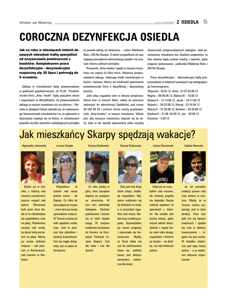 Widok ze Skarpy www.smnaskarpie.pl z osiedla 5 Coroczna dezynfekcja osiedla Jak co roku w miesiącach letnich do naszych mieszkań trafią specjaliści od oczyszczania pomieszczeń z insektów. Kompleksowe prace dezynfekcyjno - dezynsekcyjne rozpoczną się 30 lipca i potrwają do 5 września. Zabiegi w mieszkaniach będą przeprowadzane w godzinach popołudniowych, od 15.30 . Przedstawiciele firmy „Anty- Insekt” będą specjalnie ubrani i wyposażeni w identyfikatory. Za przeprowadzenie zabiegu w naszym mieszkaniu nic nie płacimy – Niestety w ubiegłych latach zdarzało się, że wykorzystując łatwowierność mieszkańców i to, że ogłoszenie o dezynsekcji znajduje się na klatce, w mieszkaniach pojawiło się kilku oszustów wyłudzających pieniądze za pseudo-zabieg od lokatorów. – mówi Waldemar Reks z SM Na Skarpie. O takich przypadkach od razu najlepiej powiadomić administrację osiedla i nie wręczać nikomu żadnych pieniędzy. Pracownik „Anty-insektu” spędzi w naszym mieszkaniu nie więcej niż kilka minut. Ułatwimy przeprowadzenie zabiegu zdejmując kratki wentylacyjne w kuchni i łazience. Mamy też możliwość poproszenia przedstawiciela firmy o dezynfekcję i dezynsekcję piwnicy. Jeśli urlop wypadnie nam w okresie przeprowadzania prac w naszym bloku, należy po powrocie zadzwonić do administracji Spółdzielni, pod numer 56 648 69 50 i umówić termin wizyty przedstawiciela „Anty-Insektu” w naszym mieszkaniu. Ważne jest, aby wszyscy mieszkańcy włączyli się do akcji, tylko w ten sposób zapewniamy sobie wysoką skuteczność przeprowadzanych zabiegów. Jeśli pozostawimy mieszkania bez działania preparatów, to tam właśnie będą uciekać insekty z rejonów, gdzie preparat zastosowano.- podkreśla Waldemar Reks z SM Na Skarpie. Prace dezynfekcyjno – dezynsekcyjne będą przeprowadzane w kolejnych posesjach wg następującego harmonogramu: Wojciech - 30.07.12, Anna - 31.07-03.08.12 Regina – 06-09.08.12, Bożena III – 10.08.12 Bożena II – 13-14.08.12, Jacek – 16-17.08.12 Bożena I – 20-22.08.12, Maciej - 23-24.08.12 Maciej II – 27-28.08.12, Karolina – 29-30.08.12 Karolina II – 31.08.-03.09.12, Jan - 04.09.12 Krystyna – 5.09.12 . Jak mieszkańcy Skarpy spędzają wakacje? Agnieszka Janowska Byłam już w tym roku z rodziną nad morzem, a przed nami jeszcze wyjazd nad jezioro. Słonecznie było przez dwa dni, ale w te chłodniejsze też spędzaliśmy czas na plaży. Wybieramy wczasy nad wodą, bo dzieci lubią się bawić na plaży. Mamy już swoje ulubione miejsca – nad jeziorem w Kamionkach, nad morzem w Darłowie. Lucyna Grzęda Wyjeżdżam za tydzień nad nasze polskie morze – do Sopotu. Co kilka lat odwiedzam to miasto – mam tam już swoje sprawdzone miejsce. W Toruniu zresztą też miło spędzam wolny czas. Jest tu przecież tyle zabytków i atrakcji kulturalnych. Coś się ciągle dzieje, więc jest to jakaś alternatywa. Krystyna Bratkowska Danuta Rutkowska Łukasz Okuniewski Co roku jeżdżę w góry, choć zaczęłam dopiero po przejściu na emeryturę. W tym roku odwiedzę Zakopane. Kocham podróżować i staram się to robić dopóki mogę. W sierpniu wybieram się jeszcze do Krynicy na Europejski Festiwal im. Jana Kiepury. Coś dla ciała i coś dla ducha! Dziś jest mój drugi dzień urlopu, niedługo wyjeżdżam. Najpierw wybieram się do koleżanki na wieś, a w przyszłym tygodniu nad morze. Bardzo liczę na dobrą pogodę. Sprawdzałam już nawet prognozy i zapowiada się fantastycznie. Myślę, że Toruń także ma coś do zaoferowania latem np.: pobliski basen jest dobrym pomysłem, zwłaszcza dla dzieci. Urlop już za mną – byłem nad morzem, ale niestety pogoda nie dopisała. Resztę wakacji spędzam na spacerach z dziećmi. Na osiedlu jest trochę miejsc, gdzie można zabrać dzieci. Jednak z reguły kiedy mam tylko okazję, wyjeżdżam z dziećmi za miasto – na działkę, czy nad okoliczne jeziora. Izabela Nowicka Ja od początku wakacji prawie cały czas jestem w mieście. Myślę, że w Toruniu można wypocząć, jest tu dużo atrakcji. Poza tym jeśli ma się fajnych znajomych i spędza się czas w dobrym towarzystwie – nigdzie nie jest nudno. W dodatku właściwie pod ręką mamy jezioro – a ja wybieram aktywny wypoczynek.