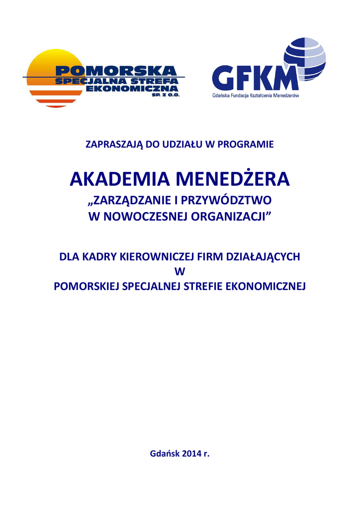 ZAPRASZAJĄ DO UDZIAŁU W PROGRAMIE AKADEMIA MENEDŻERA „ZARZĄDZANIE I PRZYWÓDZTWO W NOWOCZESNEJ ORGANIZACJI” DLA KADRY KIEROWNICZEJ FIRM DZIAŁAJĄCYCH W POMORSKIEJ SPECJALNEJ STREFIE EKONOMICZNEJ Gdańsk 2014 r. CELE I METODYKA PROGRAMU AKADEMIA MENEDŻERA „ZARZĄDZANIE I PRZYWÓDZTWO W NOWOCZESNEJ ORGANIZACJI” Program szkoleniowy prezentowany w niniejszej ofercie kierowany jest do Kadry Menedżerskiej Firm działających w Pomorskiej Specjalnej Strefie Ekonomicznej. Celem programu jest znaczące i widoczne podniesienie skuteczności zarządczej Kadry Kierowniczej poprzez: 1. Znaczące i widoczne rozwinięcie kompetencji menedżerskich, kierowniczych i przywódczych 2. Wypracowanie oczekiwanych standardów zarządzania wspierających rozwój firmy 3. Wymiana doświadczeń i pomysłów z menedżerami reprezentującymi inne firmy i branże 4. Zwiększenie pewności i skuteczności działania poprzez znaczący wzrost umiejętności zarządzania biznesem i kierowania ludźmi 5. Wzmocnienie motywacji do działania, przyspieszenie ścieżki kariery zawodowej . Program ma charakter spójnego i konsekwentnego procesu. Poszczególne sesje koncentrują się na kluczowych kompetencjach menedżerskich, kierowniczych i przywódczych. Program stanowi całościową prezentację kluczowych kompetencji niezbędnych w nowoczesnej, rozwijającej się organizacji. Każda sesja daje uczestnikom możliwość przećwiczenia rozwijanych umiejętności, a także wypracowania standardów działania i planów ich upowszechnienia w swojej firmie. Pod koniec każdej sesji uczestnicy planują wykorzystanie wniosków ze szkolenia w postaci indywidualnych lub zespołowych Zadań Międzymodułowych (ZMM). Realizacja ZMM jest omawiana i ocenia na początku każdej kolejnej sesji. Możliwe jest także wsparcie coachingowe ze strony profesjonalnych coachów biznesu. Program realizowany jest przy pomocy metodyki Activity Based Learning (warsztatu partycypacyjnego i treningu menedżerskiego). Metodologia ta uważana jest za najskuteczniejszą metodę rozwijania wiedzy i umiejętności menedżerskich, kierowniczych i przywódczych. Podstawowym założeniem metodologii ABL jest stwierdzenie, że proces rozwijania kompetencji odbywa się poprzez aktywne działanie i doświadczenie. W trakcie programu szkoleniowego realizowane jest to poprzez stałe powiązanie doświadczenia treningowego (symulacje, przykłądy, analizy przypadków, gry decyzyjne, zadania indywidualne i zespołowe) z możliwością stosowania nabywanych umiejętności w codziennej pracy. Dzięki temu uczestnicy programu mają możliwość szybkiego wykorzystania nowych kompetencji w firmie i upewniania się o skuteczności swojego działania. W trakcie sesji szkoleniowych trenerzy GFKM tworzą otwartą atmosferę wspólnej pracy, co umożliwia menedżerom dokonanie oceny skuteczności swoich działań, a w konsekwencji określenie obszarów rozwojowych. Komentarze i uwagi na temat udziału w szkoleniu ułatwiają przeniesienie nabytych umiejętności do codziennej pracy, a także wzmacniają potrzebę ciągłej samooceny i doskonalenia własnego warsztatu profesjonalnego. 2 SESJA I ZARZĄDZANIE ORGANIZACJĄ. WARSZTAT MENEDŻERSKI Z WYKORZYSTANIEM SYMULACYJNEJ GRY DECYZYJNEJ Cele sesji: Kształtowanie całościowego spojrzenia na funkcjonowanie organizacji. Zaprezentowanie i przetrenowanie nowoczesnych narzędzi zarządzania firmą z uwzględnieniem celów finansowych. Nabycie umiejętności analizowania, planowania i kontroli, jako działań naturalnych i niezbędnych w procesie zarządzania przedsiębiorstwem. Przyspieszenie procesu zdobywania doświadczenia w zakresie zarządzania przedsiębiorstwem w oparciu o informacje finansowe. Umożliwienie sprawdzenia umiejętności doradczych i menedżerskich poprzez zespołowe działanie w cyklu: wyniki – decyzje. Korzyści dla uczestników: Pogłębienie zrozumienia istoty zarządzania przedsiębiorstwem oraz ważności integracji procesów zachodzących między jego obszarami funkcjonalnymi, ukierunkowanymi na sprawne osiąganie założonych celów. Doskonalenie umiejętności przeprowadzania samodzielnej analizy sytuacji finansowej firmy w zakresie oceny rentowności, płynności oraz wykorzystania zasobów. Rozpoznawania siły oddziaływania poszczególnych czynników decydujących o sukcesie produktów na rynku. Dokonywania wyboru priorytetów działania przy ograniczonych zasobach rzeczowych, ludzkich i finansowych. Wykształcenie umiejętności prognozowania przyszłej sytuacji przedsiębiorstwa z jednoczesnym wnioskowaniem i podejmowaniem trafnych decyzji. Dokonywanie wyboru zastosowania efektywnych technik zarządzania finansami i kosztami w celu poprawy systemu kontroli produktywności i wyniku przedsiębiorstwa. Rozwinięcie umiejętności współpracy w zespole - grupowego podejmowania decyzji w warunkach presji czasu. Rozwiązywania dylematów zarządczych związanych z podejmowania trudnych decyzji dotyczących pracowników (zachowania nieetyczne, brak kompetencji pracowników, konflikty). 3 Zakres sesji: W trakcie warsztatu uczestnicy pracują w zespołach pełniących funkcje zarządów poszczególnych, konkurujących ze sobą przedsiębiorstw. Zespoły uczestników mają możliwość analizy podjętych działań, ponieważ rywalizują w cyklu decyzje - wyniki - decyzje wyniki. Każde przedsiębiorstwo na początku gry dysponuje takimi samymi zasobami materialnymi i finansowymi. Warsztat obejmuje 8 etapów decyzyjnych obejmujących szczegółowy zakres działań realizowanych przez kadrę zarządzającą i kierowniczą na przykładzie wirtualnej firmy. 1. SYMULACYJNA FIRMA – OCENA POZYCJI KONKURENCYJNEJ Analiza sytuacji rynkowej firmy Ocena kondycji finansowej firmy w kontekście jej możliwości działania na rynku Identyfikacja szans i zagrożeń występujących w otoczeniu Opracowanie prognozy 2. PLANOWANIE, WDRAŻANIE I KONTROLA STRATEGII ZARZĄDZANIA FIRMĄ Formułowanie misji ora