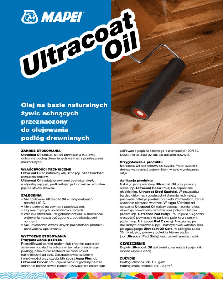 t a o l c i ra O t l U Olej na bazie naturalnych żywic schnących przeznaczony do olejowania podłóg drewnianych ZAKRES STOSOWANIA Ultracoat Oil stosuje się do powlekania warstwą ochronną podłóg drewnianych wewnątrz pomieszczeń mieszkalnych. WŁAŚCIWOŚCI TECHNICZNE Ultracoat Oil to naturalny olej schnący, bez zawartości rozpuszczalników. Ultracoat Oil nadaje drewnianej podłodze ciepły, rustykalny wygląd, podkreślając jednocześnie naturalne piękno słojów drewna. ZALECENIA • Nie aplikować Ultracoat Oil w temperaturach poniżej +10°C. • Nie stosować na zewnątrz pomieszczeń. • Używać czystych pojemników i narzędzi. • Warunki otoczenia i wilgotność drewna w momencie olejowania muszą być zgodne z obowiązującymi normami. • Nie umieszczać ewentualnych pozostałości produktu ponownie w opakowaniu. WYTYCZNE STOSOWANIA Przygotowanie podłoża Przeszlifować parkiet grubym lub średnim papierem ściernym i dokładnie odkurzyć tak, aby przecierając podłogę palcem nie zostawał na dłoni nawet najmniejszy ślad pyłu. Zaszpachlować szczeliny i nierówności przy użyciu Ultracoat Aqua Plus lub Ultracoat Binder. Po upływie około 1 godziny bardzo starannie przeszlifować parkiet, używając do ostatniego szlifowania papieru ściernego o ziarnistości 120/150. Dokładnie usunąć pył tak jak opisano powyżej. Przygotowanie produktu Ultracoat Oil jest gotowy do użycia. Przed użyciem dobrze wstrząsnąć pojemnikiem w celu wymieszania oleju. Aplikacja produktu Nałożyć jedną warstwę Ultracoat Oil przy pomocy wałka (np. Ultracoat Roller Plus) lub szpachelki gładkiej (np. Ultracoat Steel Spatula). W przypadku bardzo chłonnych powierzchni drewnianych należy ponownie nałożyć produkt po około 20 minutach, zanim wyschnie pierwsza warstwa. W ciągu 60 minut od nałożenia Ultracoat Oil należy usunąć nadmiar oleju, używając bawełnianej szmatki oraz polerki z białym padem (np. Ultracoat Pad Biały). Po upływie 16 godzin wyczyścić powierzchnię parkietu polerką z czarnym padem (np. Ultracoat Pad Czarny). Następnie, po dokładnym odkurzeniu pyłu, nałożyć dwie warstwy oleju pielęgnującego Ultracoat Oil Care, w odstępie około 30 minut, przy pomocy polerki z białym padem (np. Ultracoat Pad Białej) oraz bawełnianej szmatki. CZYSZCZENIE Dopóki Ultracoat Oil jest świeży, narzędzia i pojemniki można czyścić wodą. ZUŻYCIE Podłogi chłonne: ok. 150 g/m². Podłogi mało chłonne: ok. 70 g/m². DANE TECHNICZNE WŁAŚCIWOŚCI PRODUKTU Postać: płyn Kolor: ciemny Gęstość objętościowa: 0,85 g/m³ Minimalny czas oczekiwania między pierwszą a drugą warstwą: 20 minut Maksymalny czas oczekiwania na przetarcie bawełnianą szmatką: 60 minut Czas suszenia przed wypolerowaniem krążkiem i wykończeniem preparatem Ultracoat Oil Care: co najmniej 16 godzin OPAKOWANIA Ultracoat Oil jest dostępny w aluminiowych kanistrach o pojemności 2,5 l. PRZECHOWYWANIE Ultracoat Oil może być przechowywany przez 24 miesiące w oryginalnie zamkniętych opakowaniach i w suchym miejscu. Po otwarciu opakowania na powierzchni produktu tworzy się błona, zaś produkt twardnieje z upływem czasu. ŚRODKI OSTROŻNOŚCI I BEZPIECZEŃSTWA Ultracoat Oil nie jest klasyfikowany jako niebezpieczny zgodnie z aktualnymi przepisami dotyczącymi klasyfikacji mieszanin. Zaleca się stosowanie rękawic i okularów ochronnych, a także przestrzeganie standardowych środków ostrożności obowiązujących przy pracy z produktami chemicznymi. Materiały takie jak ściereczki czyszczące, papierowe ręczniki i odzież robocza zanieczyszczone produktem mogą ulec samozapłonowi po kilku godzinach. W celu uniknięcia ryzyka pożaru wszystkie zanieczyszczone materiały powinny być przechowywane w metalowych, szczelnie zamkniętych pojemnikach. Zanieczyszczone materiały należy składować poza pomieszczeniami produkcyjnymi. Więcej informacji w karcie charakterystyki. PRODUKT DLA PROFESJONALISTÓW. UWAGI Powyższe dane należy traktować wyłącznie jako ogólne wskazówki. Niezależne od nas warunki pracy i różnorodność materiałów wykluczają jakiekolwiek roszczenia wynikające z tych danych. W przypadku wątpliwości zalecane jest przeprowadzenie badań własnych. MAPEI udziela gwarancji jedynie co do niezmiennej jakości swoich produktów. Prosimy zawsze odnosić się do aktualnej wersji karty technicznej, dostępnej na stronie www.mapei.com. Referencje dotyczące produktu są dostępne na życzenie oraz na stronach www.mapei.com i www.mapei.pl Wszelkie prawa zastrzeżone. Kopiowanie tekstów, zdjęć i rysunków w całości lub w części bez zezwolenia zabronione. PARAMETRY UŻYTKOWE (w temperaturze +23ºC i wilgotności względnej 50%) 4611-02-2016 (PL) U at o c Oil a r lt ŚWIATOWY PARTNER W BUDOWNICTWIE