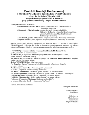 Protokół Komisji Konkursowej I OGÓLNOPOLSKIEGO KONKURSU POETYCKIEGO „Mój list do Świata” Sieradz 2008 zorganizowanego przez MBP w Sieradzu przy pomocy finansowej Urzędu Miasta Sieradza Komisja Konkursowa w składzie: Przewodniczący - Józef Baran, poeta – Stowarzyszenia Pisarzy Polskich, Oddział w Krakowie Członkowie – Maria Duszka, poetka - Związek Literatów Polskich, Oddział w Krakowie, opiekunka Koła Literackiego „Anima”, bibliotekarka Miejskiej Biblioteki Publicznej w Sieradzu; Anna Baśnik, poetka, bibliotekarka Miejskiej Biblioteki Publicznej w Sieradzu; Zbigniew Łuczak, poeta, dyrektor Miejskiej Biblioteki Publicznej w Sieradzu. oceniła zestawy 669 wierszy nadesłanych na konkurs przez 223 poetów z całej Polski, Wielkiej Brytanii i Niemiec. Do druku w almanachu pokonkursowym wybrano 102 wiersze autorstwa 50 poetów. Spośród wybranych nagrodzono i wyróżniono następujące osoby: I NAGRODĘ w wysokości 600zł otrzymuje Pani Renata Blicharz z Opola, godło „Latarnik”, za zestaw wierszy II NAGRODĘ w wysokości 400zł otrzymuje Pan Piotr Macierzyński z Łodzi, godło „Ruletka”, za zastaw wierszy III NAGRODĘ w wysokości 300zł otrzymuje Pan Mirosław Puszczykowski z Mogilna, godło „Nargis”, za zastaw wierszy siedem WYRÓŻNIEŃ po 100zł otrzymują: Pan Bogusław Cuch z Tomaszowa Lubelskiego, godło „Chartumes Esigas”, za zestaw wierszy Pani Katarzyna Spławska z Poznania, godło „Chimera”, za wiersz „Z wykładu bardzo ważnego profesora” Pan Artur Lewandowski z Sieradza, godło „Fiszka”, za zestaw wierszy Pan Jerzy Fryckowski z Dębnicy Kaszubskiej, godło „Garb”, za wiersz „Uczta bogów” Pani Marika Kmieć z Sieradza, godło „Inwersja”, za zestaw wierszy Pani Lidia Chmielewska z Kielc, godło „Joanna”, za zestaw wierszy Pani Anna Wojnarska-Maińska z Krakowa, godło „Liść”, za wiersze „Hieronim Bosch – reinkarnacja” i „Pióro”. Sieradz, 28 sierpnia 2008 roku Komisja Konkursowa Przewodniczący: Józef Baran Członkowie: Maria Duszka Anna Baśnik Zbigniew Łuczak Autorzy wyróżnieni drukiem w wydawnictwie pokonkursowym 1. 2. 3. 4. 5. 6. 7. 8. 9. Agnieszka Barczewska Dorota Bielska Wojciech Hieronim Borkowski Małgorzata Borzeszkowska Anna Brandeburg Mateusz Brucki Milena Bryszewska Katarzyna Buczyńska Bogusław Bujała 10. Grzegorz Chwieduk 11.Magdalena Cybulska 12.Agnieszka Ginko 13.Katarzyna Jeznach 14.Katarzyna Kaczmarek 15.Tomasz Karpiński 16.Krzysztof Kleszcz 17.Anna Kołaczek 18.Lech Lament 19.Dominika Majchrzak 20.Martyna Majewska 21.Czesław Markiewicz 22.Robert Miniak 23.Piotr Piątek 24.Paweł Podlipniak 25.Władysław Potakowski 26.Katarzyna Pytlewska 27.Ewa Radomska 28.Mariusz Jacek Rokita 29.Piotr Rowicki 30.Dorota Ryst 31.Magdalena Schatt 32.Małgorzata Stachowiak-Schreyner 33.Iwona Danuta Startek 34.Bogumił Staszek 35.Arkadiusz Stosur 36.Jędrzej Sudnikowicz 37. Agnieszka Tomczyszyn-Harasymowicz 38.Maria Twardowska 39.Piotr Zemanek 40.Adam Zemełka Wszystkim uczestnikom serdecznie gratulujemy! Tych zaproszonych, którzy nie mogli przybyć na nasze spotkanie finałowe w dniu 10 października 2008 roku, informujemy, że nagrody i tomiki autorskie przekażemy pocztą.