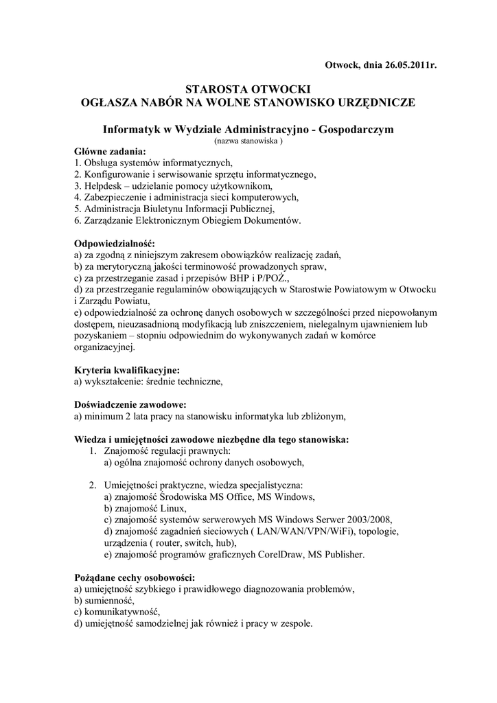 Otwock, dnia 26.05.2011r. STAROSTA OTWOCKI OGŁASZA NABÓR NA WOLNE STANOWISKO URZĘDNICZE Informatyk w Wydziale Administracyjno - Gospodarczym (nazwa stanowiska ) Główne zadania: 1. Obsługa systemów informatycznych, 2. Konfigurowanie i serwisowanie sprzętu informatycznego, 3. Helpdesk – udzielanie pomocy uŜytkownikom, 4. Zabezpieczenie i administracja sieci komputerowych, 5. Administracja Biuletynu Informacji Publicznej, 6. Zarządzanie Elektronicznym Obiegiem Dokumentów. Odpowiedzialność: a) za zgodną z niniejszym zakresem obowiązków realizację zadań, b) za merytoryczną jakości terminowość prowadzonych spraw, c) za przestrzeganie zasad i przepisów BHP i P/POś., d) za przestrzeganie regulaminów obowiązujących w Starostwie Powiatowym w Otwocku i Zarządu Powiatu, e) odpowiedzialność za ochronę danych osobowych w szczególności przed niepowołanym dostępem, nieuzasadnioną modyfikacją lub zniszczeniem, nielegalnym ujawnieniem lub pozyskaniem – stopniu odpowiednim do wykonywanych zadań w komórce organizacyjnej. Kryteria kwalifikacyjne: a) wykształcenie: średnie techniczne, Doświadczenie zawodowe: a) minimum 2 lata pracy na stanowisku informatyka lub zbliŜonym, Wiedza i umiejętności zawodowe niezbędne dla tego stanowiska: 1. Znajomość regulacji prawnych: a) ogólna znajomość ochrony danych osobowych, 2. Umiejętności praktyczne, wiedza specjalistyczna: a) znajomość Środowiska MS Office, MS Windows, b) znajomość Linux, c) znajomość systemów serwerowych MS Windows Serwer 2003/2008, d) znajomość zagadnień sieciowych ( LAN/WAN/VPN/WiFi), topologie, urządzenia ( router, switch, hub), e) znajomość programów graficznych CorelDraw, MS Publisher. PoŜądane cechy osobowości: a) umiejętność szybkiego i prawidłowego diagnozowania problemów, b) sumienność, c) komunikatywność, d) umiejętność samodzielnej jak równieŜ i pracy w zespole. 2 Wymagane dokumenty: - Ŝyciorys (CV ), - list motywacyjny, - kwestionariusz osobowy, - dokument poświadczający wykształcenie ( np. kserokopia dyplomu lub zaświadczenie o stanie odbytych studiów ), - kserokopie innych dodatkowych dokumentów potwierdzających kwalifikacje i umiejętności, - kserokopie świadectw pracy, - oświadczenie o niekaralności za umyślne przestępstwo ścigane z oskarŜenia publicznego lub umyślne przestępstwo skarbowe, - oświadczenie o posiadaniu pełnej zdolności do czynności prawnych oraz o korzystaniu z pełni praw publicznych, - oświadczenie odnośnie pracy w organach samorządu terytorialnego lub kserokopia zaświadczenia o zdaniu z wynikiem pozytywnym egzaminu kończącego słuŜbę przygotowawczą. 1. O zatrudnienie na wyŜej wymienionym stanowisku mogą ubiegać się: - tylko obywatele polscy, bowiem praca polega na bezpośrednim lub pośrednim udziale w wykonywaniu władzy publicznej i funkcji mających na celu ochronę generalnych interesów państwa*, - obywatele polscy i pozostałych krajów Unii Europejskiej oraz innych państw, którym na podstawie umów międzynarodowych lub przepisów prawa wspólnotowego przysługuje prawo do podjęcia zatrudnienia na terytorium Rzeczypospolitej Polskiej, pod warunkiem, Ŝe cudzoziemcy posiadają znajomość języka polskiego potwierdzoną dokumentem określonym w przepisach o słuŜbie cywilnej.* * niepotrzebne skreślić. Wymagane dokumenty aplikacyjne naleŜy składać - w terminie 14 dni od daty opublikowania ogłoszenia w Biuletynie Informacji Publicznej Starostwa Powiatowego w Otwocku ( www.powiat-otwocki.pl ), to jest do dnia 09 czerwca 2011r.– w Starostwie Powiatowym w Otwocku ul. Górna 13, 05-400 Otwock osobiście lub drogą pocztową; w przypadku posiadania uprawnień do podpisu elektronicznego dokumenty aplikacyjne moŜna przesłać na adres: [email protected]. Aplikacje, które wpłyną do Starostwa po terminie nie będą rozpatrywane. Informacja o wyniku naboru będzie umieszczona na stronie internetowej Biuletynu Informacji Publicznej Starostwa Powiatowego w Otwocku oraz na tablicy ogłoszeń w siedzibie Starostwa. Wymagane dokumenty aplikacyjne: list motywacyjny, szczegółowe CV ( z uwzględnieniem dokładnego przebiegu kariery zawodowej ), powinny być opatrzone klauzulą: wyraŜam zgodę na przetwarzanie moich danych osobowych zawartych w ofercie pracy dla potrzeb niezbędnych do realizacji procesu rekrutacji zgodnie z ustawą z dnia 29 sierpnia 1997r. o ochronie danych osobowych ( dz.U. z 2002r, nr 101, poz. 926 z p. zm. ) oraz ustawą z dnia21 listopada 2008r o pracownikach samorządowych ( Dz.U. nr 223, poz. 1458 ). 3
