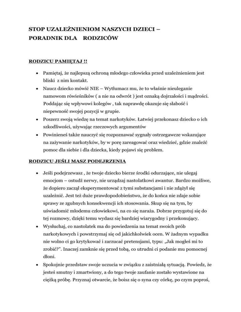 STOP UZALEŻNIENIOM NASZYCH DZIECI – PORADNIK DLA RODZICÓW RODZICU PAMIĘTAJ !! Pamiętaj, że najlepszą ochroną młodego człowieka przed uzależnieniem jest bliski z nim kontakt. Naucz dziecko mówić NIE – Wytłumacz mu, że to właśnie nieuleganie namowom rówieśników ( a nie na odwrót ) jest oznaką dojrzałości i mądrości. Poddając się wpływowi kolegów , tak naprawdę okazuje się słabość i niepewność swojej pozycji w grupie. Poszerz swoją wiedzę na temat narkotyków. Łatwiej przekonasz dziecko o ich szkodliwości, używając rzeczowych argumentów Powinieneś także nauczyć się rozpoznawać sygnały ostrzegawcze wskazujące na zażywanie narkotyków, by w porę zareagować oraz wiedzieć, gdzie znaleźć pomoc dla siebie i dla dziecka, kiedy pojawi się problem. RODZICU JEŚLI MASZ PODEJRZENIA Jeśli podejrzewasz , że twoje dziecko bierze środki odurzające, nie ulegaj emocjom – ostudź nerwy, nie urządzaj nastolatkowi awantur. Bardzo możliwe, że dopiero zaczął eksperymentować z tymi substancjami i nie zdążył się uzależnić. Jest też duże prawdopodobieństwo, że do końca nie zdaje sobie sprawy ze zgubnych konsekwencji ich stosowania. Skup się na tym, by uświadomić młodemu człowiekowi, na co się naraża. Dobrze przygotuj się do tej rozmowy, dzięki temu wydasz się bardziej wiarygodny i przekonujący. Wysłuchaj, co nastolatek ma do powiedzenia na temat swoich prób narkotykowych i powstrzymaj się od jakichkolwiek ocen. W żadnym wypadku nie wolno ci go krytykować i zarzucać pretensjami, typu: „Jak mogłeś mi to zrobić?”. Inaczej zamknie się przed tobą, co utrudni ci podanie mu pomocnej dłoni. Spokojnie przedstaw swoje uczucia w związku z zaistniałą sytuacją. Powiedz, że jesteś smutny i zmartwiony, a do tego twoje zaufanie zostało wystawione na ciężką próbę. Przyznaj otwarcie, że boisz się o syna czy córkę, po czym poproś, byście razem ustalili nowe zasady , na przykład : Młody człowiek ma wracać do domu przed godziną 22, dopóki się nie upewnisz, że znów możesz mu ufać; w razie twoich podejrzeń o dalsze branie nastolatek podda się testowi krwi i moczu. Jeśli zauważysz u swojego dziecka objawy przedawkowania, np.: omdlenia, majaki itd., nie wpadaj w panikę i nie próbuj akurat w tej chwili ustalać ich powodów. Natychmiast wezwij lekarza! Pomoc medyczna ( płukanie żołądka, odtrucie itd.) jest wtedy najważniejsza. Dopiero potem przyjdzie czas na poważną rozmowę. Jeśli okaże się, że dziecko sięga po określone środki od dawna i zaczęło być uzależnione, konieczna będzie profesjonalna terapia. RODZICU !! Jeśli twoje dziecko zostanie złapane na posiadaniu narkotyków, zostaje oskarżone o złamanie prawa i wprowadzone do akt policji. Przy pierwszej wpadce twoje dziecko może zostać ukarane upomnieniem lub grzywną. Jeśli jest w wieku między 10. a 17. rokiem życia, może stanąć przed sądem dla nieletnich. Warto pamiętać, że jako rodzic popełniasz przestępstwo, przymykając oko na niektóre sprawy. Jeśli wiesz, że twoje dziecko dzieli się ze znajomymi narkotykami w twoim domu i nic z tym nie robisz, popełniasz przestępstwo. Pozwolenie na palenie marihuany w twoim domu również jest przestępstwem. Jeśli zabierasz dziecku narkotyki – żeby powstrzymać je od popełniania dalszych przestępstw – musisz albo je zniszczyć, albo bezzwłocznie przekazać policji. Jeżeli tego nie zrobisz i będziesz w posiadaniu tych narkotyków ( nawet jeśli nie zamierzasz ich zażywać ), popełniasz przestępstwo. RODZICU!! NIE JESTEŚ SAM. POMOC OFERUJE: Ogólnopolski Narkotykowy Telefon Zaufania 801 199 990 czynny codziennie od 16 do 21, połączenie płatne 35 gr. Ma on w nazwie narkotyki, ale można dzwonić w sprawach związanych z dopalaczami, ponieważ te działają tak samo. Najbliższa w twojej okolicy Poradnia Psychologiczno-PedagogicznaPunkt Konsultacyjny ds. Narkomanii ul. Władysława Łokietka 2 APEL DO RODZICÓW!! Każdy z nas powinien mieć takie miejsce, gdzie może być sobą, gdzie jest wolny od krzywd, niebezpieczeństw, gdzie może się nie bać oddychać pełną piersią. Takim miejscem powinien być DOM. MAMO, TATO!! Możesz mi pomóc nie brać narkotyków i nie pić alkoholu, jeżeli: Nie porównujesz mnie z innymi. Mam prawo być inny i niedoskonały. Nie odbierasz mi nadziei. Chciałbym wierzyć, że coś w życiu osiągnę. Nie mówisz mi, jak mam się czuć. Potrzebuję twojego zrozumienia. Nie rozkazujesz mi. Wolę kiedy mnie zachęcasz. Potrafię z tobą współpracować, nawet jeżeli jestem mały. Nie wywołujesz we mnie poczucia winy. Nie jestem odpowiedzialny za problemy dorosłych. Nie używasz gróźb i nie straszysz. Wydaje mi się wtedy, że świat jest zły i nieprzyjazny. Nie kupujesz mnie. Pragnę twojej miłości za darmo. Nie oceniasz. Chciałbym myśleć o sobie dobrze. MAMO, TATO!! Wolę gdy: Słuchasz uważnie, kiedy coś opowiadam. Odkładasz gazetę, wyłączasz telewizor. Starasz się zrozumieć, co przeżywam, co się ze mną dzieję. Cieszysz się i smucisz razem ze mną. Zauważasz mnie w różnych sytuacjach: kiedy jestem wesoły i smutny, nie tylko wtedy, gdy coś zbroję. Rozmawiasz ze mną i pytasz, co myślę o niektórych sprawach, nie okłamujesz mnie, myśląc, że i tak nic nie zrozumiem. Razem ze mną ustalasz, co w domu należy do moich obowiązków. MAMO, TATO !! Rozmowy z dzieckiem: Uczą, jak wyrażać własne uczucia i potrzeby. Przerywają ich samotność. Dodają im wiary w siebie. Zmniejszają napięcie. GDZIE SZUKAĆ POMOCY !!! Istnieją również instytucje i organizacje, które dostarczają informacji o sieci profesjonalnej pomocy, prowadzą mini edukację, udzielają wsparcia psychologicznego oraz porad w sprawie ucznia: Używającego alkoholu: Infolinia AA – tel. 801 033 242 Fundacja „Dominik” – tel. (22) 853 52 22, środa – piątek w godzinach 16.30 – 19.30 Anonimowy Przyjaciel 