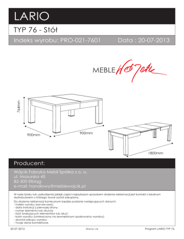 LARIO TYP 76 - Stół Data : 20-07-2013 764mm Indeks wyrobu: PRO-021-7601 900mm 900mm 1800mm Producent: Wójcik Fabryka Mebli Spółka z o. o. ul. Mazurska 45 82-300 Elbląg e-mail: [email protected] W razie braku lub uszkodzenia jakiejś części najszybszym sposobem złożenia reklamacji jest kontakt z lokalnym dystrybutorem u którego towar został zakupiony. Do złożenia reklamacji koniecznym będzie podanie następujących danych: - indeks wyrobu (xxx-xxx-xxxx); - data instrukcji z pierwszej strony; - numer elementu lub okucia; - ilość brakujących elementów lub okuć; - kolor wyrobu (umieszczony na zewnętrznym opakowaniu wyrobu); - dowód zakupu wyrobu; - Twoje dane kontaktowe. 20-07-2013 Strona 1/6 Program LARIO TYP 76 Proszę sprawdź kompletność okuć przed montażem. Upewnij się, że używasz odpowiednie elementy. MM 260 Okucia znajdujące się w paczce. 250 I3 N1 28 szt. Wkręt UP 4 x 20mm N2 20 szt. Wkręt US 3 x 16mm 240 78 szt. Wkręt US 3,5 x 16mm 230 220 O14 Q7 4 szt. Stopka nogi 80x80 R8 14 szt. Kątownik metalowy 16 szt. Kołek stabilizujący stołu 210 200 S13 S14 4 szt. Nakrętka 16x80 S15 8 szt. Szpilka M10x90 8 szt. Nakrętka motylkowa M10 190 180 S16 8 szt. Podkładka pod M10 S17 S18 4 szt. Obejma stołu. 6 szt. Klamra do blatów 170 160 T10 150 Schemat montażu nie jest dokumentacją techniczną. Producent zastrzega sobie 140 możliwość zmian konstrukcyjnych. Uwaga !!! Okucia trzymać z dala od dzieci. 2 szt. Prowadnica stołu 130 120 110 Elementy znajdujące się w paczkach. 1 2 Noga 4 szt. 4 Oskrzynia krótka 100 90 Płyta blatu 2 szt. 4 szt. 80 734x80x80 mm 365x100x28 mm 70 3 60 Oskrzynia długa 450x900x28 mm 2 szt. 50 5 730x100x28 mm Płyta wkładu blatu 40 2 szt. 30 20 450x900x28 mm 10 0 20-07-2013 Strona 2/6 Program LARIO TYP 76 Potrzebne Potrzebnenarzędzia. narzędzia. Schemat składania. Uwaga! S14 S14 Włóż nakrętkę “S13” w otwór znajdujący się u góry nogi “1”,a następnie poprzez otwory znajdujące się z brzegu nogi “1” wkręć 2 szpilki “S14” w taki sposób, aby trafić w otwór gwintowany nakrętki “S13”. S14 S14 S13 S13 1 4 szt. Wbij kołki stabilizujące stołu “R8” według rysunku oraz przykręć klamry stołu “S18” do blatu “4” za pomocą wkrętów “N1”. 1 R8 S18 N1 N1 N1 R8 S18 R8 S18 4 R8 1 szt. Wbij kołki stabilizujące stołu “R8” według rysunku oraz przykręć klamry stołu “S18” do blatu “4” za pomocą wkrętów “N2”. S18 R8 N2 N2 R8 S18 R8 R8 S18 20-07-2013 Strona 3/6 4 1 szt. Program LARIO TYP 76 2 Wbij kołki stabilizujące stołu “R8” według rysunku oraz przykręć klamry stołu “S18” do wkładu blatu “5” za pomocą wkrętów “N1 i N2”. N2 S18 R8 S18 S18 N2 N1 N1 N1 R8 R8 R8 R8 R8 S18 R8 S18 R8 S18 5 2 szt. 3 Przykręć kątownik “Q7”i metalowe do oskrzyń “3” i “4”. Q7 Q7 Q7 Q7 Q7 R8 2 R8 3 N2 2 szt. 2 szt. Q7 R8 Q7 Q7 R8 2 4 2 szt. Uwaga! Aby zablokować blaty należy zapiąć klamry “S18”. 4 4 S18 20-07-2013 Strona 4/6 Program LARIO TYP 76 5 S17 Zamocuj oskrzynie do blatów. 2 N2 Włóż obejmy stołu “S17” w otwory znajdujące się w oskrzyni długiej “3” i przykręć po jednym wkręcie “N2” (szkic 5.1. ). N2 Szkic 5.1. Dosuń oskrzynie krótką “2” wg rysunki i przykręć pozostałe wkręty “N2” w otwory obejmy “S17” Zamocuj oskrzynie do blatu wkręcając wkrętu “N2” przez kątowniki metalowe “Q7”. S17 Uwaga ! Przez jeden kątownik wkręcić dwa wkręty N2 3 “N2”, jeden do otworu w blacie drugi obok w podłużny otwór kątownika “Q7” (Szkic 5.3). Q7 2 N2 N2 Szkic 5.3. Szkic 5.2. S17 Q7 Q7 Q7 Q7 S17 Q7 Q7 2 3 2 Q7 4 Q7 Q7 4 3 Q7 2 Q7 S17 S17 2 Q7 Q7 6 Q7 Włożyć 4 sztuki nogi stołu “1” w miejsca utworzone pomiędzy oskrzyniami “2” oraz “3”. Montując elementy należy przełożyć końcówki szpilek “S14” przez otwory w obejmie stołu “S17”. Następnie nałożyć podkładkę “S16” na szpilkę i za pomocą nakrętki motylkowej “S15” 3 dokręcić nogę do obejmy. S15 S16 1 1 1 S16 S15 2 1 1 2 3 2 4 3 4 2 2 20-07-2013 Strona 5/6 Program LARIO TYP 76 7 Aby zamocować prowadnice należy przykręcić je do otworów w jednym blacie, a w drugim zamocować w pozycji ustalonej przez blat pierwszy. O14 1 1 I3 1 T10 I3 1 T10 Do nóg stołu „1" przykręć stopkę „O14" za pomocą wkrętów „I5" I3 I3 T10 I3 20-07-2013 I3 I3 I3 I3 Strona 6/6 O14 Program LARIO TYP 76 ! Uwaga ! Zasady użytkowania i konserwacji mebla. 1. Mebel powinien być użytkowany zgodnie z jego przeznaczeniem-w pomieszczeniach zamkniętych i zabezpieczonych przed działaniem warunków atmosferycznych. 2. Montaż wyrobu musi być wykonany zgodnie z załączoną instrukcją. 3. Wyrób nie może mieć zastosowania w saunie. 4. Mebel wykonany jest z płyty drewnopochodnej, należy chronić go przed bezpośrednim i długotrwałym kontaktem z wodą (w szczególności przed zalaniem), oraz przed wysoką temperaturą (np. odparzenia ). Wilgoć może wniknąć w materiał mebla i uszkodzić go. 5. Do czyszczenia powierzchni należy stosować lekko wilgotną, miękką tkaninę, następnie wytrzeć do sucha. 6. W przypadku powstania silniejszych zabrudzeń można użyć łagodnych środków myjących przeznaczonych do czyszczenia mebli. 7. Nie należy używać do czyszczenia aktywnych środków chemicznych (np. usuwających kamień, rdzę, środków do czyszczenia ceramiki itp.). 8. Za uszkodzenia powstałe w wyniku niestosowania się do powyższych zaleceń producent nie ponosi odpowiedzialności.