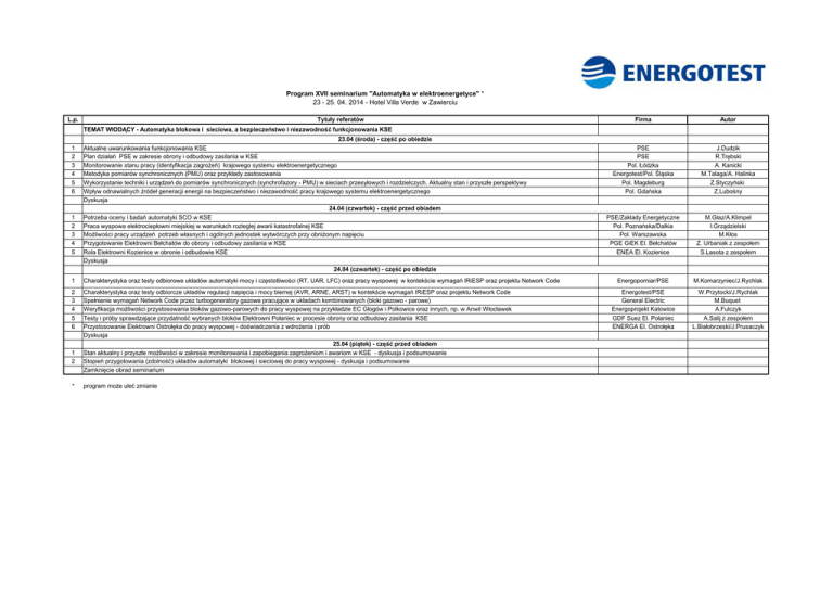 Program XVII seminarium "Automatyka w elektroenergetyce" * 23 - 25. 04. 2014 - Hotel Villa Verde w Zawierciu L.p. Tytuły referatów Firma Autor PSE PSE Pol. Łódzka Energotest/Pol. Śląska Pol. Magdeburg Pol. Gdańska J.Dudzik R.Trębski A. Kanicki M.Talaga/A. Halinka Z.Styczyński Z.Lubośny PSE/Zaklady Energetyczne Pol. Poznańska/Dalkia Pol. Warszawska PGE GiEK El. Bełchatów ENEA El. Kozienice M.Głaz/A.Klimpel I.Grządzielski M.Kłos Z. Urbaniak z zespołem S.Lasota z zespołem Energopomiar/PSE M.Komarzyniec/J.Rychlak Energotest/PSE General Electric Energoprojekt Katowice GDF Suez El. Połaniec ENERGA El. Ostrołęka W.Przytocki/J.Rychlak M.Buquet A.Fulczyk A.Salij z zespołem L.Białobrzeski/J.Prusaczyk TEMAT WIODĄCY - Automatyka blokowa i sieciowa, a bezpieczeństwo i niezawodność funkcjonowania KSE 1 2 3 4 5 6 1 2 3 4 5 23.04 (środa) - część po obiedzie Aktualne uwarunkowania funkcjonowania KSE Plan działań PSE w zakresie obrony i odbudowy zasilania w KSE Monitorowanie stanu pracy (identyfikacja zagrożeń) krajowego systemu elektroenergetycznego Metodyka pomiarów synchronicznych (PMU) oraz przykłady zastosowania Wykorzystanie techniki i urządzeń do pomiarów synchronicznych (synchrofazory - PMU) w sieciach przesyłowych i rozdzielczych. Aktualny stan i przyszłe perspektywy Wpływ odnawialnych źródeł generacji energii na bezpieczeństwo i niezawodność pracy krajowego systemu elektroenergetycznego Dyskusja 24.04 (czwartek) - część przed obiadem Potrzeba oceny i badań automatyki SCO w KSE Praca wyspowa elektrociepłowni miejskiej w warunkach rozleglej awarii katastrofalnej KSE Możliwości pracy urządzeń potrzeb własnych i ogólnych jednostek wytwórczych przy obniżonym napięciu Przygotowanie Elektrowni Bełchatów do obrony i odbudowy zasilania w KSE Rola Elektrowni Kozienice w obronie i odbudowie KSE Dyskusja 24.04 (czwartek) - część po obiedzie 1 Charakterystyka oraz testy odbiorowe układów automatyki mocy i częstotliwości (RT, UAR, LFC) oraz pracy wyspowej w kontekście wymagań IRiESP oraz projektu Network Code 2 3 4 5 6 Charakterystyka oraz testy odbiorcze układów regulacji napięcia i mocy biernej (AVR, ARNE, ARST) w kontekście wymagań IRiESP oraz projektu Network Code Spełnienie wymagań Network Code przez turbogeneratory gazowe pracujące w układach kombinowanych (bloki gazowo - parowe) Weryfikacja możliwości przystosowania bloków gazowo-parowych do pracy wyspowej na przykładzie EC Głogów i Polkowice oraz innych, np. w Anwil Włocławek Testy i próby sprawdzające przydatność wybranych bloków Elektrowni Połaniec w procesie obrony oraz odbudowy zasilania KSE Przystosowanie Elektrowni Ostrołęka do pracy wyspowej - doświadczenia z wdrożenia i prób Dyskusja 25.04 (piątek) - część przed obiadem Stan aktualny i przyszłe możliwości w zakresie monitorowania i zapobiegania zagrożeniom i awariom w KSE - dyskusja i podsumowanie Stopień przygotowania (zdolność) układów automatyki blokowej i sieciowej do pracy wyspowej - dyskusja i podsumowanie Zamknięcie obrad seminarium 1 2 * program może uleć zmianie