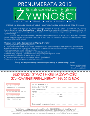 PRENUMERATA 2013 ● ROLNICTWO ● PRZEMYSŁ ● HANDEL ● ZDROWIE ● JAKOŚĆ PROFESJONALNE PISMO DLA FIRM SPOŻYWCZYCH ORAZ PRZEDSTAWICIELI URZĘDOWEJ KONTROLI ŻYWNOŚCI W szybko zmieniającym się świecie podstawą sukcesu w biznesie, nauce i administracji jest rzetelna i sprawdzona informacja. Bezpieczeństwo i Higiena Żywności to profesjonalne i niezależne czasopismo, które od 10 lat w przejrzysty sposób pomaga Czytelnikom podejmować trafne decyzje oraz poruszać się w meandrach prawa żywnościowego. Naszym celem jest przekazywanie obiektywnych informacji wszystkim uczestnikom łańcucha żywnościowego w celu zapewnienia bezpieczeństwa konsumenta. Z tego powodu stanowimy platformę spotkań biznesu, nauki i urzędowej kontroli żywności. Dlaczego warto czytać Bezpieczeństwo i Higienę Żywności? ● ● ● ● ● ● ● ● ● Publikujemy teksty wybitnych specjalistów. Zamieszczamy interpretacje rozporządzeń i przepisów prawa żywnościowego przygotowywane przez prawników. Analizujemy sytuacje z życia wzięte – (case study): producent/dystrybutor/inspektor pyta – prawnik odpowiada. Przeprowadzamy wywiady z liderami rynku. Przedstawiamy komentarze ekspertów na temat bieżącej sytuacji. Prezentujemy prognozy i opinie fachowców dotyczące poszczególnych branż. Informujemy o zmianach zachodzących na rynku. Tworzymy platformę wymiany poglądów, wiedzy i doświadczeń. Stanowimy forum nawiązywania relacji biznesowych. Zachęcam do prenumeraty – warto czerpać wiedzę ze sprawdzonego źródła! Tadeusz Wojciechowski Prezes zarządu Biuro Promocji Jakości BEZPIECZEŃSTWO I HIGIENA ŻYWNOŚCI ZAMÓWIENIE PRENUMERATY NA 2013 ROK Nazwa odbiorcy Biuro Promocji Jakości Sp. z o.o. ul. Resorowa 10, 02-956 Warszawa LICZBA PRENUMERAT: . . . . . . . . . . . . . . . . . . . . . . . . . . . . . . . . . . . . . . . . . OSOBA ZAMAWIAJĄCA: . . . . . . . . . . . . . . . . . . . . . . . . . . . . . . . . . . . . . . . . . nr rachunku odbiorcy ZLECENIODAWCA: 59 1160 2202 0000 0000 4947 8666 ADRES: . . . . . . . . . . . . . . . . . . . . . . . . . . . . . . . . . . . . . . . . . . . . . . . . . . . . . . tytułem NIP: . . . . . . . . . . . . . . . . . . . . . . . . . E-MAIL: ....................... TEL.: . . . . . . . . . . . . . . . . . . . . . . . . . . FAX: ....................... Prenumerata kwartalnika Bezpieczeństwo i Higiena Żywności 300 zł + 8% VAT (324 zł) ........................................... Data, pieczęć i podpis zleceniodawcy . . . . . . . . . . . . . . . . . . . . . . . . . . . . . . . . Wypełnij kupon i wyślij pocztą, e-mailem lub faksem: fax: (022) 55 00 720, e-mail: [email protected] Egzemplarze archiwalne można zamawiać indywidualnie, kontaktując się z działem kolportażu, tel. (022) 55 00 700. Warunkiem przyjęcia i realizacji zamówienia jest otrzymanie z banku potwierdzenia dokonania wpłaty przez prenumeratora na konto: Bank Millennium: 59 1160 2202 0000 0000 4947 8666, Biuro Promocji Jakości Sp. z o.o., ul. Resorowa 10, 02-956 Warszawa