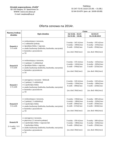 Telefony: 55 247-72-01 sezon (15.06. – 31.08.) 32 64-55-879 (pon.-pt. 18:00-20:00) Ośrodek wypoczynkowy „PLAŻA” 82-103 Stegna, Ul. Spacerowa 2a WWW: www.ow-plaza.pl E-mail: [email protected] Oferta cenowa na 2014r. Cena Nazwa/rodzaj domku Opis domku Domek A 3-5 osób wolnostojący z tarasem, 2 oddzielne pokoje, 2podójne łóżka + tapczan, aneks kuchenny (lodówka, kuchenka, naczynia) łazienka z prysznicem TV Domek B 3-5 osób Domek C 2-4 osób Domek D 3-6 osób Domek M 2-4 osób / 3-5 osób wolnostojący z tarasem, 2 pokoje ( 1 oddzielny) 2podójne łóżka + tapczan, aneks kuchenny (lodówka, kuchenka, naczynia) łazienka z prysznicem TV szeregowy z tarasem - bliźniak 2 pokoje ( 1 oddzielny) 2 podwójne łóżka aneks kuchenny (lodówka, kuchenka, naczynia) łazienka z prysznicem TV wolnostojący z tarasem, 2 pokoje ( 1 oddzielny) 3 podwójne łóżka aneks kuchenny (lodówka, kuchenka, naczynia) łazienka z prysznicem TV szeregowy z tarasem, piętrowy ( 2 otwarte pokoje) 2 podwójne łóżka + tapczan lub 2 podwójne łóżka aneks kuchenny (lodówka, kuchenka, naczynia) łazienka z prysznicem TV Od 19.06. - 05.07. Od 22.08. – 30.08. Od 05.07. Do 22.08.2014 3 osoby - 165 zł/noc 4 osoby – 200zł/noc 5 osób – 220zł/noc 3 osoby - 195 zł/noc 4 osoby – 235zł/noc 5 osób – 250zł/noc (os. dod. 30zł/noc) (os. dod. 40zł/noc) 3 osoby - 135 zł/noc 4 osoby – 165zł/noc 5 osób – 190zł/noc 3 osoby – 165zł/noc 4 osoby – 205zł/noc 5 osób – 225zł/noc (os. dod. 30zł/noc) (os. dod. 40zł/noc) 2 osoby - 120 zł/noc 3 osoby – 150zł/noc 4 osób – 180zł/noc 2 osoby - 140 zł/noc 3 osoby – 180zł/noc 4 osób – 220zł/noc (os. dod. 30zł/noc) (os. dod. 40zł/noc) 3 osoby - 150zł/noc 4 osoby – 180zł/noc 5 osób – 200zł/noc 6 osób – 215zł/noc 3 osoby - 180 zł/noc 4 osoby – 220zł/noc 5 osób – 250zł/noc 6 osób – 260zł/noc (os. dod. 30zł/noc) (os. dod. 40zł/noc) 3 osoby - 150 zł/noc 4 osoby – 180zł/noc 5 osób – 200zł/noc 3 osoby - 180 zł/noc 4 osoby – 220zł/noc 5 osób – 250zł/noc (os. dod. 30zł/noc) (os. dod. 40zł/noc) *Dziecko 2010 -2014 – bezpłatnie (na 1 domek), drugie jako osoba dodatkowa *Doba hotelowa zaczyna się w dniu przyjazdu od godziny 16:00, a kończy w dniu wyjazdu o godzinie 11:00 *Zniżka 4% - dla osób przyjeżdżających po raz 2, (od łącznej kwoty wyliczonej za cały pobyt) *Zniżka 7% - dla osób przyjeżdżających po raz 4, (od łącznej kwoty wyliczonej za cały pobyt) * Zniżki i promocje nie sumuje się Przed (do 19.06.2014) i po sezonie ( po 30.08.2014): Domek A Domek B Domek C Domek D Domek M Pierwsze 3 osoby: 150 zł/noc Pierwsze 3 osoby: 120 zł/noc Pierwsze 2 osoby: 120 zł/noc Pierwsze 3 osoby: 135 zł/noc Pierwsze 3 osoby: 135 zł/noc Osoba dodatkowa: 30 zł/noc Osoba dodatkowa: 30 zł/noc Osoba dodatkowa: 30 zł/noc Osoba dodatkowa: 30 zł/noc Osoba dodatkowa: 30 zł/noc