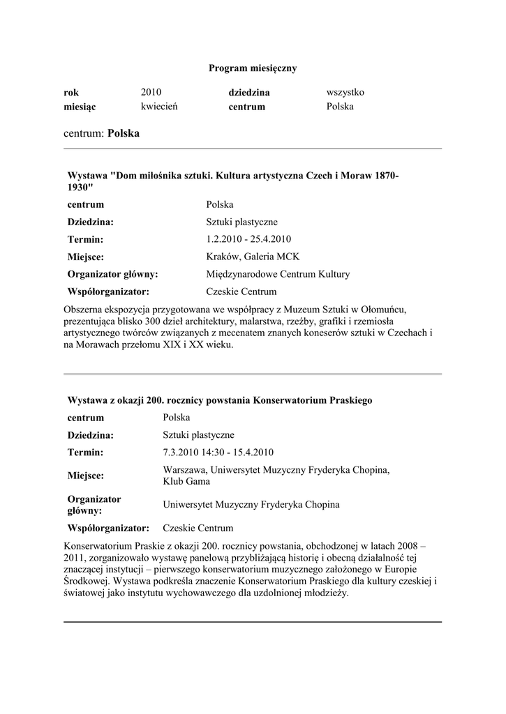 Program miesięczny rok miesiąc 2010 kwiecień dziedzina centrum wszystko Polska centrum: Polska Wystawa "Dom miłośnika sztuki. Kultura artystyczna Czech i Moraw 18701930" centrum Polska Dziedzina: Sztuki plastyczne Termin: 1.2.2010 - 25.4.2010 Miejsce: Kraków, Galeria MCK Organizator główny: Międzynarodowe Centrum Kultury Współorganizator: Czeskie Centrum Obszerna ekspozycja przygotowana we współpracy z Muzeum Sztuki w Ołomuńcu, prezentująca blisko 300 dzieł architektury, malarstwa, rzeźby, grafiki i rzemiosła artystycznego twórców związanych z mecenatem znanych koneserów sztuki w Czechach i na Morawach przełomu XIX i XX wieku. Wystawa z okazji 200. rocznicy powstania Konserwatorium Praskiego centrum Polska Dziedzina: Sztuki plastyczne Termin: 7.3.2010 14:30 - 15.4.2010 Miejsce: Warszawa, Uniwersytet Muzyczny Fryderyka Chopina, Klub Gama Organizator główny: Uniwersytet Muzyczny Fryderyka Chopina Współorganizator: Czeskie Centrum Konserwatorium Praskie z okazji 200. rocznicy powstania, obchodzonej w latach 2008 – 2011, zorganizowało wystawę panelową przybliżającą historię i obecną działalność tej znaczącej instytucji – pierwszego konserwatorium muzycznego założonego w Europie Środkowej. Wystawa podkreśla znaczenie Konserwatorium Praskiego dla kultury czeskiej i światowej jako instytutu wychowawczego dla uzdolnionej młodzieży. Wystawa „Modernizacje 1918-1939. Czas przyszły dokonany“ centrum Polska Dziedzina: Sztuki plastyczne Termin: 11.3.2010 - 30.5.2010 Miejsce: Muzeum Sztuki, Łódź Organizator główny: Muzeum Sztuki w Łodzi Współorganizator: Czeskie Centrum Wystawa poświęcona najważniejszym przykładom modernizacji w dziedzinach sztuk wizualnych, architektury i wzornictwa, które łączyły się z programem reform politycznych i zmian społecznych w nowych państwach środkowoeuropejskich w dwudziestoleciu międzywojennym. Wystawa fotografii „36“ centrum Polska Dziedzina: Sztuki plastyczne Termin: 11.3.2010 - 14.4.2010 Miejsce: Katowice, Galeria Rondo Sztuki Organizator główny: Akademia Sztuk Pięknych w Katowicach Współorganizator: Wystawa fotografii 36-ciu śląskich studentów i absolwentów Instytutu Fotografii Kreatywnej Uniwersytetu Śląskiego w Opawie. Wystawa „Płeć? Sprawdzam! Kobiecość i męskość w sztuce Europy Wschodniej” centrum Polska Dziedzina: Sztuki plastyczne Termin: 20.3.2010 - 13.6.2010 Miejsce: Warszawa, Zachęta Galeria Narodowa Sztuki Organizator główny: Zachęta Galeria Narodowa Sztuki Współorganizator: Wystawa „Płeć? Sprawdzam! Kobiecość i męskość w sztuce Europy Wschodniej” to pierwszy reprezentatywny przegląd sztuki wschodnioeuropejskiej poświęconej problematyce ról płciowych od lat 60. ubiegłego wieku. Dwie dekady po upadku muru berlińskiego kuratorka Bojana Pejić wraz z zespołem ekspertów z 24 krajów zestawiła obszerną ekspozycję, obejmującą ponad 400 prac – malarstwo, rzeźbę, instalacje, fotografie, plakaty, filmy i wideo. Wystawa „Daria in and out“ w Przemyślu centrum Polska Dziedzina: Sztuki plastyczne Termin: 20.3.2010 - 9.4.2010 Miejsce: Zamek Kazimierzowski w Przemyślu Organizator główny: Centrum Kultury i Nauki Współorganizator: Czeskie Centrum Podczas Międzynarodowego Dnia Teatru, który jest częścią festiwalu „Zamkowe Teatralia“ w Przemyślu odbędzie wystawa fotografii „Daria in and out“ przedstawiająca zdjęcia dwóch artystów: fotografa Petra Nańica i primabaleriny English National Balet Darii Klimentovej. Cały program „Zamkowych Teatralii“ znajdą Państwo na: http://www.kultura.przemysl.pl/ Wystawa „Świat według Adolfa Borna“ centrum Polska Dziedzina: Sztuki plastyczne Termin: 25.3.2010 - 3.5.2010 Miejsce: Cieszyn, Galeria Muzeum Śląska Cieszyńskiego Organizator główny: Muzeum Śląska Cieszyńskiego Współorganizator: Czeskie Centrum Od 25 marca w Galerii Muzeum Śląska Cieszyńskiego będzie można oglądać wystawę znanego czeskiego malarza i ilustratora, który w tym roku obchodzi 80 urodziny. Wystawa pod nazwą „Świat według Adolfa Borna“ to przekrój jego bogatej twórczości, która w Polsce nie jest zbyt dobrze znana. Koncert Two Voices centrum Polska Dziedzina: Muzyka Termin: 7.4.2010 Miejsce: Wrocław, Sala Rycerska Urzędu Miasta Organizator główny: Konsulat Honorowy RCz we Wrocławiu Współorganizator: Czeskie Centrum Z okazji uroczystego mianowania dr Arkadiusza Ignasiaka na Konsula Honorowego Republiki Czeskiej oraz otwarcia Konsulatu Honorowego we Wrocławiu odbędzie się koncert zespołu Two Voices. Premiera filmu „Tobruk“ i panel dyskusyjny centrum Polska Dziedzina: Film Termin: 8.4.2010 18:00 Miejsce: Centrum Konferencyjne MON, Warszawa Organizator główny: Ambasada RCz w Warszawie Współorganizator: Czeskie Centrum W II wojnie światowej zginęło ponad 50 mln ludzi, z czego 360 000 Czechosłowaków. W armii alianckiej walczyło 50 tys. żołnierzy z Czechosłowacji, z czego w północnej Afryce – 1800. Zginęło w sumie 7790 żołnierzy. Dramat wojenny „Tobruk“ poświęcony jest wszystkim czechosłowackim weteranom wojennym, przede wszystkim z 11. Czechosłowackiego Pułku Piechoty – tzw. Wschodniego, którzy wraz z Polakami, Anglikami, Australijczykami i Południowoafrykańczykami wiosną 1944 r. bronili ostatniego portu kontrolowanego przez siły alianckie w Libii – TOBRUKU. Czeskie Czwartki centrum Polska Dziedzina: Inne Termin: 8.4.2010 17:00 Miejsce: Kraków, Międzynarodowe Centrum Kultury Organizator główny: Międzynarodowe Centrum Kultury Współorganizator: W ramach cyklu „Czeskie Czwartki - spotkania ze sztuką południowych sąsiadów” w Międzynarodowym Centrum Kultury, 8 kwietnia odbędzie się wykład na temat „Architektura: Na dwóch biegunach funkcjonalizmu: Willa Tugendhat i architektura Zlínu“. Spotkanie poprowadzi Helena Postawka. „Postrzyżyny” centrum Polska Dziedzina: Film Termin: 11.4.2010 Miejsce: Krak
