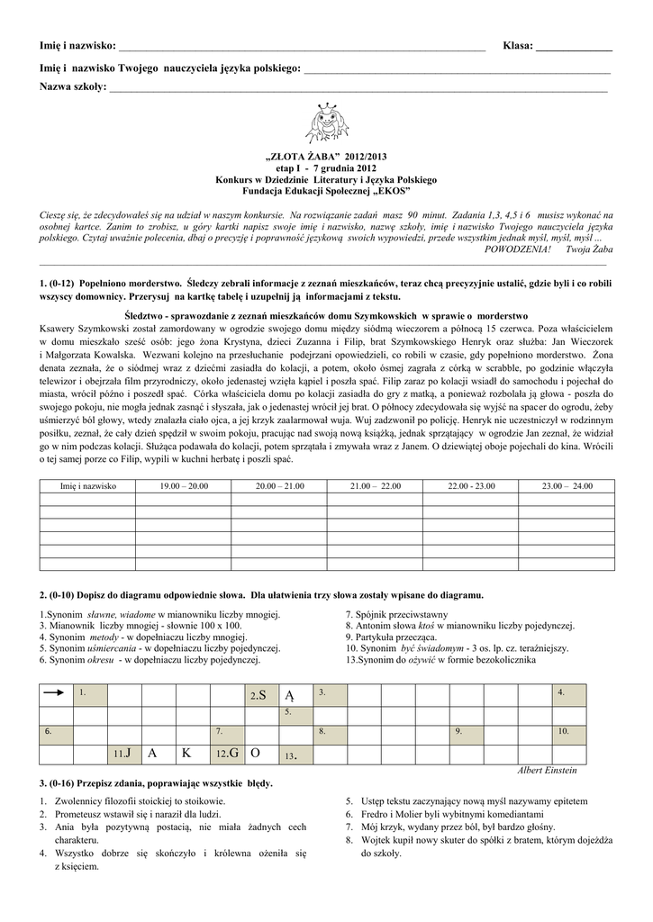 Imię i nazwisko: ___________________________________________________________________ Klasa: ______________ Imię i nazwisko Twojego nauczyciela języka polskiego: ________________________________________________________ Nazwa szkoły: ___________________________________________________________________________________________ „ZŁOTA ŻABA” 2012/2013 etap I - 7 grudnia 2012 Konkurs w Dziedzinie Literatury i Języka Polskiego Fundacja Edukacji Społecznej „EKOS” Cieszę się, że zdecydowałeś się na udział w naszym konkursie. Na rozwiązanie zadań masz 90 minut. Zadania 1,3, 4,5 i 6 musisz wykonać na osobnej kartce. Zanim to zrobisz, u góry kartki napisz swoje imię i nazwisko, nazwę szkoły, imię i nazwisko Twojego nauczyciela języka polskiego. Czytaj uważnie polecenia, dbaj o precyzję i poprawność językową swoich wypowiedzi, przede wszystkim jednak myśl, myśl, myśl ... POWODZENIA! Twoja Żaba ___________________________________________________________________________________________________________________ 1. (0-12) Popełniono morderstwo. Śledczy zebrali informacje z zeznań mieszkańców, teraz chcą precyzyjnie ustalić, gdzie byli i co robili wszyscy domownicy. Przerysuj na kartkę tabelę i uzupełnij ją informacjami z tekstu. Śledztwo - sprawozdanie z zeznań mieszkańców domu Szymkowskich w sprawie o morderstwo Ksawery Szymkowski został zamordowany w ogrodzie swojego domu między siódmą wieczorem a północą 15 czerwca. Poza właścicielem w domu mieszkało sześć osób: jego żona Krystyna, dzieci Zuzanna i Filip, brat Szymkowskiego Henryk oraz służba: Jan Wieczorek i Małgorzata Kowalska. Wezwani kolejno na przesłuchanie podejrzani opowiedzieli, co robili w czasie, gdy popełniono morderstwo. Żona denata zeznała, że o siódmej wraz z dziećmi zasiadła do kolacji, a potem, około ósmej zagrała z córką w scrabble, po godzinie włączyła telewizor i obejrzała film przyrodniczy, około jedenastej wzięła kąpiel i poszła spać. Filip zaraz po kolacji wsiadł do samochodu i pojechał do miasta, wrócił późno i poszedł spać. Córka właściciela domu po kolacji zasiadła do gry z matką, a ponieważ rozbolała ją głowa - poszła do swojego pokoju, nie mogła jednak zasnąć i słyszała, jak o jedenastej wrócił jej brat. O północy zdecydowała się wyjść na spacer do ogrodu, żeby uśmierzyć ból głowy, wtedy znalazła ciało ojca, a jej krzyk zaalarmował wuja. Wuj zadzwonił po policję. Henryk nie uczestniczył w rodzinnym posiłku, zeznał, że cały dzień spędził w swoim pokoju, pracując nad swoją nową książką, jednak sprzątający w ogrodzie Jan zeznał, że widział go w nim podczas kolacji. Służąca podawała do kolacji, potem sprzątała i zmywała wraz z Janem. O dziewiątej oboje pojechali do kina. Wrócili o tej samej porze co Filip, wypili w kuchni herbatę i poszli spać. Imię i nazwisko 19.00 – 20.00 20.00 – 21.00 21.00 – 22.00 22.00 - 23.00 23.00 – 24.00 2. (0-10) Dopisz do diagramu odpowiednie słowa. Dla ułatwienia trzy słowa zostały wpisane do diagramu. 1.Synonim sławne, wiadome w mianowniku liczby mnogiej. 3. Mianownik liczby mnogiej - słownie 100 x 100. 4. Synonim metody - w dopełniaczu liczby mnogiej. 5. Synonim uśmiercania - w dopełniaczu liczby pojedynczej. 6. Synonim okresu - w dopełniaczu liczby pojedynczej. 1. 2.S 7. Spójnik przeciwstawny 8. Antonim słowa ktoś w mianowniku liczby pojedynczej. 9. Partykuła przecząca. 10. Synonim być świadomym - 3 os. lp. cz. teraźniejszy. 13.Synonim do ożywić w formie bezokolicznika Ą 3. 4. 5. 6. 7. 11.J A K 12.G 8. O 13 9. 10. . Albert Einstein 3. (0-16) Przepisz zdania, poprawiając wszystkie błędy. 1. Zwolennicy filozofii stoickiej to stoikowie. 2. Prometeusz wstawił się i naraził dla ludzi. 3. Ania była pozytywną postacią, nie miała żadnych cech charakteru. 4. Wszystko dobrze się skończyło i królewna ożeniła się z księciem. 5. 6. 7. 8. Ustęp tekstu zaczynający nową myśl nazywamy epitetem Fredro i Molier byli wybitnymi komediantami Mój krzyk, wydany przez ból, był bardzo głośny. Wojtek kupił nowy skuter do spółki z bratem, którym dojeżdża do szkoły. 4. (0-12) Metagramy to wyrazy różniące się 1 literą (bez zmiany miejsc pozostałych liter), np. SOBOTA – ROBOTA. Wymyśl 4 pary takich wyrazów metagramowych (co najmniej 5-literowych), rzeczowników w mianowniku liczby pojedynczej. 5. (0-8) W poniższym tekście zostały ukryte w rozproszeniu tytuły 8 wydawanych w Polsce czasopism. Znajdź je i zapisz poprawnie. Uwaga - wszystkie słowa składające się na tytuły występują w mianowniku, jeden tytuł zawiera spójnik. Życie może przynosić różne niespodzianki i powiem wam wprost, że to, co mi się ostatnio zdarza, to istne kino. Nie interesuje mnie polityka, rzadko oglądam telewizję, najchętniej korzystam z Internetu. Wiedza to podstawa. Na jednym z zagranicznych portali przeczytałem o mającej się niebawem odbyć w Londynie premierze kolejnej z przygód Jamesa Bonda. Film wydawał mi się wart obejrzenia. Cogito ergo sum!- zakrzyknąłem radośnie i zadzwoniłem do Anglii, gdzie mieszka mój przyjaciel, z prośbą, by załatwił jakieś dobre miejsca. Przez Internet zamówiłem dwa bilety do brytyjskiej stolicy - dla mnie i dla żony. Nasze charaktery nieco się różnią, ale podróżowanie jest wspólną pasją. - Focus pocus - kochanie - jedziemy na premierę Bonda - szepnąłem przy kolacji. I wiecie co ? Żona skrzywiła się znudzona i mruknęła - Na Bonda? Kochanie, ależ ja nie mam co na siebie włożyć... 6. (0-15) Odgadnij ukryty w tabeli tekst, a następnie przepisz go na kartkę. Metoda szyfrowania oparta jest na alfabecie, w którym wszystkie litery przesunięto o kilka miejsc w jedną stronę, zastępując je innymi. Rozwiązaniem jest limeryk – zabawny 5-wersowy wierszyk Wisławy Szymborskiej. A Ą B C Ć D E Ę F G H I J K L Ł M N Ń O Ó P R S 