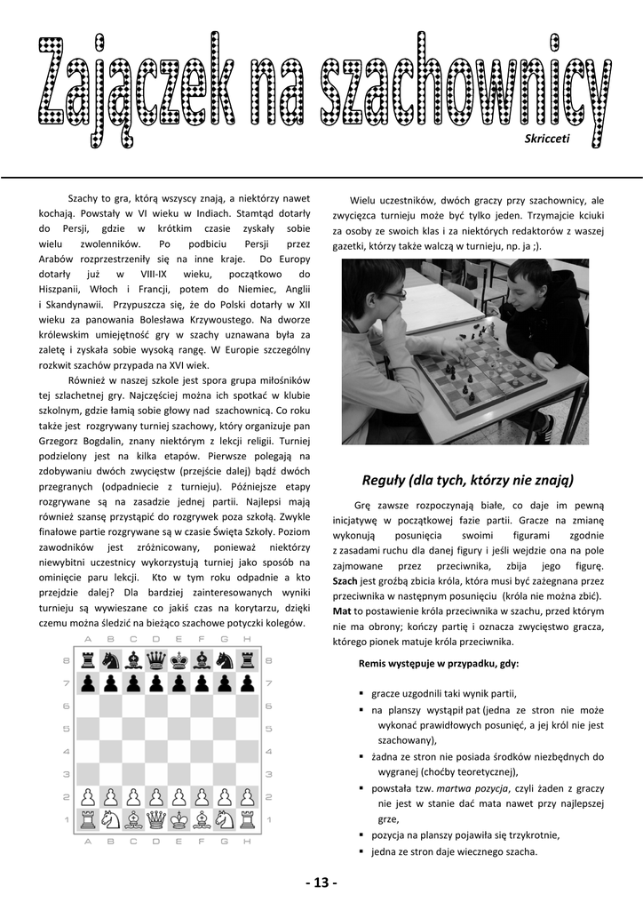 Skricceti Szachy to gra, którą wszyscy znają, a niektórzy nawet kochają. Powstały w VI wieku w Indiach. Stamtąd dotarły do Persji, gdzie w krótkim czasie zyskały sobie wielu zwolenników. Po podbiciu Persji przez Arabów rozprzestrzeniły się na inne kraje. Do Europy dotarły już w VIII-IX wieku, początkowo do Hiszpanii, Włoch i Francji, potem do Niemiec, Anglii i Skandynawii. Przypuszcza się, że do Polski dotarły w XII wieku za panowania Bolesława Krzywoustego. Na dworze królewskim umiejętność gry w szachy uznawana była za zaletę i zyskała sobie wysoką rangę. W Europie szczególny rozkwit szachów przypada na XVI wiek. Również w naszej szkole jest spora grupa miłośników tej szlachetnej gry. Najczęściej można ich spotkać w klubie szkolnym, gdzie łamią sobie głowy nad szachownicą. Co roku także jest rozgrywany turniej szachowy, który organizuje pan Grzegorz Bogdalin, znany niektórym z lekcji religii. Turniej podzielony jest na kilka etapów. Pierwsze polegają na zdobywaniu dwóch zwycięstw (przejście dalej) bądź dwóch przegranych (odpadniecie z turnieju). Późniejsze etapy rozgrywane są na zasadzie jednej partii. Najlepsi mają również szansę przystąpić do rozgrywek poza szkołą. Zwykle finałowe partie rozgrywane są w czasie Święta Szkoły. Poziom zawodników jest zróżnicowany, ponieważ niektórzy niewybitni uczestnicy wykorzystują turniej jako sposób na ominięcie paru lekcji. Kto w tym roku odpadnie a kto przejdzie dalej? Dla bardziej zainteresowanych wyniki turnieju są wywieszane co jakiś czas na korytarzu, dzięki czemu można śledzić na bieżąco szachowe potyczki kolegów. Wielu uczestników, dwóch graczy przy szachownicy, ale zwycięzca turnieju może być tylko jeden. Trzymajcie kciuki za osoby ze swoich klas i za niektórych redaktorów z waszej gazetki, którzy także walczą w turnieju, np. ja ;). Reguły (dla tych, którzy nie znają) Grę zawsze rozpoczynają białe, co daje im pewną inicjatywę w początkowej fazie partii. Gracze na zmianę wykonują posunięcia swoimi figurami zgodnie z zasadami ruchu dla danej figury i jeśli wejdzie ona na pole zajmowane przez przeciwnika, zbija jego figurę. Szach jest groźbą zbicia króla, która musi być zażegnana przez przeciwnika w następnym posunięciu (króla nie można zbić). Mat to postawienie króla przeciwnika w szachu, przed którym nie ma obrony; kończy partię i oznacza zwycięstwo gracza, którego pionek matuje króla przeciwnika. Remis występuje w przypadku, gdy: gracze uzgodnili taki wynik partii, na planszy wystąpił pat (jedna ze stron nie może wykonać prawidłowych posunięć, a jej król nie jest szachowany), żadna ze stron nie posiada środków niezbędnych do wygranej (choćby teoretycznej), powstała tzw. martwa pozycja, czyli żaden z graczy nie jest w stanie dać mata nawet przy najlepszej grze, pozycja na planszy pojawiła się trzykrotnie, jedna ze stron daje wiecznego szacha. - 13 -