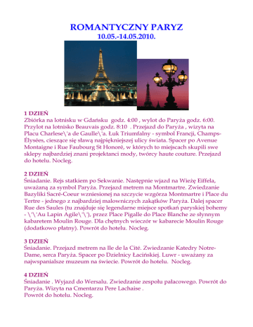 ROMANTYCZNY PARYZ 10.05.-14.05.2010. 1 DZIEŃ Zbiórka na lotnisku w Gdańsku godz. 4:00 , wylot do Paryża godz. 6:00. Przylot na lotnisko Beauvais godz. 8:10 . Przejazd do Paryża , wizyta na Placu Charlese\'a de Gaulle\'a. Łuk Triumfalny - symbol Francji, ChampsÉlysées, cieszące się sławą najpiękniejszej ulicy świata. Spacer po Avenue Montaigne i Rue Faubourg St Honoré, w których to miejscach skupili swe sklepy najbardziej znani projektanci mody, twórcy haute couture. Przejazd do hotelu. Nocleg. 2 DZIEŃ Śniadanie. Rejs statkiem po Sekwanie. Następnie wjazd na Wieżę Eiffela, uważaną za symbol Paryża. Przejazd metrem na Montmartre. Zwiedzanie Bazyliki Sacré-Coeur wzniesionej na szczycie wzgórza Montmartre i Place du Tertre - jednego z najbardziej malowniczych zakątków Paryża. Dalej spacer Rue des Saules (tu znajduje się legendarne miejsce spotkań paryskiej bohemy - \'\'Au Lapin Agile\'\'), przez Place Pigalle do Place Blanche ze słynnym kabaretem Moulin Rouge. Dla chętnych wieczór w kabarecie Moulin Rouge (dodatkowo płatny). Powrót do hotelu. Nocleg. 3 DZIEŃ Śniadanie. Przejazd metrem na Ile de la Cité. Zwiedzanie Katedry NotreDame, serca Paryża. Spacer po Dzielnicy Łacińskiej. Luwr - uważany za najwspanialsze muzeum na świecie. Powrót do hotelu. Nocleg. 4 DZIEŃ Śniadanie . Wyjazd do Wersalu. Zwiedzanie zespołu pałacowego. Powrót do Paryża. Wizyta na Cmentarzu Pere Lachaise . Powrót do hotelu. Nocleg. 5 DZIEŃ Śnidanie . Wyjazd z hotelu na lotnisko. Wylot godz. 13:30. Przylot do Gdańska godz. 15:30 . Cena : 1.590,-zł W cenie zawarto: ● przelot samolotem linii Wizz Air Gdańsk/Paryż/ Gdańsk ● transfery z i na lotnisko Beauvais ● 4 noclegi ze śniadaniami w hot. Kat.** w centrum Paryża, pok.2os z lazienkami ● opieka pilota ● ubezpieczenie KliNW ● program turystyczny Cena nie zawiera biletów wstępu do zwiedzanych obiektów. ZAPRASZAMY !!! WARUNKI REZERWACJI: ● ● ● ● ● Zaliczka w kwocie 600zł stanowi zgodę na udział w imprezie . Po wpłacie zaliczki przesyłamy do podpisu umowę i warunki uczestnicztwa. Zaliczkę prosimy wpłacać na konto; Biuro Podróży Anna Partyka Sp. Z o.o. Slupsk nr 43 1240 3770 1111 0000 4068 4341 Termin wpłaty zaliczki: 20.01.2010. Po tym terminie uczesnictwo w imprezie jedynie „na zapytanie”. Prosimy zglaszać się „pokojami” , czyli po 2os zakwaterowane w jednym pokoju. Dopłata do pokoju 1os wynosi ok 450zł/ za 4noclegi Cena imprezy może ulec zmianie do momentu podpisania umowy ze względu na zmiany cen biletów linii Wizz Air. Cena ostateczna podana będzie w umowie, podpisywanej przez klienta.
