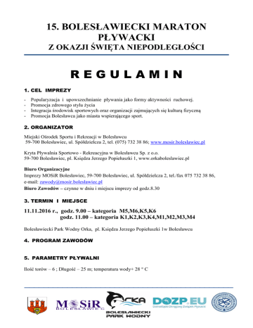 15. BOLESŁAWIECKI MARATON PŁYWACKI Z OKAZJI ŚWIĘTA NIEPODLEGŁOŚCI REGULAMIN 1. CEL IMPREZY - Popularyzacja i upowszechnianie pływania jako formy aktywności ruchowej. - Promocja zdrowego stylu życia - Integracja środowisk sportowych oraz organizacji zajmujących się kulturą fizyczną - Promocja Bolesławca jako miasta wspierającego sport. 2. ORGANIZATOR Miejski Ośrodek Sportu i Rekreacji w Bolesławcu 59-700 Bolesławiec, ul. Spółdzielcza 2, tel. (075) 732 38 86; www.mosir.boleslawiec.pl Kryta Pływalnia Sportowo - Rekreacyjna w Bolesławcu Sp. z o.o. 59-700 Bolesławiec, pl. Księdza Jerzego Popiełuszki 1, www.orkaboleslawiec.pl Biuro Organizacyjne Imprezy MOSiR Bolesławiec, 59-700 Bolesławiec, ul. Spółdzielcza 2, tel./fax 075 732 38 86, e-mail: [email protected]ławiec.pl Biuro Zawodów – czynne w dniu i miejscu imprezy od godz.8.30 3. TERMIN I MIEJSCE 11.11.2016 r., godz. 9.00 – kategoria M5,M6,K5,K6 godz. 11.00 – kategoria K1,K2,K3,K4,M1,M2,M3,M4 Bolesławiecki Park Wodny Orka, pl. Księdza Jerzego Popiełuszki 1w Bolesławcu 4. PROGRAM ZAWODÓW 5. PARAMETRY PŁYWALNI Ilość torów – 6 ; Długość – 25 m; temperatura wody+ 28 ° C ____________________________________________ M SiR BO ESSŁŁ A AW WII E E CC B O LL E 6. PATRONAT HONOROWY Piotr Roman - Prezydent Miasta Bolesławiec Zbigniew Dubiel - Prezes Dolnośląskiego Okręgowego Związku Pływackiego 7. UCZESTNICTWO 1. Uczestnikami zawodów mogą być wszyscy chętni bez względu wiek, miejsce zamieszkania, zarówno amatorzy, jak i zawodnicy posiadający licencje sportowe. 2. Osoby niepełnoletnie startują wyłącznie za pisemną zgodą rodziców / opiekunów 3. Zawodnicy powinni posiadać aktualne badania lekarskie stwierdzające brak przeciwwskazań do udziału w zawodach. W przypadku braku badań lekarskich uczestnik bierze udział na własną odpowiedzialność (dotyczy zgłoszeń indywidualnych). 4. W przypadku zgłoszeń grupowych (np. klub, szkoła, stowarzyszenie) za sprawdzenie badań lekarskich odpowiedzialność ponoszą opiekunowie / trenerzy. 5. Uczestnik powinien posiadać aktualny dokument tożsamości ze zdjęciem. 8. ZGŁOSZENIA Zgłoszenia wyłącznie na kartach zgłoszeniowych - do pobrania w Biurze Organizacyjnym: MOSiR przy ul. Spółdzielczej 2 w Bolesławcu, w Biurze Zawodów lub ze strony www.mosir.boleslawiec.pl można składać w nieprzekraczalnym terminie do dnia 7.11.2016 r.: do godziny 15.00 ! 1) pocztą elektroniczną na adres e-mail [email protected] – zgłoszenie należy potwierdzić telefonicznie pod numerem 75 732 38 86. 2) osobiście w Biurze Organizacyjnym - Imprezy MOSiR Bolesławiec, ul. Spółdzielcza 2 do godz. 15.00 Weryfikacja zgłoszeń: w dniu imprezy i miejscu zawodów (biuro zawodów) do godz. 8.45 (kat. M5,M6,K5,K6). Weryfikacja zgłoszeń: w dniu imprezy i miejscu zawodów (biuro zawodów) do godz. 10.30 pozostałe kategorie. 9. DYSTANS 1000 m 10. PRZEPISY TECHNICZNE. 1. 2. 3. 4. Zawody przeprowadzone będą zgodnie z przepisami PZP, seriami na czas. W przypadku dużej liczby zgłoszeń dopuszcza się możliwość startu dwóch osób na torze. Pomiar czasu ręczny. Rozgrzewka w godzinach: 8.30 – 8.55. ____________________________________________ M SiR BO ESSŁŁ A AW WII E E CC B O LL E 5. Rozgrzewka w godzinach: 10.30 – 10.55. 6. Zawodnik ma prawo zmieniać styl w trakcie pływania 11. OPŁATY / FINANSOWANIE 1. Zawody finansowane są ze środków: - Gminy Miejskiej Bolesławiec - organizatorów i sponsorów. 2. Nie przewiduje się opłat startowych. 3. Uczestnicy przyjeżdżają na koszt własny. 12. KATEGORIE WIEKOWE K1, M1 2007 r i młodsi K2, M2 2006 – 2004 K3, M3 2003 – 2001 - do 9 lat - 10 - 12 lat - 13 - 15 lat K4, M4 K5, M5 K6, M6 2000 – 1987 1986 – 1967 1966 i starsi - 16 - 29 lat - 30 - 49 lat - 50 lat i starsi O zaliczeniu do kategorii wiekowej decyduje rok urodzenia, a o pełnoletniości data urodzenia. 13. KLASYFIKACJA I NAGRODY 1. Klasyfikacja generalna kobiet i mężczyzn: od I do V miejsca - puchary, dyplomy i nagrody rzeczowe 2. Klasyfikacja w kategoriach wiekowych kobiet i mężczyzn: od I do III miejsca - medale, dyplomy, 3. Organizatorzy zastrzegają sobie prawo przyznania nagród dodatkowych. 4. Wśród wszystkich uczestników zawodów rozlosowane zostaną nagrody rzeczowe. 14. POSTANOWIENIA KOŃCOWE 1. Wszystkie sprawy sporne, odwołania i protesty rozstrzyga sędzia główny i organizator 2. Organizator nie ponosi odpowiedzialności za mogące się wydarzyć, w trakcie trwania zawodów ewentualne wypadki i straty materialne powstałe nie z winy organizatora. 3. Wszyscy uczestnicy biorą udział w Maratonie na własną odpowiedzialność i nie będą wnosić żadnych roszczeń w stosunku do organizatora w razie zaistnienia zdarzeń losowych podczas trwania imprezy. 4. Organizaror zastrzega sobie możliwość zmian w Regulaminie, o których zobowiązany jest poinformować uczestników w formie komunikatów ustnych i pisemnych (Biuro zawodów). 5. Interpretacja niniejszego regulaminu należy do organizatora. 6. Zgłoszenie do zawodów jest równoznaczne z akceptacją postanowień niniejszego regulaminu. ____________________________________________ M SiR BO ESSŁŁ A AW WII E E CC B O LL E ____________________________________________ M SiR BO ESSŁŁ A AW WII E E CC B O LL E
