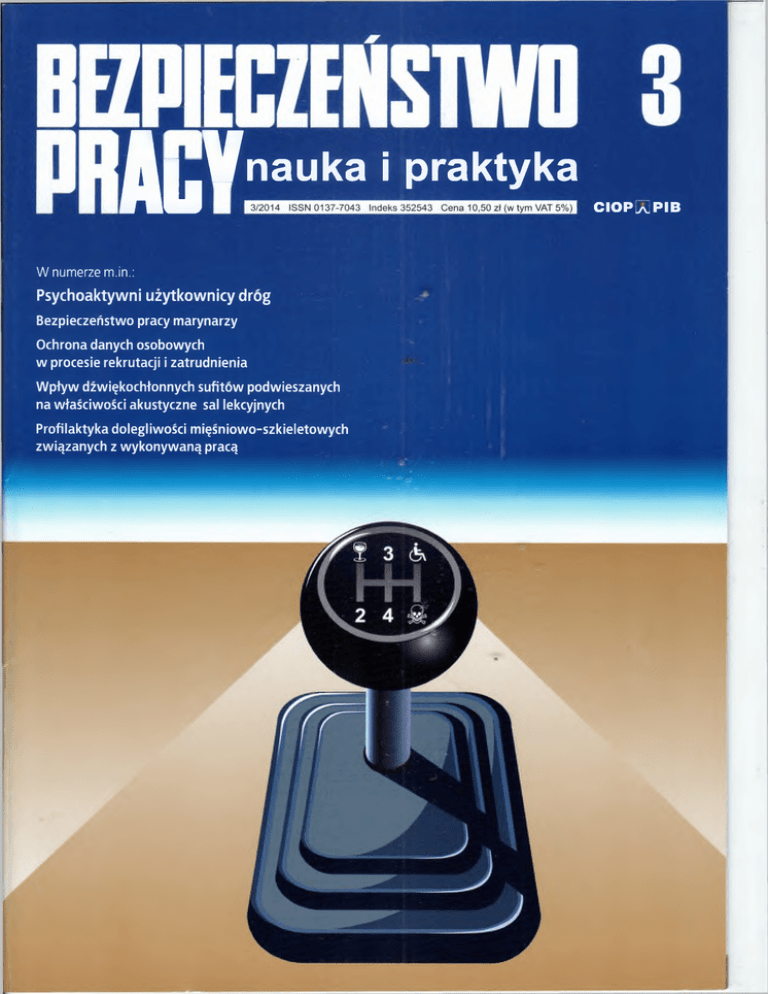 j^yVnauka i praktyka C IO P laJPIB W numerze m.in.: Psychoaktywni uzytkownicy drog Bezpieczenstwo pracy marynarzy Ochrona danych osobowych w procesie rekrutacji i zatrudnienia Wptyw dzwi^kochtonnych sufitow podwieszanych na wtasciwosci akustyczne sal lekcyjnych Profilaktyka dolegliwosci mi^sniowo-szkieletowych zwi^zanych z wykonywan^ prac^ OS No. 3 (510) March 2014 BP nr 3 (510) marzec 2014 Dobra komunikacja elementem bezpiecznej pracy. Nowa kampania spoteczna 2014 ........................... II s. okt. Good communications as an element of safe work. New 2014 social campaign Aktualnosci z kraju .............................................................................................................................................2 Local reports III Forum Bezpieczenstwa Funkcjonalnego. Maszyna w sieci zagrozen........................................................... 3 The 3rd Funcional Safety Forum. A machine in the web of hazards Mi^dzynarodoweTargi Innowacji Energetycznych InEnerg we Wrodawiu...................................................... 4 InEnerg International Fair in Wroclaw Wspofczesne wyzwania prawa pracy. Sympozjum z okazji 40-lecia kodeksu pracy Contemporary challenges of labour law. 40th anniversary of the Labour Code symposium Wojciech D ylq g .................................................................................................................................................. 6 A Czy wszyscy jestesmy wspofodpowiedzialni za wypadki drogowe? Are we co-responsible for traffic accidents? Andrzej Najmiec................................................................................................................................................. 7 Poci^g zwany bezpieczenstwem Rozmowa z Ignacym Gor^, wiceprezesem Urz^du Transportu Kolejowego.................................................... 8 A train called safety. An interview with Ignacy Gora, vice-chairman of the Office of Rail Transportation Bezpieczenstwo pracy marynarzy Seafarers' safety and health at work louriN. Sem enov............................................................................................................................................... 10 Psychoaktywni uzytkownicy drag Psychoactive traffic users Dorota Bqk-Gajda, Jadwiga B q k ...................................................................................................................... 14 Ochrona danych osobowych w procesie rekrutacji i zatrudnienia Provisions on personal data of employees in the process of recruitment and employment Karolina Arominska........................................................................... ...............................................................19 Wptyw dzwi^kochtonnych sufitow podwieszanych na wtasciwosci akustyczne sal lekcyjnych Impact of sound absorbing suspended ceilings on acoustics in classrooms Witold Mikulski................................................................................................................................................. 22 Profilaktyka dolegliwosci mi^sniowo-szkieletowych zwi^zanych z wykonywan^ prac^ - promocja aktywnosci fizycznej w miejscu pracj’ (1) Preventing work-related musculoskeletal disorders - physical activity at work (1) Marzena Malinska...................................................................*...................................................................... 25 OBRADOWAtA RADA OCHRONY PRACY PRZY SEJMIE RP Zawodowe narazenie na substancje chemiczne - ocena i przeciwdziafanie.................................................. 30 LABOUR PROTECTION COUNCIL IN SESSION Occupational exposure to chamical compounds - evaluation and prevention ODPOWIADAMY NA PYTANIA CZYTELNIKOW ANSWERING OUR READERS' QUESTIONS Wiestawa Lem pska........................................................................................................................................... 31 DONIESIENIA Z ZAG RAN ICY........................................................................................................................... 32 REPORTS FROM ABROAD