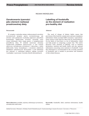 Praca Przeglądowa Zdr Publ 2012;122(1):90-94 Review Article Regina Wierzejska Oznakowanie żywności jako element realizacji prozdrowotnej diety Labelling of foodstuffs as the element of realization pro-healthy diet Streszczenie Abstract W związku z potrzebą zmiany niekorzystnych nawyków żywieniowych przepisy prawa żywnościowego, jak również sami producenci wychodzą naprzeciw potrzebom konsumenta. Opakowania żywności zawierają coraz więcej informacji, które mogą pomóc w komponowaniu prawidłowej diety. W artykule omówiono elementy oznakowania produktów spożywczych, w tym wartość odżywczą, oświadczenia żywieniowe i zdrowotne, a także dobrowolne formy komunikacji o zawartości niektórych składników pokarmowych. Korzystanie z tych informacji jest zalecane w codziennej praktyce zakupu żywności i niezbędne w prewencji i leczeniu chorób dietozależnych. The need of change of dietary habits causes that provisions of the food law contain more and more mandatory information which can help fulfill consumers’ expectations. Some actions in this field are taken also by food producers. On the labels of food there is a lot of information, which can help people in composing a proper diet. This article discusses some elements of labeling, such as nutrition declaration, nutrition and health claims and also optional information concerning some nutrients in foodstuffs. Using this information is recommended in the everyday purchase of foodstuffs and is needed in prevention and treatment of diet-related diseases. Słowa kluczowe: produkt, etykieta, informacje żywieniowe, oświadczenia zdrowotne. Keywords: foodstuffs, label, nutrition information, health claims. Zakład Żywienia i Dietetyki z Kliniką Chorób Metabolicznych i Gastroenterologii, Instytut Żywności i Żywienia w Warszawie © Zdr Publ 2011;122(1) Zdr Publ 2012;122(1) WSTĘP Narastająca w dynamicznym tempie nadwaga i otyłość społeczeństw zachodnich zmusza do poszukiwania wielokierunkowych rozwiązań prowadzących do zahamowania tego zjawiska. Wśród zasadniczych zmian, jakich należy dokonać w stylu życia niezbędna jest eliminowanie niekorzystnych nawyków żywieniowych. Do osiągnięcia tego celu potrzebna jest zarówno świadomość społeczna na temat roli żywienia w etiopatogenezie otyłości i innych chorób cywilizacyjnych, jak i działania sektora żywnościowego, umożliwiające realizację prawidłowej diety. Globalna strategia FAO/WHO zaleca zatem, aby przemysł spożywczy podjął zdecydowane kroki w kierunku modyfikacji składu produktów i zwiększenia asortymentu żywności o charakterze prozdrowotnym. Rozwój rynku produktów o obniżonej wartości kalorycznej, mniejszej zawartości tłuszczu, cukrów prostych i soli jest niezbędny do podjęcia interwencji żywieniowej. Nie mniej ważne jest także, aby w warunkach wysokiej podaży żywności konsument miał możliwość łatwego rozpoznania takich produktów w codziennej praktyce nabywania żywności. Element ten jest na tyle istotny, że w przepisach prawa żywnościowego warunek o zapewnieniu konsumentom podstawy do świadomego wyboru żywności jest jednym z wymagań kluczowych [1,2]. Podstawową formą przekazu informacji o produkcie dla odbiorcy żywności jest etykieta. Zawiera ona szereg informacji mających znaczenie, zarówno z punktu widzenia jakości produktu, jego parametrów żywieniowych, jak i handlowych. Obecnie na skutek wzmożonego upowszechniania wiedzy na temat zależności jakie istnieją pomiędzy dietą a zdrowiem obserwuje się duże zainteresowanie producentów zamieszczaniem na opakowaniach żywności wielu informacji odwołujących się do korzystnego oddziaływania produktów lub ich składników na organizm człowieka. W praktyce konsument coraz częściej spotyka na etykiecie różne informacje sugerujące szczególne właściwości produktu. Wartość odżywcza produktu Spośród informacji na opakowaniu, które konsument może wykorzystać w planowaniu racjonalnej diety jest wartość odżywcza produktu. Informacja ta podana najczęściej w formie tabeli przedstawia wartość energetyczną produktu, wyrażoną w kilodżulach (kJ) i kilokaloriach (kcal) oraz zawartość składników odżywczych. W zależności od sytuacji może ona dotyczyć czterech lub ośmiu parametrów żywieniowych. W wersji podstawowej (grupa 1) obejmuje ona energię, białko, węglowodany i tłuszcz, natomiast w wersji rozszerzonej (grupa 2) pojawia się także zawartość cukru, kwasów tłuszczowych nasyconych, błonnika i sodu. Wartość odżywcza produktu dotyczy 100 g lub 100 ml produktu, a dodatkowo może być wyrażona w przeliczeniu na porcję proponowaną do spożycia. Dzięki przyjętej jednolitej formie wyrażania wartości odżywczej, konsument ma możliwość łatwego porównania produktów między sobą i wyboru tych o optymalnych cechach żywieniowych. Przykład znakowania wartością odżywczą przedstawia Tabela 1. 91 TABELA 1. Wartość odżywcza produktu. Wartość odżywcza Wartość energetyczna 100 g Porcja 2 sztuki (20g) 1635 kJ/391 kcal 327 kJ/78 kcal Białko 8,6 g 1,7 g Węglowodany 82,7 g 16,5 g - w tym cukry Tłuszcz - w tym kwasy tłuszczowe nasycone 1,4 g 2,1 g 0,3 g 0,4 g 0,5 g 0,1 g Błonnik pokarmowy 3,4 g 0,7 g Sód 0,3 g 0,06 g Aby dobrze wykorzystać informacje o wartości odżywczej niezbędna jednak jest podstawowa wiedza na temat racjonalnej diety, jej kaloryczności i prawidłowej zawartości poszczególnych składników. Cukier, tłuszcz, kwasy tłuszczowe nasycone i sód spożywane w nadmiarze zwiększają ryzyko zaburzeń stanu zdrowia, dlatego produkty o dużej zawartości tych składników wymagają ograniczenia w diecie. Błonnik natomiast jest składnikiem posiadającym wielokierunkowe korzystne działanie w organizmie, jego spożycie jest zbyt małe, zatem produkty zawierające znaczne ilości błonnika są powszechnie zalecane. Składnikiem wymienionym w wartości odżywczej, kt