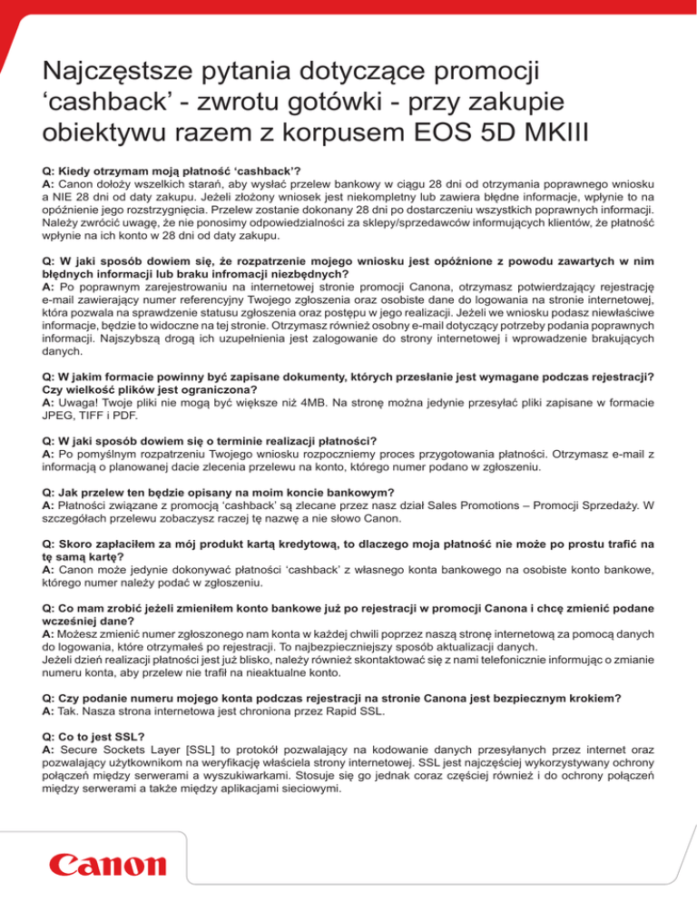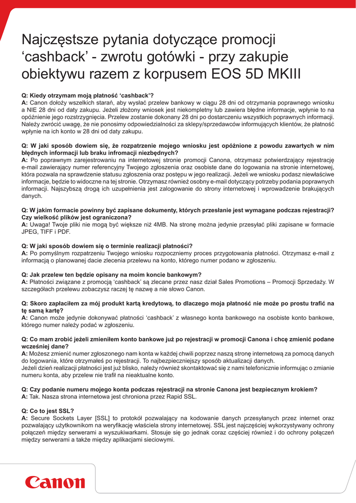 Najczęstsze pytania dotyczące promocji ‘cashback’ - zwrotu gotówki - przy zakupie obiektywu razem z korpusem EOS 5D MKIII Q: Kiedy otrzymam moją płatność ‘cashback’? A: Canon dołoży wszelkich starań, aby wysłać przelew bankowy w ciągu 28 dni od otrzymania poprawnego wniosku a NIE 28 dni od daty zakupu. Jeżeli złożony wniosek jest niekompletny lub zawiera błędne informacje, wpłynie to na opóźnienie jego rozstrzygnięcia. Przelew zostanie dokonany 28 dni po dostarczeniu wszystkich poprawnych informacji. Należy zwrócić uwagę, że nie ponosimy odpowiedzialności za sklepy/sprzedawców informujących klientów, że płatność wpłynie na ich konto w 28 dni od daty zakupu. Q: W jaki sposób dowiem się, że rozpatrzenie mojego wniosku jest opóźnione z powodu zawartych w nim błędnych informacji lub braku infromacji niezbędnych? A: Po poprawnym zarejestrowaniu na internetowej stronie promocji Canona, otrzymasz potwierdzający rejestrację e-mail zawierający numer referencyjny Twojego zgłoszenia oraz osobiste dane do logowania na stronie internetowej, która pozwala na sprawdzenie statusu zgłoszenia oraz postępu w jego realizacji. Jeżeli we wniosku podasz niewłaściwe informacje, będzie to widoczne na tej stronie. Otrzymasz również osobny e-mail dotyczący potrzeby podania poprawnych informacji. Najszybszą drogą ich uzupełnienia jest zalogowanie do strony internetowej i wprowadzenie brakujących danych. Q: W jakim formacie powinny być zapisane dokumenty, których przesłanie jest wymagane podczas rejestracji? Czy wielkość plików jest ograniczona? A: Uwaga! Twoje pliki nie mogą być większe niż 4MB. Na stronę można jedynie przesyłać pliki zapisane w formacie JPEG, TIFF i PDF. Q: W jaki sposób dowiem się o terminie realizacji płatności? A: Po pomyślnym rozpatrzeniu Twojego wniosku rozpoczniemy proces przygotowania płatności. Otrzymasz e-mail z informacją o planowanej dacie zlecenia przelewu na konto, którego numer podano w zgłoszeniu. Q: Jak przelew ten będzie opisany na moim koncie bankowym? A: Płatności związane z promocją ‘cashback’ są zlecane przez nasz dział Sales Promotions – Promocji Sprzedaży. W szczegółach przelewu zobaczysz raczej tę nazwę a nie słowo Canon. Q: Skoro zapłaciłem za mój produkt kartą kredytową, to dlaczego moja płatność nie może po prostu trafić na tę samą kartę? A: Canon może jedynie dokonywać płatności ‘cashback’ z własnego konta bankowego na osobiste konto bankowe, którego numer należy podać w zgłoszeniu. Q: Co mam zrobić jeżeli zmieniłem konto bankowe już po rejestracji w promocji Canona i chcę zmienić podane wcześniej dane? A: Możesz zmienić numer zgłoszonego nam konta w każdej chwili poprzez naszą stronę internetową za pomocą danych do logowania, które otrzymałeś po rejestracji. To najbezpieczniejszy sposób aktualizacji danych. Jeżeli dzień realizacji płatności jest już blisko, należy również skontaktować się z nami telefonicznie informując o zmianie numeru konta, aby przelew nie trafił na nieaktualne konto. Q: Czy podanie numeru mojego konta podczas rejestracji na stronie Canona jest bezpiecznym krokiem? A: Tak. Nasza strona internetowa jest chroniona przez Rapid SSL. Q: Co to jest SSL? A: Secure Sockets Layer [SSL] to protokół pozwalający na kodowanie danych przesyłanych przez internet oraz pozwalający użytkownikom na weryfikację właściela strony internetowej. SSL jest najczęściej wykorzystywany ochrony połączeń między serwerami a wyszukiwarkami. Stosuje się go jednak coraz częściej również i do ochrony połączeń między serwerami a także między aplikacjami sieciowymi. Q: W jaki sposób można dowiedzieć się, że strona internetowa korzysta z SSL? A: Kiedy przeglądarka połączy się z bezpieczną stroną internetową, sprawdza czy jej certyfikat SSL jest aktualny, czy został wydany przez odpowiedni organ oraz czy jest używany przez stronę, dla której został wydany. Jeżeli strona nie spełnia któregoś z tych kryteriów, przeglądarka wyświetli ostrzeżenie dla użytkownika. Jeżeli wszystko jest w porządku, nowe przeglądarki zgodne z SSL informują o tym na kilka sposobów: - początek adresu odwiedzanej strony zmienia się z ‘http://’ na ‘https://’ - kłódka w pasku przeglądarki zmienia się z otwartej na zamkniętą - podczas łączenia ze stroną chronioną przez Extended Validation SSL, w pasku adresowym pojawia się, wyświetlana w kolorze zielonym, nazwa właściciela strony internetowej. Dodatkowo na stronie może pojawić się symbol zaufania – na przykład oznaczenie RapidSSL. Q: Zamówiłem produkt Canona w zakresie dat objętych promocją, ale nie dotrze do mnie/zostanie dostarczony przed końcem promocji. Czy nadal mogę ubiegać się o udział w promocji zwrotu gotówki ‘cashback’? A: Prosimy dołączenie potwierdzenia zamówienia [złożonego w trakcie promocji] do wypełnianego wniosku rejestracyjnego. Umożliwiamy dostarczenie wszystkich niezbędnych dokumentów i informacji przez miesiąc po dacie zakończenia promocji. Będziesz więc mógł bez problemów dostarczyć wszystkie wymagane dokumenty. Q: Nie wiedziałem o tej promocji i kupiłem produkt Canona kilka tygodni przed/po okresie promocji. Czy Canon mógłby zrobić dla mnie wyjątek i wyrazić zgodę na otrzymanie przeze mnie płatności ‘cashback’? A: Niestety. Przykro nam z powodu tej sytuacji, ale udział w promocji mogą wziąć jedynie osoby, które kupiły produkt Canona wyłącznie w zakresie dat wymienionych w regulaminie promocji. Q: Jakie dowody zakupu są akceptowane? A: Jeżeli chodzi o zakup dokonany w sklepie, wymagamy kopii paragonu i numeru seryjnego produktu. W przypadku zakupu w sklepie internetowym, wymagamy potwierdzenia zapłaty, numeru seryjnego oraz informacji o sklepie i produkcie. Q: Jakie transakcje/produkty nie mogą brać udziału w tej promocji? A: Szczegóło
