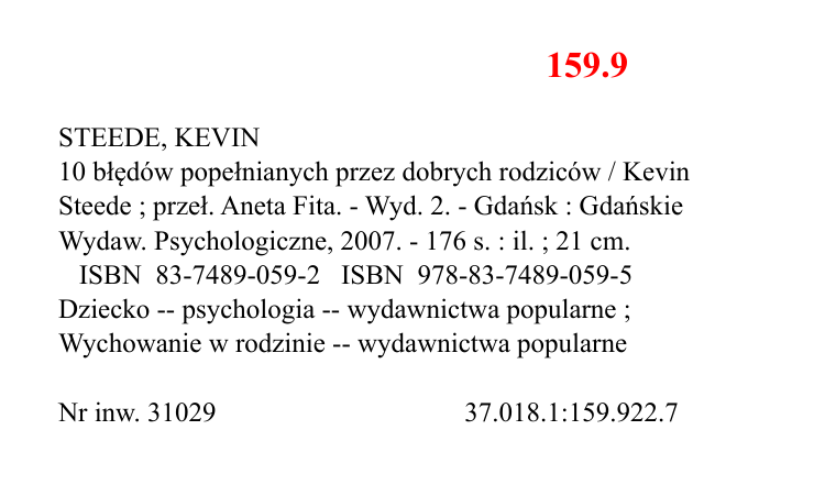 159.9 STEEDE, KEVIN 10 błędów popełnianych przez dobrych rodziców / Kevin Steede ; przeł. Aneta Fita. - Wyd. 2. - Gdańsk : Gdańskie Wydaw. Psychologiczne, 2007. - 176 s. : il. ; 21 cm. ISBN 83-7489-059-2 ISBN 978-83-7489-059-5 Dziecko -- psychologia -- wydawnictwa popularne ; Wychowanie w rodzinie -- wydawnictwa popularne Nr inw. 31029 37.018.1:159.922.7 159.9 ARONSON, ELLIOT Człowiek - istota społeczna / Elliot Aronson ; przeł. Józef Radzicki. - Wyd. 11, 2 dodr. - Warszawa : Wydaw. Naukowe PWN, 2006. - 481 s. ; 24 cm. - ( Biblioteka Psychologii Współczesnej ) ISBN 83-01-14497-1 ISBN 978-83-01-14497-5 Psychologia społeczna -- podręcznik akademicki Nr inw. 31030 159.9:316.6](075.8) 159.9 LUBIT, ROY H. Toksyczni ludzie : jak z nimi współpracować / Roy H. Lubit ; [tł. Marcin Kowalczyk, Grzegorz P. Kowalski]. - Gliwice : Wydawnictwo Helion, cop. 2006. - 317 s. : il. ; 24 cm. (Onepress Exclusive ) Bibliogr. przy rozdz. Indeks. ISBN 83-246-0344-1 -2- Inteligencja emocjonalna -- wydawnictwa popularne ; Konflikt -- psychologia -- wydawnictwa popularne ; Menedżerowie -psychologia -- wydawnictwa popularne ; Stosunki interpersonalne -- wydawnictwa popularne Nr inw. 31031 159.9-057.17:159.95:159.942:316.47 316 Demokracja w Polsce : doświadczanie zmian / pod red. Urszuli Jakubowskiej, Krystyny Skarżyńskiej. - Warszawa : Wydawnictwo Szkoły Wyższej Psychologii Społecznej "Academica" 2005. - 351 s. : wykr. ; 24 cm. Bibliogr. przy rozdz. ISBN 83-89281-15-5 Demokracja--Polska--1990- ; Społeczeństwo obywatelskie--Polska--1990- ; Komunikacja w polityce--Polska--1990- ; Tożsamość społeczna--Polska--1990; Zmiana społeczna--Polska--aspekt psychologiczny--1990Nr inw. 31032 316.422:316.6](438)"1989/..." 159.9 Przytulanki czyli Wierszyki na dziecięce masażyki : zabawy relacyjno-relaksujące / oprac. Marta Bogdanowicz ; il. Cezariusz Deliński. - Wyd. 5. - Gdańsk : Harmonia, 2008. - 61 s. : il. kolor. ; 22x28 cm. ISBN 978-83-7134-149-6 Dziecko -- psychologia -- wydawnictwa popularne ; Gry i zabawy ; Techniki relaksacyjne -- wydawnictwa popularne Nr inw. 31033 159.922.7:796.2 159.9 OSHO Księga dzieci : nie bój się być sobą /Osho ; przeł. Paweł Karpowicz. - Warszawa : Jacek Santorski & CO, 2008. - 252 s. ; 21 cm. - ( Biblioteka Osho ) ISBN 978-83-7554-056-7 Dziecko -- psychologia ; Wychowanie w rodzinie -psychologia Nr inw. 31034 159.922.7:37.018.1 159.9 OSHO Medytacja : pierwsza i ostatnia wolność : przewodnik po medytacjach Osho / Osho ; przeł. Joanna Grabiak. - Wyd. 2, popr. - Warszawa : Garmond, 2008. - 281 s. ; 20 cm. ISBN 978-83-86746-96-5 Medytacja Nr inw. 31035 159.961 159.9 OSHO Dojrzałość : odpowiedzialność bycia sobą / Osho ; przekł. z jęz. ang. Bogusława Jurkevich, Magdalena Stefańczuk. Warszawa : "Garmond", 2006. - 224 s. ; 20 cm. - ( Nowy Horyzont ) ISBN 83-86746-59-9 Samorealizacja ; Samowychowanie Nr inw. 31036 159.923 159.9 OSHO Empatia : najpiękniejszy rozkwit miłości / Osho ; przekł. z jęz. ang. Magdalena Stefańczuk. - Warszawa : Nowy Horyzont, 2008. - 224 s. ; 20 cm. ISBN 978-83-60895-05-4 Empatia ; Psychologia rozwojowa -- zagadnienia Nr inw. 31037 159.94:159.922 159.9 OSHO Inteligencja : twórcza odpowiedź na nasze czasy / Osho ; przekł. z ang. Henryk Smagacz. - Warszawa : Nowy Horyzont AW, 2007. - 241 s. ; 20 cm. - ( Nowy Horyzont ) ISBN 978-83-60895-04-7 Inteligencja ; Samopoznanie ; Samorealizacja Nr inw. 31038 159.95 159.9 OSHO Kreatywność : uwolnij swą wewnętrzną moc / Osho ; przekł. z jęz. ang. Bogusława Jurkevich, Magdalena Stefańczuk. Warszawa ; Łomianki : Garmond, 2006. - 208 s. ; 21 cm. ( Nowy Horyzont ) ISBN 83-86746-54-8 Samopoznanie ; Samorealizacja ; Twórczość -- psychologia Nr inw. 31039 159.923:159.928 159.9 OSHO Intuicja : wiedza wykraczająca ponad logikę / Osho ; przekł. z jęz. ang. Magdalena Stefańczuk. - Warszawa : Nowy Horyzont, 2008. - 189 s. ; 20 cm. - ( Horyzont ) ISBN 978-83-60895-08-5 Intuicja -- psychologia Nr inw. 31040 159.956 159.9 OSHO Wolność : odwaga bycia sobą / Osho ; przekł. z jęz. ang. Henryk Smagacz. - Warszawa : Nowy Horyzont, 2008. - 200 s. ; 20 cm. - ( Nowy Horyzont ) ISBN 978-83-60895-06-1 Samorealizacja ; Wolność -- psychologia Nr inw. 31041 159.947 81(03) Wielki słownik polsko-rosyjski = Pol'sko-russkij slovar' / Jan Wawrzyńczyk [et al.] ; red. nacz. Jan Wawrzyńczyk. Warszawa : Wydaw. Naukowe PWN, 2005. - 922 s. ; 27 cm. Teksty pomocnicze na wyklejkach. - Tyt. grzb.: Wielki słownik polsko-rosyjski : pol'skij. - Errata dot.: Wielki słównik rosyjsko-polski [...], wyd. Warszawa 2004. - Bibliogr. ISBN 83-01-14319-3 Słownik polsko-rosyjski Nr inw. 31042 811.162.1::811.161.1]'374(03) 81(03) Wielki słownik rosyjsko-polski z kluczem polsko-rosyjskim / Jan Wawrzyńczyk [et al.] ; red. nacz. Jan Wawrzyńczyk. -Warszawa : Wydaw. Naukowe PWN, 2004. -- 1360 s. ; 27 cm. Teksty pomocnicze na wyklejkach. - Na okł. podtyt.: russkij. - Tyt. ze s. przedtyt.: Pol'skij-russkij. - Tyt. grzbiet.: Wielki słownik rosyjsko-polski : russkij. ISBN 83-01-14171-9 Słownik rosyjsko polski ; Słownik polsko-rosyjski Nr inw. 31043 811.161.1::811.162.1]'374(03) 159.9 ZIMBARDO, PHILIP G. Efekt Lucyfera : dlaczego dobrzy ludzie czynią zło? / Philip Zimbardo ; przeł. Anna Cybulko [et al.] ; red. nauk. Maria Materska. - Warszawa : Wydaw. Naukowe PWN, 2008. - 486 s. : il. ; 25 cm. - ( Biblioteka Psychologii Współczesnej ) ISBN 978-83-01-15570-4 Dobro -- psychologia -- podręcznik akademicki ; Postawy -- podręcznik akademicki ; Psychologia społeczna -podręcznik akademicki ; Zło -- psychologia -- podręcznik akademicki Nr inw. 31044 159.9:111.84:316.6](075.8) 821-3 pol. KALICIŃSKA, MAŁGORZATA Miłość nad rozlewiskiem / Małgorzata Kalicińska. - Poznań : Zysk i S-ka, cop. 2008. - 349 s. ; 24 cm. - ( Trylogia mazurska / Małgorzata Kalicińska [3] ) ISBN 978-83-7506-266-3 Powieść polska -- 21 w. Nr inw. 31045 821.162.1-3 929A/Z CZERWIŃSKA, ANNA GórFanka : moje ABC w skale i lo