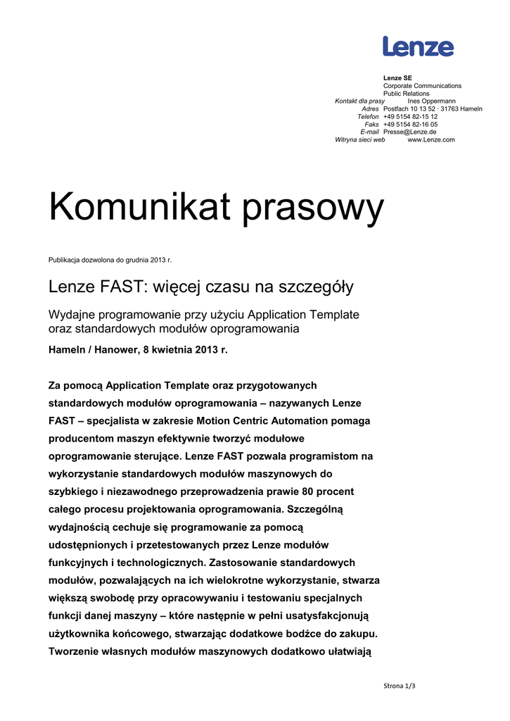 Lenze SE Corporate Communications Public Relations Kontakt dla prasy Ines Oppermann Adres Postfach 10 13 52 · 31763 Hameln Telefon +49 5154 82-15 12 Faks +49 5154 82-16 05 E-mail [email protected] Witryna sieci web www.Lenze.com Komunikat prasowy Publikacja dozwolona do grudnia 2013 r. Lenze FAST: więcej czasu na szczegóły Wydajne programowanie przy użyciu Application Template oraz standardowych modułów oprogramowania Hameln / Hanower, 8 kwietnia 2013 r. Za pomocą Application Template oraz przygotowanych standardowych modułów oprogramowania – nazywanych Lenze FAST – specjalista w zakresie Motion Centric Automation pomaga producentom maszyn efektywnie tworzyć modułowe oprogramowanie sterujące. Lenze FAST pozwala programistom na wykorzystanie standardowych modułów maszynowych do szybkiego i niezawodnego przeprowadzenia prawie 80 procent całego procesu projektowania oprogramowania. Szczególną wydajnością cechuje się programowanie za pomocą udostępnionych i przetestowanych przez Lenze modułów funkcyjnych i technologicznych. Zastosowanie standardowych modułów, pozwalających na ich wielokrotne wykorzystanie, stwarza większą swobodę przy opracowywaniu i testowaniu specjalnych funkcji danej maszyny – które następnie w pełni usatysfakcjonują użytkownika końcowego, stwarzając dodatkowe bodźce do zakupu. Tworzenie własnych modułów maszynowych dodatkowo ułatwiają Strona 1/3 szablony aplikacyjne Lenze Application Template, zawierające wymagane struktury do standaryzacji oprogramowania. Coraz częściej wymagana wyraźna redukcja nakładów na opracowywanie oprogramowania jest możliwa przy konstruowaniu maszyn przez wykorzystanie standardowego oprogramowania. Doświadczenie pokazuje, że 80 procent oprogramowania nowej maszyny może zostać wygenerowane przy użyciu kodu pochodzącego z wersji do poprzednich generacji lub udostępnionego przez partnerów systemowych, jakim jest np. firma Lenze, w postaci gotowych modułów technologicznych. Podstawowym warunkiem jest jednak posiadanie oprogramowania o odpowiedniej strukturze. Aby ułatwić ten krok, firma Lenze opracowała szablon Application Template udostępniający ważne elementy, takie jak zarządzanie błędami, silnik statusów do zmiany statusów maszyny oraz interfejsy komunikacyjne, i zapewniający w ten sposób niezbędną standaryzację. Opracowane w oparciu o szablon Application Template moduły oprogramowania mogą być niewielkim wysiłkiem łączone ze sobą jak klocki, są łatwo zrozumiałe i mogą być wygodnie ponownie wykorzystywane. Aby dodatkowo przyspieszyć pracę, Lenze sukcesywnie dostarcza cały szereg standardowych modułów oprogramowania, realizujących podstawowe funkcje maszyny. Należą do nich na przykład moduły podawania, rozwijania, pakowania w folię, zgrzewania i transportu. Standardowe moduły oprogramowania Lenze są testowane i podlegają ciągłemu rozwojowi. Dzięki możliwości (ponownego) wykorzystania przetestowanych modułów można jednocześnie obniżyć koszty, zminimalizować błędy i uzyskać dodatkowy cenny czas na realizację, testowanie i uruchamianie funkcji maszyny, zapewniające jej producentowi ważne argumenty wobec jego klientów. Liczba znaków ok. 2849 (ze spacjami) Materiał ilustracyjny Zdjęcia i tekst można pobrać w dziale News & Presse na stronie internetowej Lenze SE (www.Lenze.com). Będziemy wdzięczni za bezpłatną publikację tych informacji na Państwa stronie internetowej. Strona 2/3 Podpis pod ilustracją Modułowe sterowanie maszyn bez tajemnic – standardowe moduły oprogramowania Lenze umożliwiają przeprowadzenie 80 procent procesu projektowania oprogramowania w ciągu tylko 20 procent typowego czasu. Informacje o firmie Lenze Grupa Lenze jest zarządzana przez spółkę holdingową Lenze SE z siedzibą główną w Aerzen niedaleko Hameln w Dolnej Saksonii. Jako działający na całym świecie specjalista Motion Centric Automation, firma Lenze oferuje szeroki asortyment produktów i usług, obejmujący układy sterowania i wizualizacji – poprzez napędy elektryczne aż po elektromechanikę – a także usługi inżynierskie i narzędzia do projektowania. Wspólnie z klientem eksperci Lenze opracowują kompletne rozwiązania napędów i automatyzacji, ułatwiające realizację, produkcję i serwisowanie maszyn. Firma Lenze to jeden z nielicznych dostawców na rynku, którzy pomagają producentom maszyn we wszystkich fazach powstawania i produkcji ich urządzeń. Lenze zatrudnia na całym świecie ponad 3100 pracowników i posiada własne spółki dystrybucyjne, oddziały konstrukcyjne i zakłady produkcyjne oraz sieć partnerów serwisowych w 60 krajach. Siedziba główna przedsiębiorstwa w Niemczech posiada duży dział badawczo-rozwojowy, dwa zakłady produkcyjne oraz centrum logistyczne, zapewniające dostawy do naszych klientów w Europie Północnej i Wschodniej. Klientom pomaga międzynarodowa sieć inżynierów zajmujących się dystrybucją i techniką zastosowań. Strona 3/3