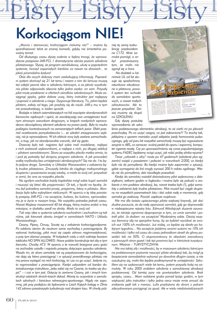 Listy Listy Listy L Listy Listy Listy Korkociągom NIE! „Mocno i stanowczo; korkociągom mówimy nie!” – można by sparafrazować tekst ze znanej komedii, gdyby nie śmiertelnie poważny temat. Od dłuższego czasu słyszę walenie w bębny trwogi, że wprowadzenie przepisów JAR-FCL 1 dramatycznie obniża poziom szkolenia pilotażowego. Słyszę, że program aeroklubowy, ukuty w poprzednim systemie, tworzył wspaniałych lotników co nawet na drzwiach... to jakaś piramidalna bzdura! Otóż dla owych doboszy mam zaskakującą informację. Poprzedni system skończył się 21 lat temu i razem z nim do lamusa muszą też odejść pewne idee w szkoleniu lotniczym, a za jakość wyszkolenia pilota odpowiada obecnie tylko jedna osoba: on sam. Przyszły pilot może przebierać w ofertach ośrodków szkoleniowych. Może zasięgnąć języka, gdzie dobrze uczą, który instruktor jest najlepszy i poprosić o szkolenie u niego. Dysponuje literaturą. To, jakim będzie pilotem, zależy od tego, jak przyłoży się do nauki. JAR-y mu w tym nie przeszkadzają, w żaden sposób. Bodajże w latach osiemdziesiątych na fali zwycięstw skandynawskich kierowców rajdowych i opinii, że zawdzięczają swe umiejętności trudnym zimowym warunkom drogowym, w krajach nordyckich wprowadzono obowiązkowy element szkolenia na prawo jazdy. Była to nauka poślizgów kontrolowanych na zamarzniętych taflach jezior. Efekt przerósł oczekiwania pomysłodawców i... ze szkoleń zrezygnowano szybciej, niż je wprowadzono. W ich efekcie rowy były zasłane samochodami, a trup, jak na skandynawskie warunki, słał się gęsto. Drzewiej było tak: najpierw byli sobie mali modelarze, najlepsi z nich zostawali szybownikami, a najlepsi z nich, po długiej selekcji – pilotami samolotowymi. Skoro za wszystko płaciła matka armia, to i pod jej potrzeby był skrojony program szkolenia. A jak prowadzić walkę myśliwską bez umiejętności akrobacyjnych? Się nie da. I to była jedyna droga. Samoloty w Układzie Warszawskim z założenia były trudne pilotażowo. Zmuszały lotnika do ciągłego maksymalnego skupienia i poszerzania swojej wiedzy, a miało to swój cel: przyszłość w armii, bo ona za wszystko płaciła. Na zgniłym zachodzie każdy kapitalista mógł sobie kupić samolot i nauczyć się latać dla przyjemności. Ot tak, z łączki na łączkę. Jemu był potrzebny samolot prosty, przyjemny, łatwy w pilotażu. Akrobacja była tylko wybrykiem nielicznych. W oparciu o tę ideę powstały przepisy JAR-FCL i na szczęście, kulawo, bo kulawo, wprowadzamy je w życie w naszym kraju. Na wszystko potrzeba jednak czasu. Nawet Mojżesz maszerował 40 lat drogą, którą można zrobić w trzy miesiące, w dodatku szedł na skróty. Miało to swój cel. Tak więc idee w systemie szkolenia wschodnim i zachodnim są tak różne, jak kierunek obrotu śmigieł w samolotach NATO i Układu Warszawskiego. Cessny, Pipery, Cirrusy, Socaty są z założenia korkociągoodporne. Po oddaniu sterów do neutrum same wychodzą z przeciągnięcia. By wykonać korkociąg, pilot musi się często zdrowo nagimnastykować, a przy tym złamać przepisy. W kokpitach wielu z nich widnieje bowiem tabliczka NO SPIN ALLOWED. Nowe polskie konstrukcje też idą w tym kierunku. Choćby AT3. W oparciu o te warunki brzegowe paru gości na zachodzie usiadło i napisało przepisy dotyczące sposobu szkolenia. Wyszło im, że skoro samoloty nie są przystosowane do korkociągów, nie dają się łatwo przeciągnąć i w sytuacji prawidłowego pilotażu nie ma prawa wystąpić na nich korkociąg, to i po co go uczyć. Jedynie co, to wyprowadzać z przeciągnięcia. Kiedyś usłyszałem od bardzo doświadczonego instruktora „żeby zabić się na Cessnie, to trzeba się skupić” – i coś w tym jest. Dotyczy to zarówno Cessny, jak i innych konstrukcji ostatnich dwóch-trzech dekad. Mówię tu oczywiście o samolotach szkolnych i lotnictwa rekreacyjno-sportowego. Nigdy nie zapomnę, jak przy podejściu do lądowania w Lisich Kątach kolegę w Zlinie 142 zdrowo przestraszyła turbulencja nad skrajem lasu. W chwilę póź- 60 PLAR 8/2010 niej tę samą turbulencję przeleciałem na C172. Mnie samolot pomógł, a on był przestraszony tym, że mało nie sypnął się w kora. Na dodatek w lotnictwie UL od lat stosuje się spadochrony ratunkowe wbudowane w płatowce, powoli system ten wchodzi do samolotów sportowych, a nawet małych odrzutowców. Ale to jeszcze przyszłość. Dzisiaj musimy się skupić na SZKOLENIU. Gdy słyszę postulaty wprowadzenia do szkolenia podstawowego elementów akrobacji, to aż ciarki mi po plecach przechodzą. Po co uczyć czegoś, co jest zabronione?! To trochę tak, jakbyśmy z uporem maniaka uczyli adeptów jazdy hamowania pulsacyjnego, gdy od paru lat wszystkie samochody muszą być wyposażone seryjnie w ABS, co oznacza: wciśnij pedał do oporu i zapomnij, komputer ogarnie resztę. Czy po upowszechnieniu się coraz popularniejszego systemu FADEC będziemy wciąż uczyć, jak robić próbę silnika ręcznie? Teraz „człowiek z ulicy” może po 47 godzinach (szkolenie plus egzamin) wsiąść z pasażerem i polecieć w warunkach 2/200, co kiedyś było nie do pomyślenia. Bo kiedyś można było zapomnieć o sytuacji, gdzie wymagania do linii mogły wynosić 200 h nalotu ogólnego. Wtedy nie do pomyślenia, dziś nieodległa przeszłość. Kiedyś do samolotu wsiadał doświadczony pilot szybowcowy z dziesiątkami, setkami godzin w logbooku i można było się pokusić o zrobienie z nim podstaw akrobacji, ba, nawet trzeba było (!), gdyż samoloty z założenia były trudne pilotażowo. Pilot musiał być ciągle skupiony na wszystkich parametrach lotu i dać sobie radę w momencie, gdy samolot go zaskoczy. Powód: zaplecze wojskowe. Nie ma dla świeżo upieczonego pilota większej krzywdy, jak dać złudne poczucie, że da radę opanować samolot, gdy go doprowadzi w niebezpieczne rejestry lotu. Edmund Mikołaj