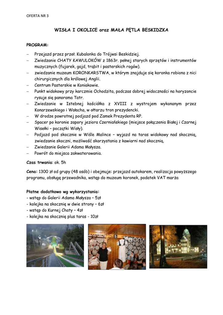 OFERTA NR 3 WISŁA I OKOLICE oraz MAŁA PĘTLA BESKIDZKA PROGRAM: Przejazd przez przeł. Kubalonka do Trójwsi Beskidziej. Zwiedzanie CHATY KAWULOKÓW z 1863r. pełnej starych sprzętów i instrumentów muzycznych (fujarek, gajd, trąbit i pasterskich rogów). zwiedzanie muzeum KORONKARSTWA, w którym znajduje się koronka robiona z nici chirurgicznych dla królowej Anglii. Centrum Pasterskie w Koniakowie. Punkt widokowy przy karczmie Ochodzita, podczas dobrej widoczności na horyzoncie rysuje się panorama Tatr. Zwiedzanie w Istebnej kościółka z XVIII z wystrojem wykonanym przez Konarzewskiego i Wałacha, w ołtarzu tron prezydencki. W drodze powrotnej podjazd pod Zamek Prezydenta RP. Spacer po koronie zapory jeziora Czerniańskiego (miejsce połączenia Białej i Czarnej Wisełki – początki Wisły). Podjazd pod skocznie w Wiśle Malince – wyjazd na taras widokowy nad skocznią, zwiedzanie skoczni, możliwość skorzystania z kawiarni nad skocznią. Zwiedzanie Galerii Adama Małysza. Powrót do miejsca zakwaterowania. Czas trwania: ok. 5h Cena: 1300 zł od grupy (48 osób) i obejmuje: przejazd autokarem, realizacja powyższego programu, obsługę przewodnika, wstęp do muzeum koronek, podatek VAT marża Płatne dodatkowo wg wykorzystania: - wstęp do Galerii Adama Małysza – 5zł - kolejka na skocznię w dwie strony – 6zł - wstęp do Kurnej Chaty – 4zł - kolejka na skocznię plus taras - 10zł
