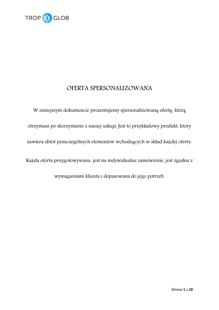OFERTA SPERSONALIZOWANA W niniejszym dokumencie prezentujemy spersonalizowaną ofertę, którą otrzymasz po skorzystaniu z naszej usługi. Jest to przykładowy produkt, który zawiera zbiór poszczególnych elementów wchodzących w skład każdej oferty. Każda oferta przygotowywana jest na indywidualne zamówienie, jest zgodna z wymaganiami klienta i dopasowana do jego potrzeb. Strona 1 z 10 Oferta Wenecja 15.07. 2015 – 29.07.2015 4 osoby Z przyjemnością prezentujemy Twoją spersonalizowaną ofertę wypoczynku. Zawiera ona wszystkie niezbędne informacje, potrzebne do rezerwacji Twoich wakacji. Klikając na linki umieszczone w poszczególnych elementach oferty, w ciągu kilku minut zarezerwujesz wszystkie usługi online. W razie pytań lub wątpliwości pozostajemy do dyspozycji : [email protected] Dziękujemy za skorzystanie z naszych usług! Życzymy wspaniałego wypoczynku Strona 2 z 10 PRZELOT INFORMACJE DOTYCZĄCE PRZELOTU: Cena : Przelot w cenie 791 zł/osoba Lot : Warszawa Chopin ( WAW) – Wenecja Marco Polo ( VCE) - Warszawa Chopin ( WAW) Linia lotnicza: Austrian Airlines W cenie lotu: bagaż rejestrowany do 20 kg i podręczny do 10 kg Przesiadki : lot z jedną przesiadką w Wiedniu Płatność : kartą kredytową lub debetową SPOSÓB REZERWACJI: 1. Przelot rezerwujemy na stronie : przelot 2. Należy wpisać odpowiednią ilość osób i daty : ilość osób i daty podróży INFO: Dostępne są też tańsze przeloty na ten dzień, ale wybrany został ten który daje najlepsze możliwości transportu z lotniska i najkrótsze przesiadki. Strona 3 z 10 3. Po kliknięciu nastąpi przekierowanie do pośrednika, gdzie należy dokonać płatności za bilety : płatność za bilety Strona 4 z 10 TRANSFER Z LOTNISKA OPCJA NR. 1 INFORMACJE DOTYCZĄCE TRANSFERU: Cena : Transfer w cenie 60 zł /osoba w obie strony Rodzaj transportu : transfer bezpośredni prywatnym samochodem z Malta Lotnisko (MLA) do Naxxar SPOSÓB REZERWACJI: Transfer rezerwujemy na poniższej stronie, należy wpisać miejsce początkowe, docelowe i daty podróży oraz godziny lotów : transfer Strona 5 z 10 OPCJA NR. 2 INFORMACJE DOTYCZĄCE TRANSFERU: Cena : Transfer w cenie 10 EUR /osoba w obie strony Rodzaj transportu : Autobus miejski – Lotnisko Wenecja Marco Polo – Duna Verde Rozkład jazdy : rozkład SPOSÓB REZERWACJI: Bilety na autobus można zakupić : 1. 2. 3. 4. U kierowcy autobusu W hali przylotów na lotnisku w kasie biletowej oznaczonej : Transport Publiczny W automatach znajdujących się w punktach odbioru bagażu przy taśmie nr 3 i 5 W automatach na przystanku autobusowym Strona 6 z 10 NOCLEG INFORMACJE DOTYCZĄCE NOCLEGU: Cena : Nocleg w cenie 338 zł/osoba za 7 dni Miejscowość: Portorosa k/Furnari Położenie : ok 150 km od lotniska w Catanii, 30 km do Milazzo. Typ zakwaterowania : Studia 2+2 z anaksem kuchennym, 100 m od piaszczystej plaży, basen 5 min drogi od kompleksu. Wyżywienie : we własnym zakresie Atrakcje w pobliżu : wyspy Eolskie, Etna. SPOSÓB REZERWACJI: Rezerwacji apartamentu i płatności należy dokonać online wchodząc na stronę : Furnari apartament Strona 7 z 10 WYNAJEM SAMOCHODU INFORMACJE DOTYCZĄCE SAMOCHODU: Cena : 141,16 zł za 7 dni Typ auta : Fiat Panda, 5 osobowy Wypożyczalnia : Centauro Miejsce odbioru i zwrotu : Lotnisko Malaga Opcjonalnie : pełne ubezpieczenie samochodu bez wkładu własnego to kwota : 32,91 zł za dzień Płatność : karta kredytowa SPOSÓB REZERWACJI: Samochód na cały okres pobytu należy zarezerwować klikając na link poniżej, wpisując miejsce, godzinę i dokładną lokalizację odbioru i zwrotu samochodu: wynajem auta Strona 8 z 10 PODSUMOWANIE Kwota całkowita : XXXX PLN do XXXX PLN w zależności od wybranej opcji apartamentu i transferu z lotniska. Strona 9 z 10 KONTAKT Mail : [email protected] Tel. 730 977 540 Strona 10 z 10