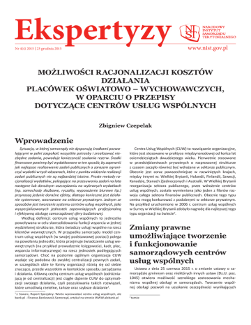 Ekspertyzy Nr 4(4) 2015 | 23 grudnia 2015 www.nist.gov.pl MOŻLIWOŚCI RACJONALIZACJI KOSZTÓW DZIAŁANIA PLACÓWEK OŚWIATOWO – WYCHOWAWCZYCH, W OPARCIU O PRZEPISY DOTYCZĄCE CENTRÓW USŁUG WSPÓLNYCH Zbigniew Czepelak Wprowadzenie Sytuacja, w której samorządy nie dysponują środkami pozwalającymi w pełni zaspokoić wszystkie potrzeby i zrealizować niezbędne zadania, powoduje konieczność szukania rezerw. Środki finansowe powinny być wydatkowane w ten sposób, by zapewnić jak najlepsze realizowanie zadań publicznych a zarazem ograniczyć wydatki w tych obszarach, które z punktu widzenia realizacji zadań publicznych nie są najbardziej istotne. Proste metody racjonalizacji wydatków, polegające na przesuwaniu zadań na lata następne lub doraźnym oszczędzaniu na wybranych wydatkach (np. samochody służbowe, ryczałty, wyposażenie biurowe itp.) przynoszą jedynie doraźne efekty, dlatego konieczne jest działanie systemowe, wzorowane na sektorze prywatnym. Jednym ze sposobów jest tworzenie systemu centrów usług wspólnych, jako wyspecjalizowanych jednostek zapewniających profesjonalną i efektywną obsługę samorządowej sfery budżetowej. Według definicji: centrum usług wspólnych to jednostka powoływana w celu skonsolidowania funkcji wsparcia w jednej wydzielonej strukturze, która świadczy usługi wspólne na rzecz klientów wewnętrznych. W przypadku samorządu model centrum usług wspólnych (w swojej podstawowej postaci) polega na powołaniu jednostki, która przejmuje świadczenie usług wewnętrznych (na przykład prowadzenie księgowości, kadr, płac, wsparcia informatycznego) na rzecz jednostek podlegających samorządowi. Choć na poziomie ogólnym organizacja CUW wydaje się podobna do zwykłej centralizacji pewnych zadań, w szczegółach obie te formy organizacji różnią się od siebie znacząco, przede wszystkim w kontekście sposobu zarządzania i działania. Główną cechą centrum usług wspólnych (odróżniającą je od centralizacji) jest ciągłe dążenie CUW do optymalizacji swojego działania, czyli poszukiwania takich rozwiązań, które umożliwią rzetelne, tańsze oraz szybsze działanie1. J. Szwarc, Raport Specjalny: Warto wprowadzać centra usług wspólnych, ale bank.pl - Finanse.Bankowość.Samorząd, artykuł na stronie WWW.alebank.pl Centra Usług Wspólnych (CUW) to rozwiązanie organizacyjne, które jest stosowane w praktyce międzynarodowej od końca lat osiemdziesiątych dwudziestego wieku. Pierwotnie stosowane w przedsiębiorstwach prywatnych o rozproszonej strukturze z czasem zaczęło również być wdrażane w sektorze publicznym. Obecnie jest coraz powszechniejsze w rozwiniętych krajach, między innymi w: Wielkiej Brytanii, Holandii, Finlandii, Szwecji, Kanadzie, Stanach Zjednoczonych i Australii. W Wielkiej Brytanii reorganizacja sektora publicznego, przez wdrożenie centrów usług wspólnych, została wymieniona jako jeden z filarów rozwoju całego sektora finansów publicznych. Obecnie tego typu centra mogą konkurować z podobnymi w sektorze prywatnym. Na przykład uruchomione w 2006 r. centrum usług wspólnych w Surrey w Wielkiej Brytanii zdobyło nagrodę dla najlepszej tego typu organizacji na świecie2. Zmiany prawne umożliwiające tworzenie i funkcjonowanie samorządowych centrów usług wspólnych Ustawa z dnia 25 czerwca 2015 r. o zmianie ustawy o samorządzie gminnym oraz niektórych innych ustaw (Dz.U. poz. 1045) otwiera możliwość szerokiego zastosowania mechanizmu wspólnej obsługi w samorządach. Tworzenie wspólnej obsługi pozwoli na uzyskanie oszczędności wynikających 1 tamże 2 EKSPERTYZY Nr 4(4) 23 grudnia 2015 z lepszego wykorzystania zasobów ludzkich i materialnych a ponadto pozwoli na zmniejszenie kosztów poprzez specjalizację, poprawi skuteczność zarządzania i przyczyni się do zwiększenia elastyczności organizacji. Centrum usług wspólnych może zapewnić wspólną obsługę: • jednostkom organizacyjnym jednostek samorządu terytorialnego zaliczanym do sektora finansów publicznych, • samorządowym instytucjom kultury, • innym zaliczanym do sektora finansów publicznych samorządowym osobom prawnym utworzonym na podstawie odrębnych ustaw w celu wykonywania zadań publicznych, z wyłączeniem przedsiębiorstw, instytutów badawczych, banków i spółek prawa handlowego. Jednostki na rzecz których może zostać zorganizowana wspólna obsługa określane są w ustawie mianem „jednostek obsługiwanych”. Jednostki świadczące wspólną obsługę określane są natomiast mianem „jednostek obsługujących”. Rolę tę mogą pełnić: • urząd gminy; • starostwo powiatowe; • urząd marszałkowski; • inna jednostka samorządu terytorialnego; • jednostka organizacyjna związku międzygminnego, związku powiatów, związku powiatowo-gminnego . Głównymi celami tworzenia centrów usług wspólnych, są: • Poprawa efektywności zarządzania w administracji samorządowej, • Korzyści ekonomiczne wynikające z konsolidacji zarządzania, • Poprawa jakości usług publicznych świadczonych przez samorządy3. Zakres wspólnej obsługi, stanowiący przedmiot działalności jednostek obsługujących, dotyczy, w szczególności: zadań natury administracyjnej, finansowej i organizacyjnej. Użycie przez ustawodawcę określenia „w szczególności” wskazuje, że zakres obsługi nie jest katalogiem zamkniętym co daje dużą elastyczność w rozwoju tego typu instytucji. Nowe przepisy przewidują odmienne rozwiązania w zależności od tego jakich jednostek dotyczy utworzenie CUW. W rzypadku jednostek organizacyjnych JST zaliczanych do sektora finansów publicznych, dla zorganizowania wspólnej obsługi organ stanowiący JST będzie musiał podjąć uchwałę, która określi, w szczególności: 1. Jednostki obsługujące; 2. Jednostki obsługiwane; 3. Zakres obowiązków powierzonych jednostkom obsługującym w ramach wspólnej obsługi. Powyższa uchw