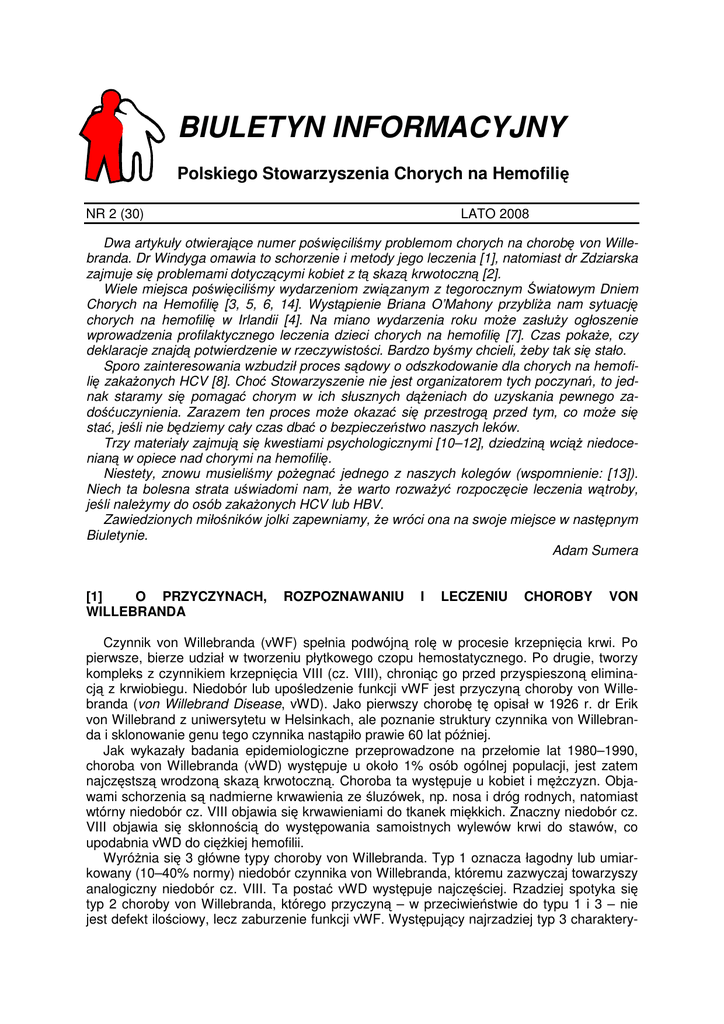 BIULETYN INFORMACYJNY Polskiego Stowarzyszenia Chorych na Hemofilię NR 2 (30) LATO 2008 Dwa artykuły otwierające numer poświęciliśmy problemom chorych na chorobę von Willebranda. Dr Windyga omawia to schorzenie i metody jego leczenia [1], natomiast dr Zdziarska zajmuje się problemami dotyczącymi kobiet z tą skazą krwotoczną [2]. Wiele miejsca poświęciliśmy wydarzeniom związanym z tegorocznym Światowym Dniem Chorych na Hemofilię [3, 5, 6, 14]. Wystąpienie Briana O’Mahony przybliża nam sytuację chorych na hemofilię w Irlandii [4]. Na miano wydarzenia roku może zasłuży ogłoszenie wprowadzenia profilaktycznego leczenia dzieci chorych na hemofilię [7]. Czas pokaże, czy deklaracje znajdą potwierdzenie w rzeczywistości. Bardzo byśmy chcieli, żeby tak się stało. Sporo zainteresowania wzbudził proces sądowy o odszkodowanie dla chorych na hemofilię zakażonych HCV [8]. Choć Stowarzyszenie nie jest organizatorem tych poczynań, to jednak staramy się pomagać chorym w ich słusznych dążeniach do uzyskania pewnego zadośćuczynienia. Zarazem ten proces może okazać się przestrogą przed tym, co może się stać, jeśli nie będziemy cały czas dbać o bezpieczeństwo naszych leków. Trzy materiały zajmują się kwestiami psychologicznymi [10–12], dziedziną wciąż niedocenianą w opiece nad chorymi na hemofilię. Niestety, znowu musieliśmy pożegnać jednego z naszych kolegów (wspomnienie: [13]). Niech ta bolesna strata uświadomi nam, że warto rozważyć rozpoczęcie leczenia wątroby, jeśli należymy do osób zakażonych HCV lub HBV. Zawiedzionych miłośników jolki zapewniamy, że wróci ona na swoje miejsce w następnym Biuletynie. Adam Sumera [1] O PRZYCZYNACH, WILLEBRANDA ROZPOZNAWANIU I LECZENIU CHOROBY VON Czynnik von Willebranda (vWF) spełnia podwójną rolę w procesie krzepnięcia krwi. Po pierwsze, bierze udział w tworzeniu płytkowego czopu hemostatycznego. Po drugie, tworzy kompleks z czynnikiem krzepnięcia VIII (cz. VIII), chroniąc go przed przyspieszoną eliminacją z krwiobiegu. Niedobór lub upośledzenie funkcji vWF jest przyczyną choroby von Willebranda (von Willebrand Disease, vWD). Jako pierwszy chorobę tę opisał w 1926 r. dr Erik von Willebrand z uniwersytetu w Helsinkach, ale poznanie struktury czynnika von Willebranda i sklonowanie genu tego czynnika nastąpiło prawie 60 lat później. Jak wykazały badania epidemiologiczne przeprowadzone na przełomie lat 1980–1990, choroba von Willebranda (vWD) występuje u około 1% osób ogólnej populacji, jest zatem najczęstszą wrodzoną skazą krwotoczną. Choroba ta występuje u kobiet i mężczyzn. Objawami schorzenia są nadmierne krwawienia ze śluzówek, np. nosa i dróg rodnych, natomiast wtórny niedobór cz. VIII objawia się krwawieniami do tkanek miękkich. Znaczny niedobór cz. VIII objawia się skłonnością do występowania samoistnych wylewów krwi do stawów, co upodabnia vWD do ciężkiej hemofilii. Wyróżnia się 3 główne typy choroby von Willebranda. Typ 1 oznacza łagodny lub umiarkowany (10–40% normy) niedobór czynnika von Willebranda, któremu zazwyczaj towarzyszy analogiczny niedobór cz. VIII. Ta postać vWD występuje najczęściej. Rzadziej spotyka się typ 2 choroby von Willebranda, którego przyczyną – w przeciwieństwie do typu 1 i 3 – nie jest defekt ilościowy, lecz zaburzenie funkcji vWF. Występujący najrzadziej typ 3 charaktery- zuje ciężki niedobór lub całkowity brak vWF i zazwyczaj bardzo mała zawartość (<10%) cz. VIII. Klasyfikacja vWD dość dobrze odzwierciedla przebieg kliniczny choroby. Skaza krwotoczna jest najłagodniejsza w typie 1, zazwyczaj nieco cięższa w typie 2, zaś najcięższa w typie 3 choroby von Willebranda. Choć opisano ponad 250 różnorakich mutacji w genie czynnika von Willebranda, których wynikiem są zaburzenia ilościowe i/lub jakościowe vWF, to jak na razie nie udało się stworzyć genetycznej klasyfikacji tej choroby. Więcej informacji na temat podłoża genetycznego vWD można znaleźć na stronie internetowej www.sheffield.ac.uk/vwf. W leczeniu krwawień u pacjentów z chorobą von Willebranda wykorzystuje się obecnie przede wszystkim dwa leki: desmopresynę (DDAVP) i liofilizowane koncentraty czynników krzepnięcia krwi. U osób zdrowych oraz u chorych na łagodną hemofilię A i u pacjentów z wybranymi (łagodnymi) postaciami vWD, DDAVP powoduje przejściowe zwiększenie zawartości vWF i cz. VIII w krwiobiegu. Mechanizm działania DDAVP polega na stymulacji uwalniania czynnika von Willebranda magazynowanego w śródbłonku naczyniowym do osocza. W ciągu 5–7 dni od rozpoczęcia podawania DDAVP dochodzi do wyczerpania śródbłonkowych magazynów czynnika von Willebranda i dalsze stosowanie tego leku nie ma uzasadnienia. Desmopresynę podaje się w dawce 0,3 µg/kg mc. we wlewie dożylnym trwającym co najmniej 30 minut. Niestety w Polsce nie jest zarejestrowany preparat DDAVP w postaci inhalacji donosowych, który podaje się dorosłym w dawce 300 µg, a dzieciom – 150 µg. Bardzo pożyteczne w hamowaniu krwawień śluzówkowych u osób z chorobą von Willebranda są leki antyfibrynolityczne. Kwas aminokapronowy (w dawce 50–60 mg/kg mc. co 4–6 h) lub kwas traneksamowy (w dawce 10–15 mg/kg mc. co 8–12 h) mogą być podawane dożylnie, doustnie lub miejscowo. W celu opanowania nadmiernych krwawień miesiączkowych u kobiet z vWD często sięga się po preparaty zawierające estrogeny i progestageny. We wszystkich przypadkach typu 3 vWD, ale także w znacznym odsetku typu 2 tej choroby desmopresyna jest klinicznie nieskuteczna (śródbłonek naczyniowy nie zawiera vWF w ogóle lub zawiera vWF o silnie zaburzonej strukturze i funkcji). Co więcej, podanie DDAVP u pacjentów z podtypem 2B choroby von Willebranda może prowadzić do istotnej klinicznie małopłytkowości. U części pacjentów po podaniu desmopresyny obserwuje się objawy niepożądane, które niekied