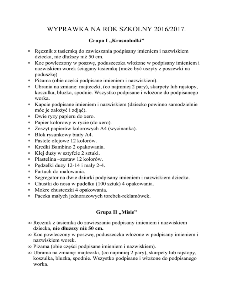 WYPRAWKA NA ROK SZKOLNY 2016/2017. Grupa I „Krasnoludki” ∗ Ręcznik z tasiemką do zawieszania podpisany imieniem i nazwiskiem dziecka, nie dłuższy niż 50 cm. ∗ Koc powleczony w poszwę, poduszeczka włożone w podpisany imieniem i nazwiskiem worek ściągany tasiemką (może być uszyty z poszewki na poduszkę) ∗ Piżama (obie części podpisane imieniem i nazwiskiem). ∗ Ubrania na zmianę: majteczki, (co najmniej 2 pary), skarpety lub rajstopy, koszulka, bluzka, spodnie. Wszystko podpisane i włożone do podpisanego worka. ∗ Kapcie podpisane imieniem i nazwiskiem (dziecko powinno samodzielnie móc je założyć i zdjąć). ∗ Dwie ryzy papieru do xero. ∗ Papier kolorowy w ryzie (do xero). ∗ Zeszyt papierów kolorowych A4 (wycinanka). ∗ Blok rysunkowy biały A4. ∗ Pastele olejowe 12 kolorów. ∗ Kredki Bambino 2 opakowania. ∗ Klej duży w sztyfcie 2 sztuki. ∗ Plastelina –zestaw 12 kolorów. ∗ Pędzelki duży 12-14 i mały 2-4. ∗ Fartuch do malowania. ∗ Segregator na dwie dziurki podpisany imieniem i nazwiskiem dziecka. ∗ Chustki do nosa w pudełku (100 sztuk) 4 opakowania. ∗ Mokre chusteczki 4 opakowania. ∗ Paczka małych jednorazowych torebek-reklamówek. Grupa II „Misie” • Ręcznik z tasiemką do zawieszania podpisany imieniem i nazwiskiem dziecka, nie dłuższy niż 50 cm. • Koc powleczony w poszwę, poduszeczka włożone w podpisany imieniem i nazwiskiem worek. • Piżama (obie części podpisane imieniem i nazwiskiem). • Ubrania na zmianę: majteczki, (co najmniej 2 pary), skarpety lub rajstopy, koszulka, bluzka, spodnie. Wszystko podpisane i włożone do podpisanego worka. • Kapcie podpisane imieniem i nazwiskiem (dziecko powinno samodzielnie móc je założyć i zdjąć). • Kostium gimnastyczny w podpisanym worku (krótkie spodenki lub leginsy i bluzeczka z krótkim rękawem). • Zestaw do mycia zębów: szczoteczka z osłonką na włosie, kubek, pasta do zębów (każda rzecz podpisana niezmywalnym mazakiem). • Dwie ryzy papieru do xero. • Flamastry. • Zeszyt papierów kolorowych A4. • Blok techniczny A4. • Kredki Bambino 2 opakowania. • Klej duży w sztyfcie 2 sztuki. • Pastele olejne. • Fartuch do malowania. • Segregator na dwie dziurki podpisany imieniem i nazwiskiem dziecka. • Chustki w pudełku (100 sztuk) 4 opakowania. • Mokre chusteczki 4 opakowania. Grupa III „Smoki” • Ręcznik z tasiemką do zawieszania podpisany imieniem i nazwiskiem dziecka, nie dłuższy niż 50 cm. • Ubrania na zmianę podpisane i włożone do podpisanego worka. • Kapcie podpisane imieniem i nazwiskiem (dziecko powinno samodzielnie móc je założyć i zdjąć). • Kostium gimnastyczny w podpisanym worku (krótkie spodenki lub leginsy i bluzeczka z krótkim rękawem). • Zestaw do mycia zębów: szczoteczka z osłonką na włosie, pasta, kubek (każda rzecz podpisana niezmywalnym mazakiem). • Dwie ryzy papieru do xero. • Kredki Bambino 2 opakowania. • Ołówek miękki (2 sztuki), kredki drewniane, gumka do ścierania, temperówka włożone do podpisanego piórnika. • Segregator na dwie dziurki podpisany imieniem i nazwiskiem dziecka. • Chustki w pudełku (100 sztuk) 4 opakowania. • Mokre chusteczki 3 opakowania. • Klej w sztyfcie duży. • Flamastry. Grupa IV „Tygrysy” • Ręcznik z tasiemką do zawieszania podpisany imieniem i nazwiskiem dziecka, nie dłuższy niż 50 cm. • Ubrania na zmianę podpisane i włożone do podpisanego worka. • Kapcie podpisane imieniem i nazwiskiem • Kostium gimnastyczny w podpisanym worku (krótkie spodenki lub leginsy i bluzeczka z krótkim rękawem). • Zestaw do mycia zębów: szczoteczka z osłonką na włosie, pasta, kubek (każda rzecz podpisana niezmywalnym mazakiem). • Dwie ryzy papieru do xero. • Piórnik z wyposażeniem ( 2 ołówki, gumka do ścierania, temperówka). • Kredki Bambino świecowe. • Kredki Bambino ołówkowe. • Flamastry. • Pastele. • Fartuch do malowania. • Segregator na dwie dziurki podpisany imieniem i nazwiskiem dziecka. • Chustki w pudełku (100 sztuk) 4 opakowania. • Mokre chusteczki 3 opakowania. • Papier kolorowy format A4.