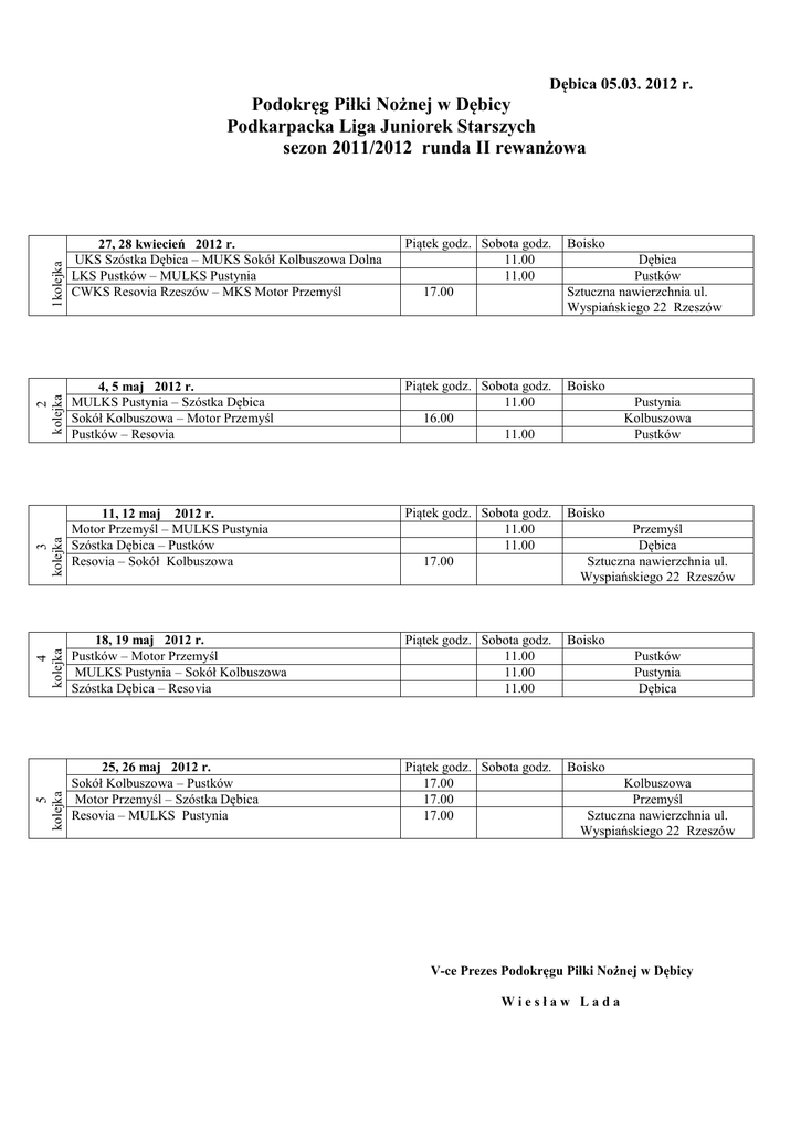 Dębica 05.03. 2012 r. 5 kolejka 4 kolejka 3 kolejka 2 kolejka 1kolejka Podokręg Piłki Nożnej w Dębicy Podkarpacka Liga Juniorek Starszych sezon 2011/2012 runda II rewanżowa 27, 28 kwiecień 2012 r. UKS Szóstka Dębica – MUKS Sokół Kolbuszowa Dolna LKS Pustków – MULKS Pustynia CWKS Resovia Rzeszów – MKS Motor Przemyśl Piątek godz. Sobota godz. 11.00 11.00 17.00 Boisko 4, 5 maj 2012 r. MULKS Pustynia – Szóstka Dębica Sokół Kolbuszowa – Motor Przemyśl Pustków – Resovia Piątek godz. Sobota godz. 11.00 16.00 11.00 Boisko 11, 12 maj 2012 r. Motor Przemyśl – MULKS Pustynia Szóstka Dębica – Pustków Resovia – Sokół Kolbuszowa Piątek godz. Sobota godz. 11.00 11.00 17.00 Boisko 18, 19 maj 2012 r. Pustków – Motor Przemyśl MULKS Pustynia – Sokół Kolbuszowa Szóstka Dębica – Resovia Piątek godz. Sobota godz. 11.00 11.00 11.00 Boisko 25, 26 maj 2012 r. Sokół Kolbuszowa – Pustków Motor Przemyśl – Szóstka Dębica Resovia – MULKS Pustynia Piątek godz. Sobota godz. 17.00 17.00 17.00 Boisko Dębica Pustków Sztuczna nawierzchnia ul. Wyspiańskiego 22 Rzeszów Pustynia Kolbuszowa Pustków Przemyśl Dębica Sztuczna nawierzchnia ul. Wyspiańskiego 22 Rzeszów Pustków Pustynia Dębica Kolbuszowa Przemyśl Sztuczna nawierzchnia ul. Wyspiańskiego 22 Rzeszów V-ce Prezes Podokręgu Piłki Nożnej w Dębicy Wiesław Lada Uwagi; 1. 2. w przypadku zmiany terminu rozpoczęcia zawodów podanej w terminarzu, obowiązkiem gospodarza jest powiadomienie listem poleconym priorytetowym drużyny gości oraz organ prowadzący rozgrywki o terminie i miejscu rozegrania meczu w terminie 21 dni przed zawodami (decyduje data stempla pocztowego). & 11 Regulaminu Rozgrywek Młodzieżowych Podkarpackiego Związku Piłki Nożnej na sezon 2011/2012. Adresy korespondencyjne. Lp. 1. Nazwa klubu Sokół Kolbuszowa Dolna Adres korespondencyjny MUKS Sokół Kolbuszowa Dolna Ul. Krakowska 78 B 36 – 100 Kolbuszowa 2. LKS Pustków 3. UKS Szóstka Dębica 4. MULKS Pustynia 5. MKS Motor Przemyśl Jaksmanice 6. Resovia Rzeszów Wiesław Plezia 39 – 205 Pustków 493 UKS Szóstka Ul. Łysogórska 25 39 – 200 Dębica MULKS Pustynia Pustynia 115 A 39 – 200 Dębica Józef Jeweczko Ul. Hoffmanowa 3/28 37 – 700 Przemyśl Resovia Rzeszów Ul. Wyspiańskiego 22 35 – 311 Rzeszów Adres Podokręgu; Podokręg Piłki Nożnej w Dębicy Pustynia 115/A 39 – 200 Dębica Kontakt el. 17 227 42 12 17 227 42 12 wew 24 fax 603 119 313 Andrzej Skowroński e mail; [email protected] 14 682 10 10 609 487 496 504 269 655 Grzegorz Cyboroń 660 513 208 Tadeusz Stolarski [email protected] 14 670 48 27 14 682 22 08 fax [email protected] 500 097 966 e mail: [email protected] 506 126 234 Maciej Bajorek [email protected] telefony Podokręgu; 0 14 670 48 27 0 14 682 22 08 fax telefony osób funkcyjnych Lp. 1. 2. 3. Imię i nazwisko Bronisław Błaszkiewicz Bogusław Płodzień Wiesław Lada funkcja Prezes Podokręgu V-ce Prezes Podokręgu V-ce Prezes Podokregu 4. 5. Eryk Torczyński Janusz Galas Prezes Kolegium Sędziów Weryfikator Kontakt tel 510 283 522 600 800 194 515 268 776 e mail [email protected] www.wieslaw-lada.eu 602 384 312 609 793 563
