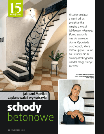 15 Z PRAKTYKI wykończenie wnętrz lat Współpracująca z nami od lat projektantka wnętrz z okazji jubileuszu Własnego Domu zaprosiła nas do swojego domu. Opowiada o schodach, które mimo upływu 10 lat nie straciły nic ze swojej atrakcyjności i nadal mogą służyć za wzór Tekst: Sylwia Makowska-Rzatkiewicz Zdjęcia: Sylwia Makowska-Rzatkiewicz, Tomasz Augustyn Jak pani Monika zaplanowała i wykończyła schody betonowe 36 Własny Dom 11/2013 wykończenie wnętrz z praktyki 1 1 sypialnia łazienka łazienka sypialnia sypialnia hol pom. gosp. hol sypialnia salon kuchnia pom. gosp. 1 Rzuty domu przed zmianami wprowadzonymi przez inwestorów. Zamkniętą klatkę schodową zmieniono na całkowicie otwarte schody zabiegowe. Zlikwidowano też wiatrołap, drzwi do kuchni oraz różnicę poziomów dzielącą salon i hol. Na poddaszu zrezygnowano ze ścianki wydzielającej jeden z pokoi, uzyskując w ten sposób otwartą na schody przestrzeń do pracy i wypoczynku. Wszystkie te zmiany miały na celu zintegrowanie przestrzeni mieszkalnej, która ma łączyć, a nie dzielić domowników 2 2 Układające się w wachlarz stopnie, aby były wygodne, musiały być odpowiednio szerokie. Najszerszy z nich ma 1,6 m. W miejscach, gdzie stopnie są proste, szerokość biegu wynosi 1 m 3-4 Głębokość stopni zmienia się. Na początku i na końcu schodów wynosi ona blisko 30 cm. Pozwala to na swobodne postawienie całej stopy. Na zakręcie stopnie zwężają się do 24 cm. Idąc środkiem biegu, może okazać się, że głębokość ta nie jest zbyt komfortowa na tym fragmencie schodów. Wystarczy jednak przesunąć się bliżej ściany, gdzie stopnie są znacznie głębsze Schody w centrum uwagi W takim dwukondygnacyjnym domu niezmiernie ważną rolę pełnią schody. Muszą bowiem w jak najwygodniejszy sposób łączyć obie części budynku. Dla pani Moniki, jako projektantki wnętrz, mają też olbrzymie znaczenie estetyczne. Dlatego od samego początku poświęciła im dużo uwagi. – Z funkcjonalnego punktu widzenia, gdybym dziś budowała dom i dysponowała odpowiednio dużą działką, pewnie zdecydowałabym się na parterówkę – stwierdza. – Schody, nawet te najbardziej komfortowe, zawsze są swego rodzaju barierą, którą trzeba pokonać. Dlatego na co dzień niezbyt często wchodzę na górę, zwłaszcza że wszystkie niezbędne rzeczy mam pod ręką na parterze – w kuchni, salonie, jadalni, łazience, gabinecie i sypialni. syp sypialnia sypialnia projekt typowy KB Projekt, arch. A. Barcentewicz K iedy Monika Nowak, dekoratorka wnętrz i właścicielka firmysypialniaDecoration z Wrocławia, postanowiła wspólnie z mężem wybudować dom, myślała przede wszystkim łazienka sypialnia o tym, aby stworzyć komfortowe miejsce do życia dla swojej rodziny. Dbała więc nie tylko o piękny wystrój, ale przede wszystkim o hol wygodę. Na działce sypialnia o powierzchni 950 m2 powstał dom z poddaszem użytkowym o powierzchni 210 m2. – Wybierając projekt domu, szukaliśmy kompromisu między wystarczająco dużą powierzchnią mieszkalną a na tyle zwartą bryłą budynku, by na działce dało się stworzyć w miarę przestronny ogród – opowiada inwestorka. – Z tego względu budynek z poddaszem użytkowym był dla nas optymalnym wyborem. Przy planowaniu układu funkcjonalnego wnętrz pani Monika szczególną uwagę zwracała na to, aby dom można było dostosowywać do zmieniających się potrzeb mieszkańców. – Na początku musiał być wygodny i bezpieczny dla małych dzieci – wyjaśnia. – Kiedy zaczęły dorastać, coraz bardziej potrzebują przestrzeni tylko dla siebie. Stąd pomysł, aby drugą kondygnację przeznaczyć dla nich, a naszą sypialnię zlokalizować na parterze. Przewidzieliśmy też możliwość stworzenia na górze drugiego mieszkania z odrębną kuchnią, gdyby w przyszłości pojawiła się taka konieczność. 3 4 11/2013 Własny Dom 37 syp salon Z PRAKTYKI wykończenie wnętrz 5 5 Salon z widokiem na schody – jego wystrój stwarza przyjemną, rodzinną atmosferę. Przykuwająca uwagę forma schodów stanowi efektowne dopełnienie całości Projektantka przyznaje jednak, że w domu parterowym brakowałoby jej walorów dekoracyjnych, jakimi mogą charakteryzować się dobrze zaplanowane schody. – Mogą być niezwykle efektownym, wręcz rzeźbiarskim elementem – podkreśla. – Jeśli będą odpowiednio zaplanowane i starannie wykończone, staną się ozdobą zarówno parteru, jak i piętra. Warto je więc wyeksponować. Zdecydowanie nie jestem zwolenniczką zamkniętych, ciasnych klatek schodowych ukrytych w jakimś zakamarku. Zmiany w projekcie 6 7 6-7 Otwarta część poddasza czyni tę kondygnację niezwykle przestronną. Wizualnej lekkości dodaje wnętrzu ażurowa balustrada. W tym domu przestrzeń komunikacyjna, taka jak schody czy hol, jest równie ceniona jak inne pomieszczenia mieszkalne i całkowicie się z nimi przenika Pani Monika i pan Krzysztof budowali dom na podstawie projektu typowego, na etapie adaptacji dokonali jednak kilku przeróbek układu wnętrz. Do najważniejszych z nich należały zmiany dotyczące schodów. Zamkniętą klatkę schodową z dwubiegowymi schodami zastąpiono otwartą przestrzenią z biegnącymi po łuku schodami zabiegowymi. – Od samego początku wiedziałam, jak powinny wyglądać schody w moim domu – zaznacza Monika Nowak. – Otwarcie klatki schodowej było więc sprawą priorytetową. Realizacja mojego pomysłu w ramach inaczej zaplanowanego projektu typowego nie była jednak prosta. Jedna ze ścian, na której opierają się schody, nie jest ścianą nośną. Co więcej, jest dość krótka. Aby poprowadzone po łuku schody nie były zbyt wąskie i strome, trzeba było „wyciągnąć” je o jeden stopień do przodu. Zastosowano też specjalne wzmocnienia. Zmieniono też układ ścian – m.in. zlikwidowano wiatrołap, a jeden z pokoi na poddaszu przekształcono w otwartą przestrzeń do