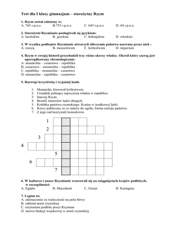 Test dla I klasy gimnazjum – staroŜytny Rzym 1. Rzym został załoŜony w: A. 765 r.p.n.e. B.753 r.p.n.e. C. 643 r.p.n.e. 2. StaroŜytni Rzymianie posługiwali się językiem: A. łacińskim B. greckim C. hebrajskim D. 44 r.p.n.e. D. włoskim 3. W wyniku podbojów Rzymianie utworzyli olbrzymie państwo nazwane przez nich : A. rzeszą B. mocarstwem C. królestwem D. imperium 4. Rzym w swojej historii przechodził trzy róŜne okresy władzy. Określ który szereg jest uporządkowany chronologicznie: A. monarchia – cesarstwo – republika B. cesarstwo – monarchia – republika C. republika – monarchia – cesarstwo D. monarchia – republika – cesarstwo 5. RozwiąŜ krzyŜówkę i wyjaśnij hasło 1. 2. 3. 4. 5. 6. 7. Monarcha, kierował królestwem. Urzędnik pełniący najwyŜszą władzę w republice. Inaczej Rzym. Bronili interesów ludzi ubogich. Kolebka państwa rzymskiego. Kraina w środkowej Italii. Rzecz publiczna, to co naleŜy do ogółu, forma ustroju państwa. Z jego rad korzystali konsulowie. 1 2 3 4 5 6 7 6. W kulturze i nauce Rzymianie wzorowali się na osiągnięciach krajów podbitych, w szczególności: A. Egiptu B. Macedonii C. Grecji D. Kartaginy 7. Legion to: A. odznaczenie za waleczność na polu bitwy B. oddział armii rzymskiej C. terytorium podbite przez Rzymian D. nazwa funkcji wojskowej w armii rzymskiej. 8. Największym wodzem Kartaginy był: A. Hannibal B. Spartakus C. Juliusz Cezar D. Brutus 9. Po objęciu władzy przez Oktawiana Augusta państwo rzymskie nazwano: A. cesarstwem B. królestwem C. monarchią D. republiką 10. Romanizacja to: A. podbicie innych ludów i przyłączenie do państwa rzymskiego B. wznoszenie budowli w Rzymie C. nauka języka łacińskiego D. przejęcie rzymskiej kultury i języka łacińskiego przez prowincje. 11. Rzymowi udało się poddać swojej władzy wszystkie ludy Italii poprzez: A. stosowanie terroru B. zawieranie z kaŜdym pokonanym krajem sojuszy na osobnych warunkach C. masową deportację ludności D. budowę wielkich obozów karnych. Przeczytaj tekst, a następnie odpowiedz na pytania. Autorem jest historyk grecki Polibiusz, Ŝyjący ok. 200 – 118 r. p.n.e. „ ... otóŜ konsulowie ... póki bawią w Rzymie, decydują o wszystkich sprawach publicznych. ... Inni urzędnicy, z wyjątkiem trybunów ludowych, są im podwładni i słuchają ich. ... TakŜe o wszystkie publiczne sprawy im wypada się troszczyć i zwoływać zgromadzenie ludowe, im stawiać wnioski, im wykonywać uchwały większości. ... Co tyczy się zbrojeń i w ogóle kierowania wyprawą, to mają oni niemal absolutną władzę ... Wolno im od sprzymierzeńców zaŜądać posiłków i zaciągać wojsko. ... Prócz tego mają prawo karania, spośród tych, którzy w polu stoją pod ich rozkazami. ... Składając muszą konsulowie przed ludem zdawać sprawę ze swej działalności ...” 12. Wszystkie urzędy w Rzymie były bezpłatne. Wśród urzędników najwyŜsi rangą byli dwaj konsulowie wybierani na rok. Wypisz z tekstu te sformułowania, które informują o: A. relacjach między konsulami a innymi urzędnikami, B. uprawnieniach konsulów w sprawach wewnętrznych, C. uprawnieniach dotyczących spraw wojskowych. A. B. C. 13. Aby poprawić zaopatrzenie miast w wodę Rzymianie budowali: A. studnie głębinowe B. kanały wodne C. zapory wodne D. akwedukty 14. Edykt to: A. tytuł urzędników w prowincjach rzymskich B. zwrócenie niewolnikowi wolności C. uchwała rzymskiego senatu D. rozporządzenie wydane przez cesarza 15. Cesarstwo zachodniorzymskie upadło po rozbiciu przez ludy barbarzyńskie w roku: A. 395 B. 476 C. 44 p.n.e. D. 173