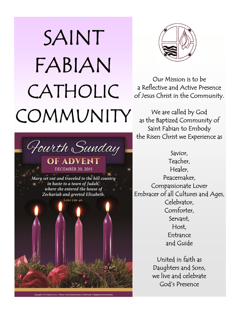 SAINT FABIAN CATHOLIC COMMUNITY Our Mission is to be a Reflective and Active Presence of Jesus Christ in the Community. We are called by God as the Baptized Community of Saint Fabian to Embody the Risen Christ we Experience as Savior, Teacher, Healer, Peacemaker, Compassionate Lover Embracer of all Cultures and Ages, Celebrator, Comforter, Servant, Host, Entrance and Guide United in faith as Daughters and Sons, we live and celebrate God’s Presence PAGE 2 FOURTH SUNDAY OF ADVENT DECEMBER 20, 2015 Here's some “last minute” Christmas gift ideas: COUPON COUPON GOOD FOR ONE HOUR OF MY TIME GOOD FOR ONE SMILE NO EXPIRATION DATE NO EXPIRATION DATE COUPON COUPON GOOD FOR 10 MINUTES OF UNINTERRUPTED LISTENING GOOD FOR A KIND WORD NO LIMIT NO EXPIRATION DATE COUPON COUPON GOOD FOR ONE APOLOGY GOOD FOR ONE HUG NO EXPIRATION DATE NO EXPIRATION DATE OR YOU CAN CREATE YOUR OWN COUPON THIS COUPON GOOD FOR THIS COUPON GOOD FOR THIS COUPON GOOD FOR THIS COUPON GOOD FOR Please be sure to note the special Christmas Mass schedule. Merry Christmas! May God bless you always and in all ways. PAGE 3 FOURTH SUNDAY OF ADVENT DECEMBER 20, 2015 READINGS FOR THIS WEEKEND FIRST READING: MICAH 5:1-4A GOSPEL: LUKE 1:39-45 Thus says the LORD: Mary set out You, Bethlehem-Ephrathah too small to be among the and traveled to the hill country in haste clans of Judah, from you shall come forth for me one who to a town of Judah, is to be ruler in Israel; whose origin is from of old, where she entered the house of Zechariah from ancient times. and greeted Elizabeth. Therefore the Lord will give them up, until the time When Elizabeth heard Mary’s greeting, when she who is to give birth has borne, and the rest of the infant leaped in her womb, his kindred shall return to the children of Israel. and Elizabeth, filled with the Holy Spirit, He shall stand firm and shepherd his flock cried out in a loud voice and said, by the strength of the LORD, “Blessed are you among women, in the majestic name of the LORD, his God; and blessed is the fruit of your womb. and they shall remain, for now his greatness And how does this happen to me, shall reach to the ends of the earth; that the mother of my Lord should come to me? he shall be peace. For at the moment the sound of your greeting reached my ears, SECOND READING: HEBREWS 10:5-10 the infant in my womb leaped for joy. Blessed are you who believed Brothers and sisters: that what was spoken to you by the Lord When Christ came into the world, he said: would be fulfilled.” “Sacrifice and offering you did not desire, but a body you prepared for me; in holocausts and sin offerings you took no delight. Then I said, ‘As is written of me in the scroll, behold, I come to do your will, O God.’“ First he says, “Sacrifices and offerings, holocausts and sin offerings, you neither desired nor delighted in.” These are offered according to the law. Then he says, “Behold, I come to do your will.” He takes away the first to establish the second. By this “will,” we have been consecrated through the offering of the body of Jesus Christ once for all. PAGE 4 FOURTH SUNDAY OF ADVENT ADORATION of the BLESSED SACRAMENT Come visit Jesus in the Chapel this Monday from: 12:00 Noon to 8:00 p.m. Benediction will be at 7:45 p.m. Jesus Himself is the greatest Christmas gift ever given. We wish all of you a very Blessed and Holy Christmas. May you know His Presence in a DECEMBER 20, 2015 TREASURES FROM OUR TRADITION Many of our most treasured traditions link the liturgy of the church with the hearth of the home. The food on the table at certain feasts and fasts helps to extend the mystery into everyday life. Tonight, for example, many families of Italian heritage, especially those with links to the south of Italy, will settle down to the “Feast of the Seven Fishes,” or La Vigilia. It is a command performance for the whole family, as the saying goes: Natale con I tuui, Pasqua conchi vuoi, or “Christmas with your family, Easter with whomever you wish.” Seven different fish, some say one for each day of Mary and Joseph’s journey to Bethlehem, others say one for each sacrament, or one for each day of creation, are served. Eel and shrimp, lobster and crab, calamari, pasta with clam sauce, flounder and hake all abound, but most especially baccala, dried salted cod. Why? Many say that it is a way to pay homage to the beasts of the stable who witnessed the holy birth and relinquished their manger to make way for God. Tonight, if someone asks you to “pass the shrimp,” you’ll be able to shed a little light on a menu that is a delicious treasure in our tradition! —Rev. James Field, Copyright © J. S. Paluch Co. The Parish Offices will be closed on Christmas Eve, Christmas Day, New Years Eve and New Years Day. READINGS FOR THE WEEK Monday: Sg 2:8-14 or Zep 3:14-18a; Ps 33:2-3, 11-12, 20-21; Lk 1:39-45 Tuesday: 1 Sm 1:24-28; 1 Sm 2:1, 4-8abcd; Lk 1:46-56 Wednesday: Mal 3:1-4, 23-34; Ps 25:4-5ab, 8-10, 14; Lk 1:57-66 Thursday: 2 Sm 7:1-5, 8b-12, 14a, 16; Ps 89:2-5, 27, 29; Lk 1:67-79 Friday: Vigil: Is 62:1-5; Ps 89:4-5, 16-17, 27, 29; Acts 13:16-17, 22-25; Mt 1:1-25 [18-25] Night: Is 9:1-6; Ps 96:1-3, 11-13; Ti 2:11-14; Lk 2:1-14 Dawn: Is 62:11-12; Ps 97:1, 6, 11-12; Ti 3:4-7; Lk 2:15-20 Day: Is 52:7-10; Ps 98:1-6; Heb 1:1-6; Jn 1:1-18 [1-5, 9-14] Saturday: Acts 6:8-10; 7:54-59; Ps 31:3cd-4, 6, 8ab, 16bc, 17; Mt 10:17-22 Sunday: Sir 3:2-6, 12-14 or 1 Sm 1:20-22, 24-28; Ps 128:1-5 or Ps 84:2-3, 5-6, 9-10; Col 3:12-21 [12-17] or 1 Jn 3:1-2, 21-24; Lk 2:41-52 O LORD of hosts, look down from heaven and see; take care of this vine, and protect what your right hand has planted. — Psalm 80:15–16 PAGE 5 T FOURTH SUNDAY OF ADVENT DECEMBER 20, 2015 herefore the Lord himself will give you this sign: the virgin shall conceive, and bear a son, and shall name him Emmanuel. - Isaiah 7 Fourth Week of Advent Daily Prayer This Week: The Fourth Sunday of Advent begins the last week of Advent, which ta