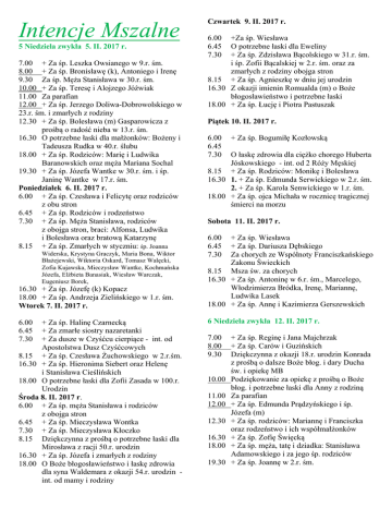 Intencje Mszalne 5 Niedziela zwykła 5. II. 2017 r. 7.00 + Za śp. Leszka Owsianego w 9.r. śm. 8.00 + Za śp. Bronisławę (k), Antoniego i Irenę 9.30 Za śp. Męża Stanisława w 30.r. śm. 10.00 + Za śp. Teresę i Alojzego Jóźwiak 11.00 Za parafian 12.00 + Za śp. Jerzego Doliwa-Dobrowolskiego w 23.r. śm. i zmarłych z rodziny 12.30 + Za śp. Bolesława (m) Gasparowicza z prośbą o radość nieba w 13.r. śm. 16.30 O potrzebne łaski dla małżonków: Bożeny i Tadeusza Rudka w 40.r. ślubu 18.00 + Za śp. Rodziców: Marię i Ludwika Baranowskich oraz męża Mariana Sochal 19.30 + Za śp. Józefa Wantke w 30.r. śm. i śp. Janinę Wantke w 17.r. śm. Poniedziałek 6. II. 2017 r. 6.00 + Za śp. Czesława i Felicytę oraz rodziców z obu stron 6.45 + Za śp. Rodziców i rodzeństwo 7.30 + Za śp. Męża Stanisława, rodziców z obojga stron, braci: Alfonsa, Ludwika i Bolesława oraz bratową Katarzynę 8.15 + Za śp. Zmarłych w styczniu: śp. Joanna Widerska, Krystyna Graczyk, Maria Bona, Wiktor Błażejewski, Wiktoria Oskard, Tomasz Walęcki, Zofia Kujawska, Mieczysław Wantke, Kochmańska Józefa, Elżbieta Banasiak, Wiesław Warczak, Eugeniusz Borek, 16.30 + Za śp. Józefę (k) Kopacz 18.00 + Za śp. Andrzeja Zielińskiego w 1.r. śm. Wtorek 7. II. 2017 r. 6.00 6.45 7.30 + Za śp. Halinę Czarnecką + Za zmarłe siostry nazaretanki + Za dusze w Czyśćcu cierpiące - int. od Apostolstwa Dusz Czyśćcowych 8.15 + Za śp. Czesława Żuchowskiego w 2.r.śm. 16.30 + Za śp. Hieronima Siebert oraz Helenę i Stanisława Cieślińskich 18.00 O potrzebne łaski dla Zofii Zasada w 100.r. Urodzin Środa 8. II. 2017 r. 6.00 + Za śp. męża Stanisława i rodziców z obojga stron 6.45 + Za śp. Mieczysława Wontka 7.30 + Za śp. Mieczysława Kłoczko 8.15 Dziękczynna z prośbą o potrzebne łaski dla Mirosława z racji 50.r. urodzin 16.30 + Za śp. Józefa i zmarłych z rodziny 18.00 O Boże błogosławieństwo i łaskę zdrowia dla syna Waldemara z okazji 54.r. urodzin int. od mamy i rodziny Czwartek 9. II. 2017 r. 6.00 6.45 7.30 +Za śp. Wiesława O potrzebne łaski dla Eweliny + Za śp. Zdzisława Bącolskiego w 31.r. śm. i śp. Zofii Bącalskiej w 2.r. śm. oraz za zmarłych z rodziny obojga stron 8.15 + Za śp. Agnieszkę w dniu jej urodzin 16.30 Z okazji imienin Romualda (m) o Boże błogosławieństwo i potrzebne łaski 18.00 + Za śp. Łucję i Piotra Pastuszak Piątek 10. II. 2017 r. 6.00 6.45 7.30 + Za śp. Bogumiłę Kozłowską O łaskę zdrowia dla ciężko chorego Huberta Jóskowskiego - int. od 2 Róży Męskiej 8.15 + Za śp. Rodziców: Monikę i Bolesława 16.30 1. + Za śp. Edmunda Serwickiego w 2.r. śm. 2. + Za śp. Karola Senwickiego w 1.r. śm. 18.00 + Za śp. ojca Michała w rocznicę tragicznej śmierci na morzu Sobota 11. II. 2017 r. 6.00 6.45 7.30 + Za śp. Wiesława + Za śp. Dariusza Dębskiego Za chorych ze Wspólnoty Franciszkańskiego Zakonu Świeckich 8.15 Msza św. za chorych 16.30 + Za śp. Antoninę w 6.r. śm., Marcelego, Włodzimierza Bródka, Irenę, Mariannę, Ludwika Lasek 18.00 + Za śp. Annę i Kazimierza Gerszewskich 6 Niedziela zwykła 12. II. 2017 r. 7.00 8.00 9.30 10.00 11.00 12.00 12.30 16.30 18.00 19.30 + Za śp. Reginę i Jana Majchrzak + Za śp. Carów i Guzińskich Dziękczynna z okazji 18.r. urodzin Konrada z prośbą o dalsze Boże błog. i dary Ducha św. i opiekę MB Podziękowanie za opiekę z prośbą o Boże błog. i potrzebne łaski dla Anny z rodziną Za parafian + Za śp. Edmunda Prądzyńskiego i śp. Józefa (m) + Za śp. rodziców: Mariannę i Franciszka oraz rodzeństwo i ich współmałżonków + Za śp. Zofię Święcką + Za śp. męża, tatę i dziadka: Stanisława Adamowskiego i za jego śp. rodziców + Za śp. Joannę w 2.r. śm.