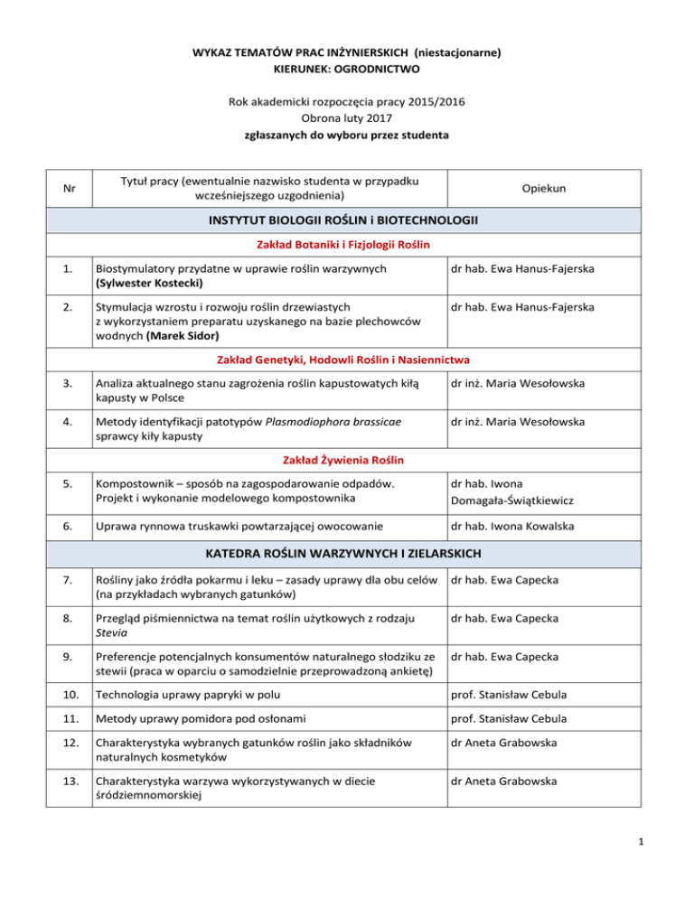 WYKAZ TEMATÓW PRAC INŻYNIERSKICH (niestacjonarne) KIERUNEK: OGRODNICTWO Rok akademicki rozpoczęcia pracy 2015/2016 Obrona luty 2017 zgłaszanych do wyboru przez studenta Nr Tytuł pracy (ewentualnie nazwisko studenta w przypadku wcześniejszego uzgodnienia) Opiekun INSTYTUT BIOLOGII ROŚLIN i BIOTECHNOLOGII Zakład Botaniki i Fizjologii Roślin 1. Biostymulatory przydatne w uprawie roślin warzywnych (Sylwester Kostecki) dr hab. Ewa Hanus-Fajerska 2. Stymulacja wzrostu i rozwoju roślin drzewiastych z wykorzystaniem preparatu uzyskanego na bazie plechowców wodnych (Marek Sidor) dr hab. Ewa Hanus-Fajerska Zakład Genetyki, Hodowli Roślin i Nasiennictwa 3. Analiza aktualnego stanu zagrożenia roślin kapustowatych kiłą kapusty w Polsce dr inż. Maria Wesołowska 4. Metody identyfikacji patotypów Plasmodiophora brassicae sprawcy kiły kapusty dr inż. Maria Wesołowska Zakład Żywienia Roślin 5. Kompostownik – sposób na zagospodarowanie odpadów. Projekt i wykonanie modelowego kompostownika dr hab. Iwona Domagała-Świątkiewicz 6. Uprawa rynnowa truskawki powtarzającej owocowanie dr hab. Iwona Kowalska KATEDRA ROŚLIN WARZYWNYCH I ZIELARSKICH 7. Rośliny jako źródła pokarmu i leku – zasady uprawy dla obu celów (na przykładach wybranych gatunków) dr hab. Ewa Capecka 8. Przegląd piśmiennictwa na temat roślin użytkowych z rodzaju Stevia dr hab. Ewa Capecka 9. Preferencje potencjalnych konsumentów naturalnego słodziku ze stewii (praca w oparciu o samodzielnie przeprowadzoną ankietę) dr hab. Ewa Capecka 10. Technologia uprawy papryki w polu prof. Stanisław Cebula 11. Metody uprawy pomidora pod osłonami prof. Stanisław Cebula 12. Charakterystyka wybranych gatunków roślin jako składników naturalnych kosmetyków dr Aneta Grabowska 13. Charakterystyka warzywa wykorzystywanych w diecie śródziemnomorskiej dr Aneta Grabowska 1 Nr Tytuł pracy (ewentualnie nazwisko studenta w przypadku wcześniejszego uzgodnienia) Opiekun 14. Rośliny wykorzystywane w leczeniu alergii skórnych dr Aneta Grabowska 15. Wykorzystanie roślin zielarskich i warzywnych w hortiterapii dr Aneta Grabowska 16. Układ i dobór warzyw i ziół w przydomowych ogrodach ozdobnych dr Elżbieta Jędrszczyk 17. Rośliny przyprawowe we współczesnych ogrodach ziołowych dr Elżbieta Jędrszczyk 18. Nowoczesna uprawa ogórka gruntowego prof. Edward Kunicki 19. Agrotechnika zimujących warzyw cebulowych prof. Edward Kunicki 20. Metody szczepienia warzyw prof. Edward Kunicki 21. Rola kapitału finansowego w zmianach w ogrodnictwie dr Janina Marzec 22. Nowoczesne tunele foliowe – budowa, wyposażenie i zagospodarowanie dr hab. Piotr Siwek, prof. UR 23. Aktualny stan ogrodnictwa ekologicznego w Polsce dr hab. Piotr Siwek, prof. UR 24. Charakterystyka wybranych gospodarstw ekologicznych w Małopolsce dr hab. Piotr Siwek, prof. UR KATEDRA OCHRONY ROŚLIN 25. Szkodniki kosaćców i ich zwalczanie na kolekcji Wydziału Biotechnologii i Ogrodnictwa dr hab. Elżbieta Wojciechowicz-Żytko 26. Phyllonorycter robiniella i Parectopa robiniella – szkodniki minujące robinii akacjowej na terenie Krakowa dr hab. Elżbieta Wojciechowicz-Żytko 27. Owady drapieżne ograniczające populacje mszyc dr hab. Elżbieta Wojciechowicz-Żytko 28. Atrakcyjność kwiatów dla owadów pożytecznych dr hab. Elżbieta Wojciechowicz-Żytko 29. Ważniejsze szkodniki kukurydzy i metody ich zwalczania dr hab. Elżbieta Wojciechowicz-Żytko 30. Projekt ochrony borówki amerykańskiej przed szkodnikami dr hab. Elżbieta Wojciechowicz-Żytko 31. Najważniejsze szkodniki marchwi Daucus carota i możliwość ograniczania ich liczebności przez zastosowanie uprawy współrzędnej dr hab. Beata Jankowska 32. Uprawa współrzędna jako metoda ograniczenia liczebności szkodników warzyw kapustowatych dr hab. Beata Jankowska 33. Skuteczność opryskiwania wyciągami roślinnymi w obniżaniu liczebności fitofagów żerujących na warzywach kapustowatych dr hab. Beata Jankowska 34. Mszyca kapuściana Brevicoryne brassicae i owady pożyteczne w naturalny sposób ograniczające jej liczebność dr hab. Beata Jankowska 2 Nr Tytuł pracy (ewentualnie nazwisko studenta w przypadku wcześniejszego uzgodnienia) Opiekun 35. Szkodniki róży z rzędu błonkoskrzydłe Hymenoptera i ich wpływ na dr hab. Beata Jankowska obniżenie jej walorów dekoracyjnych 36. Szkodniki występujące na plantacjach wierzby energetycznej dr hab. Beata Jankowska 37. Zdrowotność ziół uprawianych w ogrodach przydomowych i na plantacjach produkcyjnych prof. dr hab. Maria Kowalik 38. Czynniki obniżające walory dekoracyjne kosaćców Iris sp. prof. dr hab. Maria Kowalik 39. Możliwości biologicznej ochrony w uprawie pomidora dr hab. Maria Pobożniak 40. Możliwości biologicznej ochrony w sadach jabłoniowych dr hab. Maria Pobożniak 41. Możliwość wykorzystania bioinsektycydów w ochronie przed szkodnikami dr hab. Maria Pobożniak 42. Ochrona ziół z rodziny Apiaceae w uprawach ekologicznych dr hab. Jacek Nawrocki 43. Ochrona ziół z rodziny Lamiaceae w uprawach ekologicznych dr hab. Jacek Nawrocki 44. Fuzariozy warzyw cebulowych, ochrona przed nimi dr hab. Jacek Nawrocki 45. Preparaty biotechniczne w ochronie warzyw psiankowatych dr hab. Jacek Nawrocki 46. Choroby pozbiorcze marchwi i ograniczanie ich szkodliwości dr hab. Jacek Nawrocki KATEDRA DENDROLOGII I ARCHITEKTURY KRAJOBRAZU 47. Projekt koncepcyjny zagospodarowania terenu wokół obiektów sakralnej architektury drewnianej w wybranej miejscowości dr Magdalena Kulig 48. Projekt koncepcyjny zagospodarowania terenu wokół obiektów sakralnej architektury drewnianej w wybranej miejscowości dr Magdalena Kulig 49. Ocena dendroflory ciągów komunikacyjnych Krakowa, pod kątem pielęgnacji i norm szkółkarskich dr hab. inż. Piotr Muras, prof. UR 50. Ocena i rewitalizacja dendroflory parku pałacowego w Pszczynie dr hab. inż. Piotr Muras, prof. UR KATEDRA ROŚLIN OZDOBNYCH 51. Dydaktyczna kolekcja odmian D