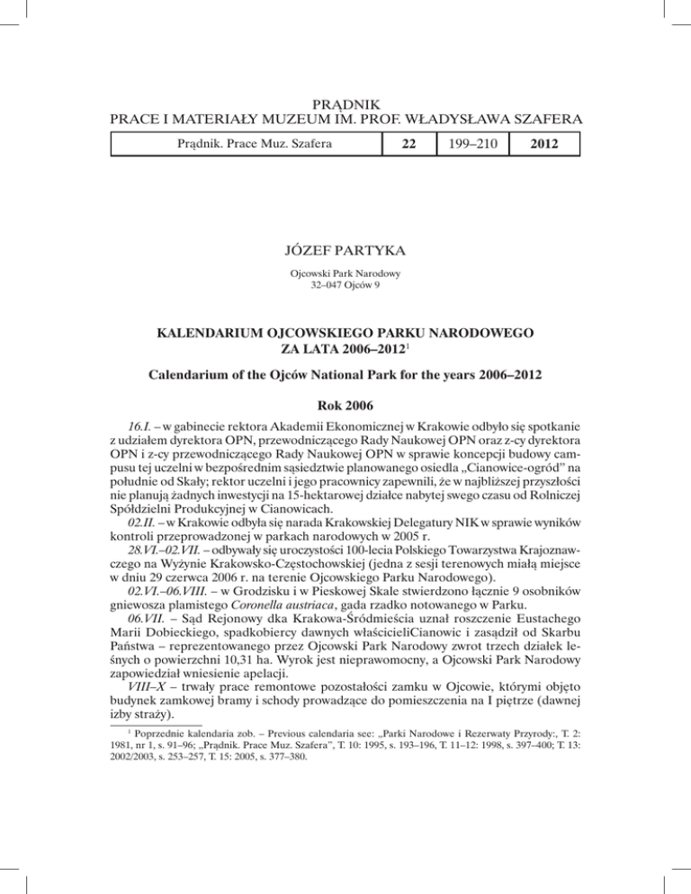 PRĄDNIK PRACE I MATERIAŁY MUZEUM IM. PROF. WŁADYSŁAWA SZAFERA Prądnik. Prace Muz. Szafera 22 199–210 2012 Józef Partyka Ojcowski Park Narodowy 32–047 Ojców 9 Kalendarium Ojcowskiego Parku Narodowego za lata 2006–20121 Calendarium of the Ojców National Park for the years 2006–2012 Rok 2006 16.I. – w gabinecie rektora Akademii Ekonomicznej w Krakowie odbyło się spotkanie z udziałem dyrektora OPN, przewodniczącego Rady Naukowej OPN oraz z-cy dyrektora OPN i z-cy przewodniczącego Rady Naukowej OPN w sprawie koncepcji budowy campusu tej uczelni w bezpośrednim sąsiedztwie planowanego osiedla „Cianowice-ogród” na południe od Skały; rektor uczelni i jego pracownicy zapewnili, że w najbliższej przyszłości nie planują żadnych inwestycji na 15-hektarowej działce nabytej swego czasu od Rolniczej Spółdzielni Produkcyjnej w Cianowicach. 02.II. – w Krakowie odbyła się narada Krakowskiej Delegatury NIK w sprawie wyników kontroli przeprowadzonej w parkach narodowych w 2005 r. 28.VI.–02.VII. – odbywały się uroczystości 100-lecia Polskiego Towarzystwa Krajoznawczego na Wyżynie Krakowsko-Częstochowskiej (jedna z sesji terenowych miałą miejsce w dniu 29 czerwca 2006 r. na terenie Ojcowskiego Parku Narodowego). 02.VI.–06.VIII. – w Grodzisku i w Pieskowej Skale stwierdzono łącznie 9 osobników gniewosza plamistego Coronella austriaca, gada rzadko notowanego w Parku. 06.VII. – Sąd Rejonowy dka Krakowa-Śródmieścia uznał roszczenie Eustachego Marii Dobieckiego, spadkobiercy dawnych właścicieliCianowic i zasądził od Skarbu Państwa – reprezentowanego przez Ojcowski Park Narodowy zwrot trzech działek leśnych o powierzchni 10,31 ha. Wyrok jest nieprawomocny, a Ojcowski Park Narodowy zapowiedział wniesienie apelacji. VIII–X – trwały prace remontowe pozostałości zamku w Ojcowie, którymi objęto budynek zamkowej bramy i schody prowadzące do pomieszczenia na I piętrze (dawnej izby straży). 1 Poprzednie kalendaria zob. – Previous calendaria see: „Parki Narodowe i Rezerwaty Przyrody:, T. 2: 1981, nr 1, s. 91–96; „Prądnik. Prace Muz. Szafera”, T. 10: 1995, s. 193–196, T. 11–12: 1998, s. 397–400; T. 13: 2002/2003, s. 253–257, T. 15: 2005, s. 377–380. 200 J. Partyka VIII–IX – na zamku w Ojcowie trwały badania archeologiczne rozpoczęte przez Instytut Archeologii UJ. Był to pierwszy sezon badań prowadzonych na dziedzińcu zamku w pobliżu murów obronnych i w sąsiedztwie zamkowej studni. 09.IX. – w Grodzisku otwarto ścieżkę dydaktyczną wiodącą od XVII-wiecznego kościoła do skrzyżowania dróg przy skale Skamieniały Wędrowiec. 28.IX. – w Starostwie Powiatowym w Krakowie odbyły się rozmowy na temat koncepcji budowy drogi obwodnicowej z Sąspowa do Sułoszowej przez przysiółek Bukowiec. Brakujący 3-km odcinek drogi mógłby ograniczyć ruch tranzytowy dnem doliny Prądnika od Pieskowej Skały do Grodziska; dyskusje na ten temat trwają już ponad 30 lat. 10–11.X. – odbyła się sesja jubileuszowa z okazji 50-lecia Ojcowskiego Parku Narodowego, z udziałem ponad 100 osób, połączona z wydaniem monografii archeologicznej okolic Ojcowa pt.: „Jura Ojcowska w pradziejach i w początkach państwa polskiego” pod red. Jacka Lecha i Józefa Partyki. 12.X. – zmarła mgr Jadwiga Krupińska (1920–2006), historyk sztuki i kustosz zamku w Pieskowej Skale w latach 1968–1988. 18.X. – Minister Środowiska pismem z dnia 18 października 2006 r. znak: DLOPiKpn-4102-287/06/sj pozytywnie zaopiniował wniosek Ojcowskiego Parku Narodowego z dnia 10 kwietnia 2006 r. (znak: IR-200/kan/1/06) w sprawie wyrażenia zgody na użyczenie na okres 40 lat (tj. do 2046 roku) Urzędowi Miasta i Gminy Skała części działki nr 39/2 o powierzchni 0,10215 ha we wsi Ojców z przeznaczeniem na budowę oczyszczalni ścieków; działka jest usytuowana poniżej stawów pstrągowych, po prawej stronie potoku Prądnik, mniej więcej na przeciwko nieistniejącej dawnej willi „Pod Różą” (rozebranej w 1979 r.). 29.XI. – odbyła się rozprawa wodno-prawna w sprawie remontu budynku „Pod Łokietkiem” i jego adaptacji na cele ekspozycyjne. VII–VIII i XI – na drodze w Pieskowej Skale zginęły trzy bobry w wyniku kolizji z samochodami; zanikło stanowisko bobrów przy stawie w Sułoszowej. 19.XII. – odbyło się posiedzenie Rady Naukowej OPN, na którym dyskutowano m.in. wniosek prywatnej osoby dot. wykupu pozostałości zamku w Ojcowie oraz wniosek właściciela gruntów na tzw. Parnasie w Pieskowej Skale, gdzie proponuje się budowę ekskluzywnych rezydencji pod nazwą „ośrodka odnowy biologicznej dla osób starszych” i „wiejskich chat”; podobne spotkanie odbyło się w dyrekcji Parku w dniu 19 czerwca 2000 r., kiedy również zgłaszano propozycję zagospodarowania wzgórza Parnas w Sułoszowej przez budowę hotelu na około 100 miejsc, „świeckich eremów”, centralnej biblioteki jurajskiej i centralnego muzeum jurajskiego oraz innych pomieszczeń przeznaczonych dla celów logistycznych planowanego zespołu. XII. – został ukończony projekt remontu i adaptacji budynku „Pod Łokietkiem” na cele dydaktyczno-muzealne Ojcowskiego Parku Narodowego. 2007 02.I. – podpisano umowę z nowym ajentem na wynajem kompleksu turystycznego „Zajazd” na Złotej Górze na okres 10 lat; w drodze przetargu nowymi użytkownikami „Zajazdu” zostali Grzegorz Bosak i Ryszard Piotr Bosak z Ojcowa. 18.I. – w nocy z 18 na 19 stycznia nad Ojcowem przeszła burza z wyładowaniami atmosferycznymi; dwie pierwsze dekady stycznia były wyjątkowo ciepłe, średnia temperatura dobowa za ten okres wynosiła 4,0°C, zaś dla całego miesiąca stycznia 2,4°C. Kalendarium Ojcowskiego Parku Narodowego za lata 2006–2012 201 28.I. – zmarł mgr Andrzej Krupiński (1920–2007), dyrektor Zamku Pieskowa Skała w latach 1968–1988. 01.II. – z dniem 1 lutego 2007 r. w Ojcowie zamknięto definitywnie Urząd Pocztow