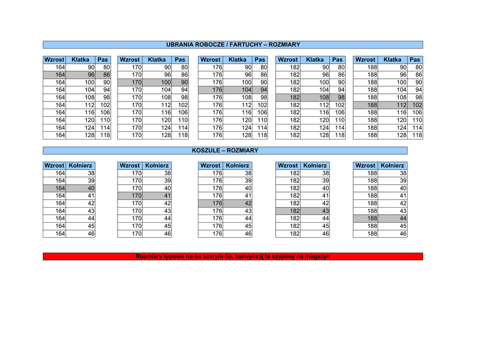 UBRANIA ROBOCZE / FARTUCHY – ROZMIARY Wzrost 164 164 164 164 164 164 164 164 164 164 Klatka 90 96 100 104 108 112 116 120 124 128 Pas 80 86 90 94 98 102 106 110 114 118 Wzrost 170 170 170 170 170 170 170 170 170 170 Klatka Pas 90 80 96 86 100 90 104 94 108 98 112 102 116 106 120 110 124 114 128 118 Wzrost 176 176 176 176 176 176 176 176 176 176 Klatka 90 96 100 104 108 112 116 120 124 128 Pas 80 86 90 94 98 102 106 110 114 118 Wzrost 182 182 182 182 182 182 182 182 182 182 Klatka 90 96 100 104 108 112 116 120 124 128 Pas 80 86 90 94 98 102 106 110 114 118 Wzrost 188 188 188 188 188 188 188 188 188 188 Klatka 90 96 100 104 108 112 116 120 124 128 KOSZULE – ROZMIARY Wzrost Kołnierz 164 38 164 39 164 40 164 41 164 42 164 43 164 44 164 45 164 46 Wzrost Kołnierz 170 38 170 39 170 40 170 41 170 42 170 43 170 44 170 45 170 46 Wzrost Kołnierz 176 38 176 39 176 40 176 41 176 42 176 43 176 44 176 45 176 46 Wzrost Kołnierz 182 38 182 39 182 40 182 41 182 42 182 43 182 44 182 45 182 46 Rozmiary typowe na na szarym tle, zazwyczaj te szyjemy na magazyn Wzrost Kołnierz 188 38 188 39 188 40 188 41 188 42 188 43 188 44 188 45 188 46 Pas 80 86 90 94 98 102 106 110 114 118
