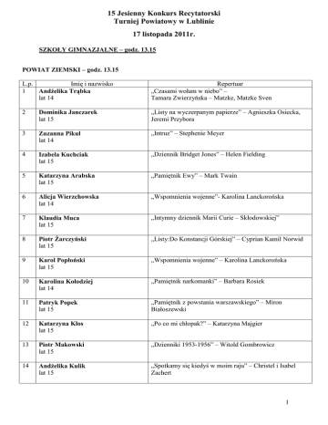 15 Jesienny Konkurs Recytatorski Turniej Powiatowy w Lublinie 17 listopada 2011r. SZKOŁY GIMNAZJALNE – godz. 13.15 POWIAT ZIEMSKI – godz. 13.15 L.p. Imię i nazwisko 1 AndŜelika Trąbka lat 14 Repertuar „Czasami wołam w niebo” – Tamara Zwierzyńska – Matzke, Matzke Sven 2 Dominika Janczarek lat 15 „Listy na wyczerpanym papierze” – Agnieszka Osiecka, Jeremi Przybora 3 Zuzanna Pikul lat 14 „Intruz” – Stephenie Meyer 4 Izabela Kuchciak lat 15 „Dziennik Bridget Jones” – Helen Fielding 5 Katarzyna Arabska lat 15 „Pamiętnik Ewy” – Mark Twain 6 Alicja Wierzchowska lat 14 „Wspomnienia wojenne”- Karolina Lanckorońska 7 Klaudia Muca lat 15 „Intymny dziennik Marii Curie – Skłodowskiej” 8 Piotr śarczyński lat 15 „Listy:Do Konstancji Górskiej” – Cyprian Kamil Norwid 9 Karol Popłoński lat 15 „Wspomnienia wojenne” – Karolina Lanckorońska 10 Karolina Kołodziej lat 14 „Pamiętnik narkomanki” – Barbara Rosiek 11 Patryk Popek lat 15 „Pamiętnik z powstania warszawskiego” – Miron Białoszewski 12 Katarzyna Kłos lat 15 „Po co mi chłopak?” – Katarzyna Majgier 13 Piotr Makowski lat 15 „Dzienniki 1953-1956” – Witold Gombrowicz 14 AndŜelika Kulik lat 15 „Spotkamy się kiedyś w moim raju” – Christel i Isabel Zachert 1 15 Jesienny Konkurs Recytatorski Turniej Powiatowy w Lublinie 17 listopada 2011r. 15 Natalia Guzorczuk lat 14 „Pollyanna dorasta” – Eleanor Porter 16 Karolina Łapanowska lat 15 „Okno” - Marek Hłasko 17 Katarzyna Kawałek lat 15 „Dziewczynka w zielonym sweterku” –Krystyna Chiger, Daniel Paisner 18 Klaudia Wilkołek lat 15 „Wiek Ŝelaza” – John Maxwell Coetzee 19 Adrianna Arent lat 15 „Dziewczynka w zielonym sweterku” – Krystyna Chiger POWIAT GRODZKI – godz. 14.20 L.p. Imię i nazwisko 1 Anastazja Zaremba lat 13 Repertuar „Maria Skłodowska – Curie” – Olgierd Wołczek 2 Kinga Iwaniuk lat 15 „Wojenne wspomnienia Ireny Pełczyńskiej – Paszkiewicz” – I. Pełczyńska - Paszkiewicz 3 Julia Balcerek lat 15 „Opowieść dla przyjaciela” – Halina Poświatowska 4 Anna Laskowska lat 13 „Janusz Korczak” – Hanna Mortkowicz -Oksakowa 5 Bartłomiej Dziadosz lat 14 „Dzienniki” – Witold Gombrowicz 6 Julia Majczyna lat 15 „Z Syberii na Podlasie” – Wanda Woźniak 7 Sylwia Bryła lat 14 „Sado” – Andrzej Stasiuk 8 Aleksandra śukowska lat 14 „Wspomnienia wojenne” – Karolina Lanckorońska 9 Barbara Bogdańska lat 14 „Wiosna 1941”- Ida Fink 10 Karina Gała lat13 „Ziele na kraterze”- Melchior Wańkowicz 2 15 Jesienny Konkurs Recytatorski Turniej Powiatowy w Lublinie 17 listopada 2011r. 11 Kamila Godlewska lat 14 „Pamiętnik narkomanki” – Barbara Rosiek 12 Wojciech Piotrowski lat 13 „Pamiętnik Dawida Rubinowicza. Reszta nie jest milczeniem.”- Dawid Rubinowicz 13 Cezary Papiewski lat 15 „Ja, Baltazar” – Sławomir MroŜek 14 Angela Kormańska lat 15 „Ania z Szumiących Topoli” – Lucy Maud Montgomery 15 Marlena Oleksiejuk lat 13 „Pamiętniki wampirów”- Lisa Jane Smith 16 Małgorzata Drabko lat 14 „I boję się snów” – Wanda Półtawska 17 Anna Mierzwa lat 15 „Ania z Szumiących Topoli” – Lucy Maud Montgomery 18 Bartosz Panek lat 13 „ReportaŜ „Zaproszenie do Gruzji” z tomu „Kirgiz schodzi z konia” – Ryszard Kapuściński 19 Zuzanna Janiszewska lat16 Fragment Listu Marii Kuncewiczowej do Jerzego Kuncewicza (Listnr 13) 20 Kaja Grzybowska lat 15 „Nauczyciele” Sławomir MroŜek 3